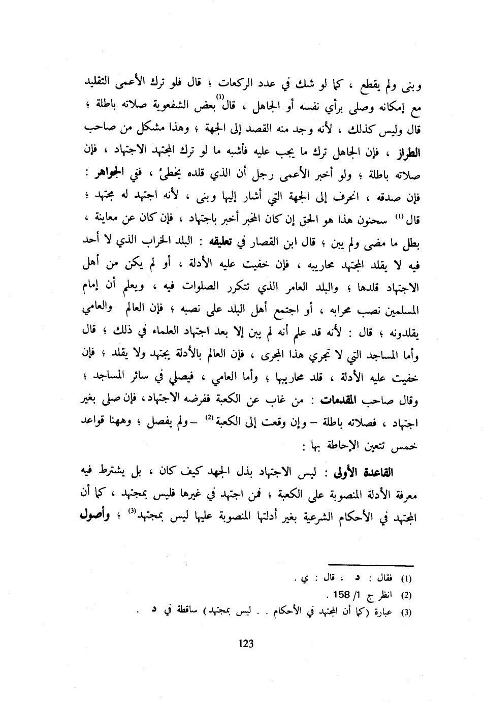 وَبَنَى وَلَمْ يَقْطَعْ كَمَا لَوْ شَكَّ فِي عَدَدِ الرَّكَعَاتِ قَالَ فَلَوْ تَرَكَ الْأَعْمَى التَّقْلِيدَ مَعَ إِمْكَانِهِ وَصَلَّى بِرَأْيِ نَفْسِهِ أَوِ الْجَاهِلِ قَالَ بعض الشفعوية صَلَاتُهُ بَاطِلَةٌ قَالَ وَلَيْسَ كَذَلِكَ لِأَنَّهُ وَجَدَ مِنْهُ الْقَصْدَ إِلَى الْجِهَةِ وَهَذَا مُشْكِلٌ مِنْ صَاحب الطّراز فَإِن الْجَاهِل ترك مَا يجب عَلَيْهِ فَأَشْبَهَ مَا لَوْ تَرَكَ الْمُجْتَهِدُ الِاجْتِهَادَ فَإِنَّ صَلَاتَهُ بَاطِلَةٌ وَلَوْ أَخْبَرَ الْأَعْمَى رَجُلٌ أَن الَّذِي قَلّدهُ يُخطئ فَفِي الْجَوَاهِرِ فَإِنْ صَدَّقَهُ انْحَرَفَ إِلَى الْجِهَةِ الَّتِي أَشَارَ إِلَيْهَا وَبَنَى لِأَنَّهُ اجْتَهَدَ لَهُ مُجْتَهِدٌ قَالَ سَحْنُونٌ هَذَا هُوَ الْحَقُّ إِنْ كَانَ الْمُخْبِرُ أَخْبَرَ بِاجْتِهَادٍ فَإِنْ كَانَ عَنْ مُعَايَنَةٍ بَطَلَ مَا مَضَى وَلَمْ يَبْنِ قَالَ ابْنُ الْقَصَّارِ فِي تَعْلِيقِهِ الْبَلَدُ الْخَرَابُ الَّذِي لَا أحد فِيهِ لَا يُقَلّد الْمُجْتَهد محاربيه فَإِنْ خَفِيَتْ عَلَيْهِ الْأَدِلَّةُ أَوْ لَمْ يَكُنْ مِنْ أَهْلِ الِاجْتِهَادِ قَلَّدَهَا وَالْبَلَدُ الْعَامِرُ الَّذِي تَتَكَرَّرُ الصَّلَوَاتُ فِيهِ وَيَعْلَمُ أَنَّ إِمَامَ الْمُسْلِمِينَ نَصَبَ مِحْرَابَهُ أَوِ اجْتَمَعَ أَهْلُ الْبَلَدِ عَلَى نَصْبِهِ فَإِنَّ الْعَالِمَ وَالْعَامِّيَّ يُقَلِّدُونَهُ قَالَ لِأَنَّهُ قَدْ عَلِمَ أَنَّهُ لَمْ يَبْنِ إِلَّا بَعْدَ اجْتِهَادِ الْعُلَمَاءِ فِي ذَلِكَ قَالَ وَأَمَّا الْمَسَاجِدُ الَّتِي لَا تجْرِي هَذَا الْمَجْرَى فَإِنَّ الْعَالِمَ بِالْأَدِلَّةِ يَجْتَهِدُ وَلَا يُقَلِّدُ فَإِنْ خَفِيَتْ عَلَيْهِ الْأَدِلَّةُ قَلَّدَ مَحَارِيبَهَا وَأَمَّا الْعَامِّيُّ فَيُصَلِّي فِي سَائِرِ الْمَسَاجِدِ وَقَالَ صَاحِبُ الْمُقَدِّمَاتِ مَنْ غَابَ عَنِ الْكَعْبَةِ فَفَرْضُهُ الِاجْتِهَادُ فَإِنْ صَلَّى بِغَيْرِ اجْتِهَادٍ فَصَلَاتُهُ بَاطِلَةٌ وَإِن وَقعت إِلَى الْكَعْبَة وَلم يفصل وَهَهُنَا قَوَاعِد خمس تَتَعَيَّنُ الْإِحَاطَةُ بِهَا الْقَاعِدَةُ الْأُولَى لَيْسَ الِاجْتِهَادُ بَذْلُ الْجُهْدِ كَيْفَ كَانَ بَلْ يُشْتَرَطُ فِيهِ مَعْرِفَةُ الْأَدِلَّةِ الْمَنْصُوبَةِ عَلَى الْكَعْبَةِ فَمَنِ اجْتَهَدَ فِي غَيْرِهَا فَلَيْسَ بِمُجْتَهِدٍ كَمَا أَنَّ الْمُجْتَهِدَ فِي الْأَحْكَامِ الشَّرْعِيَّةِ بِغَيْرِ أَدِلَّتِهَا الْمَنْصُوبَةِ عَلَيْهَا لَيْسَ بمجتهد وأصول