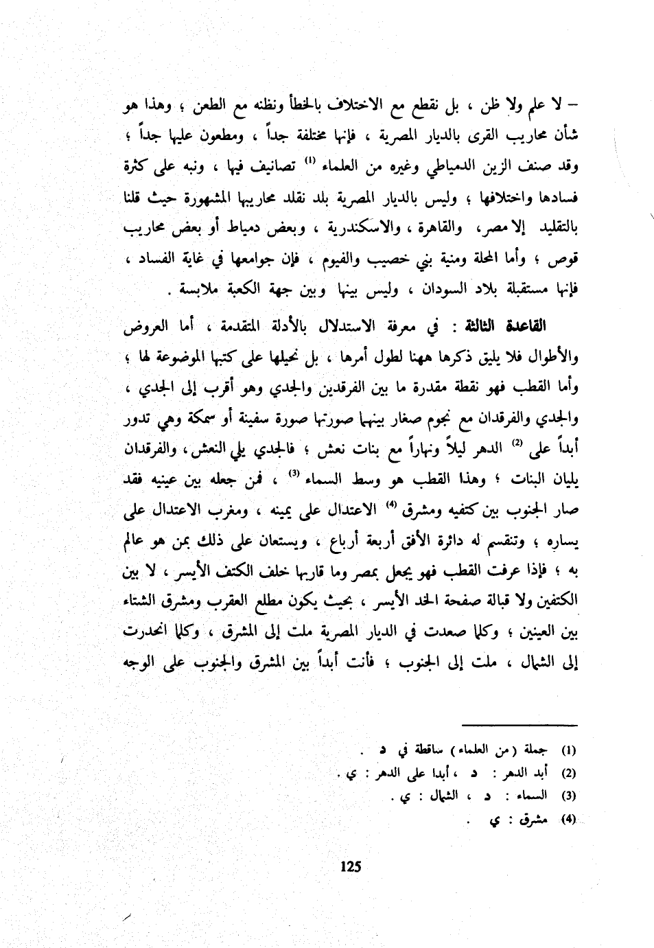 لَا عِلْمَ وَلَا ظَنَّ بَلْ نَقْطَعُ مَعَ الِاخْتِلَافِ بِالْخَطَأِ وَنَظُنُّهُ مَعَ الطَّعْنِ وَهَذَا هُوَ شَأْنُ مَحَارِيبِ الْقُرَى بِالدِّيَارِ الْمِصْرِيَّةِ فَإِنَّهَا مُخْتَلِفَةٌ جِدًّا وَمَطْعُونٌ عَلَيْهَا جِدًّا وَقَدْ صَنَّفَ الزَّيْنُ الدُّمْيَاطِيُّ وَغَيْرُهُ مِنَ الْعُلَمَاءِ تَصَانِيفَ فِيهَا وَنَبَّهَ عَلَى كَثْرَةِ فَسَادِهَا وَاخْتِلَافِهَا وَلَيْسَ بِالدِّيَارِ الْمِصْرِيَّةِ بَلَدٌ نُقَلِّدُ مَحَارِيبَهَا الْمَشْهُورَةَ حَيْثُ قُلْنَا بِالتَّقْلِيدِ إِلَّا مصر والقاهرة والاسكندرية وَبَعض دمياط أَو بعض محاريب قوص وَأما الْمحلة ومنية بني خَصِيبٍ وَالْفَيُّومُ فَإِنَّ جَوَامِعَهَا فِي غَايَةِ الْفَسَادِ فَإِنَّهَا مُسْتَقْبِلَةٌ بِلَادَ السُّودَانِ وَلَيْسَ بَيْنَهَا وَبَيْنَ جِهَةِ الْكَعْبَةِ مُلَابَسَةٌ الْقَاعِدَةُ الثَّالِثَةُ فِي مَعْرِفَةِ الِاسْتِدْلَالِ بِالْأَدِلَّةِ الْمُتَقَدِّمَةِ أَمَّا الْعُرُوضُ وَالْأَطْوَالُ فَلَا يَلِيق ذكرهَا هَهُنَا لِطُولِ أَمْرِهَا بَلْ نُحِيلُهَا عَلَى كُتُبِهَا الْمَوْضُوعَةِ لَهَا وَأَمَّا الْقُطْبُ فَهُوَ نُقْطَةٌ مُقَدَّرَةٌ مَا بَين الفرقدين والجدي وَهُوَ أقرب إِلَى الجدي وَالْجَدْيُ وَالْفَرْقَدَانِ مَعَ نُجُومٍ صِغَارٍ بَيْنَهُمَا صُورَتُهَا صُورَة سفينة أَو سَمَكَة وَهِي تَدور أبدا على الدَّهْرِ لَيْلًا وَنَهَارًا مَعَ بَنَاتِ نَعْشٍ فَالْجَدْيُ يَلِي النَّعْشَ وَالْفَرْقَدَانِ يَلِيَانِ الْبَنَاتَ وَهَذَا الْقُطْبُ هُوَ وَسَطُ السَّمَاءِ فَمَنْ جَعَلَهُ بَيْنَ عَيْنَيْهِ فَقَدْ صَارَ الْجَنُوبُ بَيْنَ كَتِفَيْهِ وَمَشْرِقُ الِاعْتِدَالِ عَلَى يَمِينِهِ وَمَغْرِبُ الِاعْتِدَالِ عَلَى يَسَارِهِ وَتَنْقَسِمُ لَهُ دَائِرَةُ الْأُفُقِ أَرْبَعَةَ أَرْبَاعٍ وَيُسْتَعَانُ عَلَى ذَلِكَ بِمَنْ هُوَ عَالِمٌ بِهِ فَإِذَا عَرَفْتَ الْقُطْبَ فَهُوَ يُجْعَلُ بِمِصْرَ وَمَا قَارَبَهَا خَلْفَ الْكَتِفِ الْأَيْسَرِ لَا بَيْنَ الْكَتِفَيْنِ وَلَا قُبَالَةَ صَفْحَةِ الْخَدِّ الْأَيْسَرِ بِحَيْثُ يَكُونُ مَطْلِعُ الْعَقْرَبِ وَمَشْرِقُ الشِّتَاءِ بَيْنَ الْعَيْنَيْنِ وَكُلَّمَا صَعَّدْتَ فِي الدِّيَارِ الْمِصْرِيَّةِ مِلْتَ إِلَى الْمَشْرِقِ وَكُلَّمَا انْحَدَرْتَ إِلَى الشِّمَالِ مِلْتَ إِلَى الْجَنُوبِ فَأَنْتَ أَبَدًا بَيْنَ الْمَشْرِقِ وَالْجَنُوبِ عَلَى الْوَجْهِ