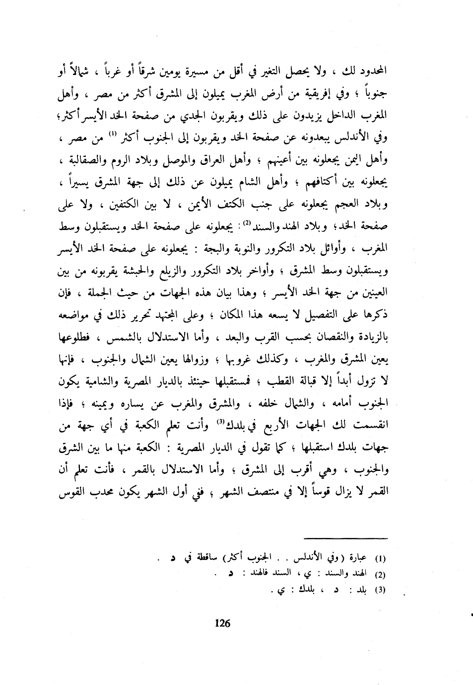 الْمَحْدُودِ لَكَ وَلَا يَحْصُلُ التَّغَيُّرُ فِي أَقَلِّ مِنْ مَسِيرَةِ يَوْمَيْنِ شَرْقًا أَوْ غَرْبًا شَمَالًا أَوْ جَنُوبًا وَفِي إِفْرِيقِيَّةَ مِنْ أَرْضِ الْمَغْرِبِ يميلون إِلَى الشرق أَكْثَرَ مِنْ مِصْرَ وَأَهْلُ الْمَغْرِبِ الدَّاخِلِ يَزِيدُونَ عَلَى ذَلِكَ وَيُقَرِّبُونَ الْجَدْيَ مِنْ صَفْحَةِ الْخَدِّ الْأَيْسَرِ أَكْثَرَ وَفِي الْأَنْدَلُسِ يُبْعِدُونَهُ عَنْ صَفْحَةِ الخد ويقربون إِلَى الْجنُوب أَكثر من مِصْرَ وَأَهْلُ الْيَمَنِ يَجْعَلُونَهُ بَيْنَ أَعْيُنِهِمْ وَأَهْلُ الْعِرَاقِ وَالْمُوصِلِ وَبِلَادُ الرُّومِ وَالصَّقَالِبَةُ يَجْعَلُونَهُ بَيْنَ أَكْتَافِهِمْ وَأَهْلُ الشَّامِ يَمِيلُونَ عَنْ ذَلِكَ إِلَى جِهَةِ الْمَشْرِقِ يَسِيرًا وَبِلَادُ الْعَجَمِ يَجْعَلُونَهُ عَلَى جَنْبِ الْكَتِفِ الْأَيْمَنِ لَا بَيْنَ الْكَتِفَيْنِ وَلَا على صفحة الخد وبلاد الْهِنْد والسند يَجْعَلُونَهُ عَلَى صَفْحَةِ الْخَدِّ وَيَسْتَقْبِلُونَ وَسَطَ الْمَغْرِبِ وَأَوَائِلُ بِلَادِ التَّكْرُورِ وَالنُّوبَةُ وَالْبَجَّةُ يَجْعَلُونَهُ عَلَى صَفْحَةِ الْخَدِّ الْأَيْسَرِ وَيَسْتَقْبِلُونَ وَسَطَ الْمَشْرِقِ وَأَوَاخِرُ بِلَادِ التَّكْرُورِ وَالزَّيْلَعُ وَالْحَبَشَةُ يُقَرِّبُونَهُ مِنْ بَيْنِ الْعَيْنَيْنِ مِنْ جِهَةِ الْخَدِّ الْأَيْسَرِ وَهَذَا بَيَانُ هَذِهِ الْجِهَاتِ مِنْ حَيْثُ الْجُمْلَةِ فَإِنَّ ذِكْرَهَا عَلَى التَّفْصِيلِ لَا يَسَعُهُ هَذَا الْمَكَانُ وَعَلَى الْمُجْتَهِدِ تَحْرِيرُ ذَلِكَ فِي مَوَاضِعِهِ بِالزِّيَادَةِ وَالنُّقْصَانِ بِحَسْبِ الْقُرْبِ وَالْبُعْدِ وَأَمَّا الِاسْتِدْلَالُ بِالشَّمْسِ فَطُلُوعُهَا يُعَيِّنُ الْمَشْرِقَ وَالْمَغْرِبَ وَكَذَلِكَ غُرُوبُهَا وَزَوَالُهَا يُعَيِّنُ الشَّمَالَ وَالْجَنُوبَ فَإِنَّهَا لَا تَزُولُ أَبَدًا إِلَّا قُبَالَةَ الْقُطْبِ فَمُسْتَقْبِلُهَا حِينَئِذٍ بِالدِّيَارِ الْمِصْرِيَّةِ وَالشَّامِيَّةِ يَكُونُ الْجَنُوبُ أَمَامَهُ وَالشَّمَالُ خَلْفَهُ وَالْمَشْرِقُ وَالْمَغْرِبُ عَنْ يَسَارِهِ وَيَمِينِهِ فَإِذَا انْقَسَمَتْ لَكَ الْجِهَاتُ الْأَرْبَعُ فِي بَلَدِكَ وَأَنْتَ تَعْلَمُ الْكَعْبَةَ فِي أَيِّ جِهَةٍ مِنْ جِهَاتِ بَلَدِكَ اسْتَقْبِلْهَا كَمَا تَقول فِي الدِّيَارِ الْمِصْرِيَّةِ الْكَعْبَةُ مِنْهَا مَا بَيْنَ الشرق وَالْجَنُوبِ وَهِيَ أَقْرَبُ إِلَى الْمَشْرِقِ وَأَمَّا الِاسْتِدْلَالُ بِالْقَمَرِ فَأَنْتَ تَعْلَمُ أَنَّ الْقَمَرَ لَا يَزَالُ قوسا إِلَّا فِي منتصف الشَّهْر فَفِي أَوَّلِ الشَّهْرِ يَكُونُ مُحَدَّبَ الْقَوْسِ