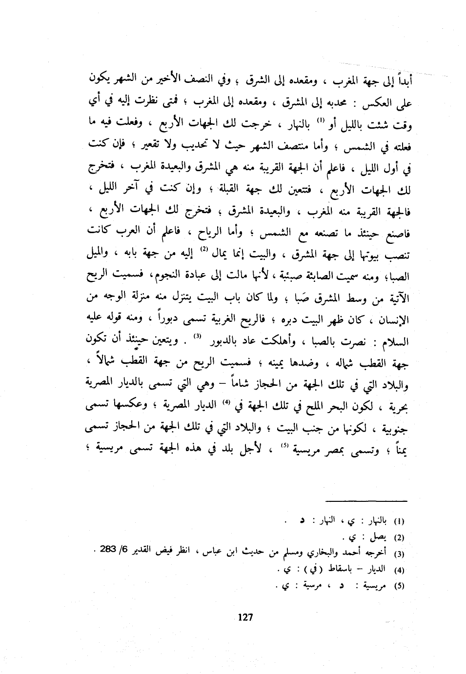 أبدا إِلَى جِهَة الْمغرب ومقعده إِلَى الشرق وَفِي النِّصْفِ الْأَخِيرِ مِنَ الشَّهْرِ يَكُونُ عَلَى الْعَكْس محدبه إِلَى الْمشرق ومقعده إِلَى الْمَغْرِبِ فَمَتَى نَظَرْتَ إِلَيْهِ فِي أَيِّ وَقْتٍ شِئْتَ بِاللَّيْلِ أَوْ بِالنَّهَارِ خَرَجَتْ لَكَ الْجِهَاتُ الْأَرْبَعُ وَفَعَلْتَ فِيهِ مَا فَعَلْتَهُ فِي الشَّمْسِ وَأَمَّا مُنْتَصَفُ الشَّهْرِ حَيْثُ لَا تَحْدِيبَ وَلَا تَقْعِيرَ فَإِنْ كُنْتَ فِي أَوَّلِ اللَّيْلِ فَاعْلَمْ أَنَّ الْجِهَةَ الْقَرِيبَةَ مِنْهُ هِيَ الْمَشْرِقُ والبعيدة الْمَغْرِبُ فَتَخْرُجُ لَكَ الْجِهَاتُ الْأَرْبَعُ فَتَتَعَيَّنُ لَكَ جِهَةُ الْقِبْلَةِ وَإِنْ كُنْتَ فِي آخِرِ اللَّيْلِ فالجهة الْقَرِيبَة مِنْهُ الْمغرب والبعيدة الْمَشْرِقُ فَتَخْرُجُ لَكَ الْجِهَاتُ الْأَرْبَعُ فَاصْنَعْ حِينَئِذٍ مَا تَصْنَعُهُ مَعَ الشَّمْسِ وَأَمَّا الرِّيَاحُ فَاعْلَمْ أَنَّ الْعَرَبَ كَانَتْ تَنْصِبُ بُيُوتَهَا إِلَى جِهَةِ الْمَشْرِقِ وَالْبَيْتُ إِنَّمَا يُمَالُ إِلَيْهِ مِنْ جِهَةِ بَابه والميل الصِّبَا وَمِنْه سميت الصابئة صبئبة لِأَنَّهَا مَالَتْ إِلَى عِبَادَةِ النُّجُومِ فَسُمِّيَتِ الرِّيحُ الْآتِيَةُ مِنْ وَسَطِ الْمَشْرِقِ صَبَا وَلَمَّا كَانَ بَابُ الْبَيْتِ يَتَنَزَّلُ مِنْهُ مَنْزِلَةَ الْوَجْهِ مِنَ الْإِنْسَانِ كَانَ ظَهْرُ الْبَيْتِ دُبُرَهُ فَالرِّيحُ الْغَرْبِيَّةُ تُسَمَّى دَبُورًا وَمِنْهُ قَوْلُهُ عَلَيْهِ السَّلَامُ نُصِرْتُ بِالصَّبَا وَأُهْلِكَتْ عَادٌ بِالدَّبُورِ وَيَتَعَيَّنُ حِينَئِذٍ أَنْ تكون جِهَة القطب شِمَاله وضدها يَمِينه فَسُمِّيَتِ الرِّيحُ مِنْ جِهَةِ الْقُطْبِ شَمَالًا وَالْبِلَادُ الَّتِي فِي تِلْكَ الْجِهَةِ مِنَ الْحِجَازِ شَامًا وَهِي الَّتِي تُسَمَّى بِالدِّيَارِ الْمِصْرِيَّةِ بَحَرِيَّةً لِكَوْنِ الْبَحْرِ الْملح فِي تِلْكَ الْجِهَةِ فِي الدِّيَارِ الْمِصْرِيَّةِ وَعَكْسُهَا تُسَمَّى جَنُوبِيَّةً لِكَوْنِهَا مِنْ جَنْبِ الْبَيْتِ وَالْبِلَادُ الَّتِي فِي تِلْكَ الْجِهَةِ مِنَ الْحِجَازِ تُسَمَّى يَمَنًا وَتُسَمَّى بِمِصْرَ مَرِيسِيَّةَ لِأَجْلِ بَلَدٍ فِي هَذِه الْجِهَة تسمى مريسية
