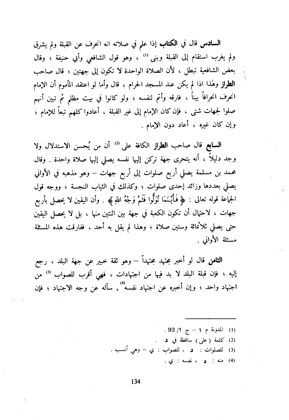 السَّادِسُ قَالَ فِي الْكِتَابِ إِذَا عَلِمَ فِي صَلَاتِهِ أَنَّهُ انْحَرَفَ عَنِ الْقِبْلَةِ وَلَمْ يُشَرِّقْ وَلَمْ يُغَرِّبِ اسْتَقَامَ إِلَى الْقِبْلَةِ وَبَنَى وَهُوَ قَوْلُ الشَّافِعِيُّ وَأَبِي حَنِيفَةَ وَقَالَ بَعْضُ الشَّافِعِيَّةِ تَبْطُلُ لِأَنَّ الصَّلَاةَ الْوَاحِدَةَ لَا تَكُونُ إِلَى جِهَتَيْنِ قَالَ صَاحِبُ الطَّرَّازِ وَهَذَا إِذَا لَمْ يَكُنْ عِنْدَ الْمَسْجِدِ الْحَرَامِ قَالَ وَأَمَّا لَوِ اعْتَقَدَ الْمَأْمُومُ أَنَّ الْإِمَامَ انْحَرَفَ انْحِرَافًا بَيِّنًا فَارَقَهُ وَأَتَمَّ لِنَفْسِهِ وَلَوْ كَانُوا فِي بَيْتٍ مُظْلِمٍ ثُمَّ تَبَيَّنَ أَنَّهُمْ صَلَّوْا لِجِهَاتٍ شَتَّى فَإِن كَانَ الإِمَام إِلَى غير الْقِبْلَةِ أَعَادُوا كُلُّهُمْ تَبَعًا لِلْإِمَامِ وَإِنْ كَانَ غَيْرُهُ أَعَادَ دُونَ الْإِمَامِ السَّابِعُ قَالَ صَاحِبُ الطَّرَّازِ الْكَافَّةُ عَلَى أَنَّ مَنْ يُحْسِنُ الِاسْتِدْلَالَ وَلَا وَجَدَ دَلِيلًا أَنَّهُ يَتَحَرَّى جِهَةً تَرْكَنُ إِلَيْهَا نَفْسُهُ يُصَلِّي إِلَيْهَا صَلَاةً وَاحِدَةً وَقَالَ مُحَمَّدُ بْنُ مَسْلَمَةَ يُصَلِّي أَرْبَعَ صَلَوَاتٍ إِلَى أَرْبَعِ جِهَاتٍ وَهُوَ مَذْهَبُهُ فِي الْأَوَانِي يُصَلِّي بعددها وزائد إِحْدَى صلوَات وَكَذَلِكَ فِي الثِّيَابِ النَّجِسَةِ وَوَجْهُ قَوْلِ الْجَمَاعَةِ قَوْله تَعَالَى {فَأَيْنَمَا تُوَلُّوا فَثَمَّ وَجْهُ اللَّهِ} وَأَنَّ الْيَقِينَ لَا يَحْصُلُ بِأَرْبَعِ جِهَاتٍ لِاحْتِمَالِ أَن تكون الْكَعْبَة فِي جِهَة بَين اثْنَتَيْنِ مِنْهَا بَلْ لَا يَحْصُلُ الْيَقِينُ حَتَّى يُصَلِّيَ ثَلَاثَمِائَةٍ وَسِتِّينَ صَلَاةً وَهَذَا لَمْ يَقُلْ بِهِ أَحَدٌ ففارقت هَذِه المسئلة مسئلة الْأَوَانِي الثَّامِنُ قَالَ لَوْ أَخْبَرَ مُجْتَهِدٌ مُجْتَهِدًا وَهُوَ ثِقَة خَبِير عَنْ جِهَةِ الْبَلَدِ رَجَعَ إِلَيْهِ فَإِنَّ قِبْلَةَ الْبَلَدِ لَا بُدَّ فِيهَا مِنِ اجْتِهَادَاتٍ فَهِيَ أَقْرَبُ لِلصَّوَابِ مِنِ اجْتِهَادٍ وَاحِدٍ وَإِنْ أَخْبَرَهُ عَنِ اجْتِهَادِ نَفْسِهِ سَأَلَهُ عَنْ وَجْهِ الِاجْتِهَادِ فَإِن