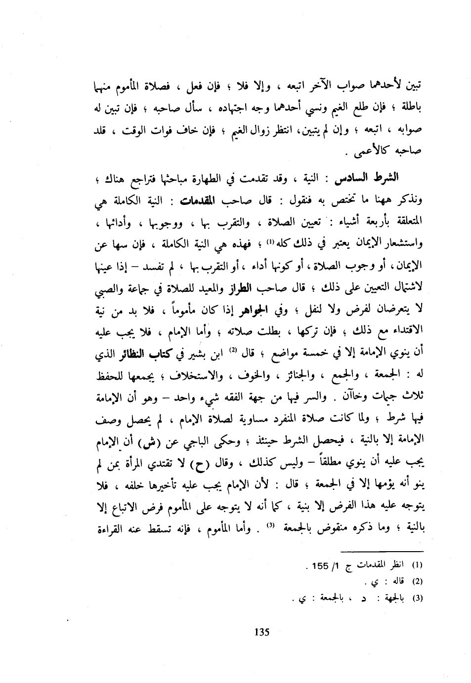 تَبَيَّنَ لِأَحَدِهِمَا صَوَابُ الْآخَرِ اتَّبَعَهُ وَإِلَّا فَلَا فَإِنْ فَعَلَ فَصَلَاةُ الْمَأْمُومِ مِنْهُمَا بَاطِلَةٌ فَإِنْ طَلَعَ الْغَيْمُ وَنَسِيَ أَحَدُهُمَا وَجْهَ اجْتِهَادِهِ سَأَلَ صَاحِبَهُ فَإِنْ تَبَيَّنَ لَهُ صَوَابُهُ اتَّبَعَهُ وَإِنْ لَمْ يَتَبَيَّنِ انْتَظَرَ زَوَالَ الْغَيْمِ فَإِنْ خَافَ فَوَاتَ الْوَقْتِ قَلَّدَ صَاحِبَهُ كَالْأَعْمَى الشَّرْطُ السَّادِسُ النِّيَّة وَقد تقدّمت فِي الطَّهَارَة مباحثها فتراجع هُنَاكَ وَنَذْكُر هَهُنَا مَا تخْتَص بِهِ فَنَقُولُ قَالَ صَاحِبُ الْمُقَدِّمَاتِ النِّيَّةُ الْكَامِلَةُ هِيَ الْمُتَعَلِّقَةُ بِأَرْبَعَةِ أَشْيَاءَ تَعْيِينُ الصَّلَاةِ وَالتَّقَرُّبُ بِهَا ووجوبها وأدائها وَاسْتِشْعَارُ الْإِيمَانِ يُعْتَبَرُ فِي ذَلِكَ كُلِّهِ فَهَذِهِ هِيَ النِّيَّةُ الْكَامِلَةُ فَإِنْ سَهَا عَنِ الْإِيمَانِ أَوْ وُجُوبِ الصَّلَاةِ أَوْ كَوْنِهَا أَدَاءً أَوِ التَّقَرُّب بهَا لَمْ تَفْسُدْ إِذَا عَيَّنَهَا لِاشْتِمَالِ التَّعْيِينِ عَلَى ذَلِكَ قَالَ صَاحِبُ الطَّرَّازِ وَالْمُعِيدُ لِلصَّلَاةِ فِي جَمَاعَةٍ وَالصَّبِيُّ لَا يَتَعَرَّضَانِ لِفَرْضٍ وَلَا لِنَفْلٍ وَفِي الْجَوَاهِرِ إِذَا كَانَ مَأْمُومًا فَلَا بُدَّ مِنْ نِيَّةِ الِاقْتِدَاءِ مَعَ ذَلِكَ فَإِنْ تَرَكَهَا بَطَلَتْ صَلَاتُهُ وَأَمَّا الْإِمَامُ فَلَا يَجِبُ عَلَيْهِ أَنْ يَنْوِيَ الْإِمَامَةَ إِلَّا فِي خَمْسَةِ مَوَاضِعَ قَالَ ابْن بشير فِي كتاب النَّظَائِر الَّذِي لَهُ الْجُمُعَةُ وَالْجُمَعُ وَالْجَنَائِزُ وَالْخَوْفُ وَالِاسْتِخْلَافُ يَجْمَعُهَا للْحِفْظ ثَلَاث جيمات وخاآن وَالسِّرُّ فِيهَا مِنْ جِهَةِ الْفِقْهِ شَيْءٌ وَاحِدٌ وَهُوَ أَنَّ الْإِمَامَةَ فِيهَا شَرْطٌ وَلَمَّا كَانَتْ صَلَاةُ الْمُنْفَرِدِ مُسَاوِيَةً لِصَلَاةِ الْإِمَامِ لَمْ يَحْصُلْ وَصْفُ الْإِمَامَةِ إِلَّا بِالنِّيَّةِ فَيَحْصُلُ الشَّرْطُ حِينَئِذٍ وَحَكَى الْبَاجِيُّ عَنْ (ش) أَنَّ الْإِمَامَ يَجِبُ عَلَيْهِ أَنْ يَنْوِيَ مُطْلَقًا وَلَيْسَ كَذَلِكَ وَقَالَ (ح) لَا تَقْتَدِي الْمَرْأَةُ بِمَنْ لَمْ يَنْوِ أَنَّهُ يَؤُمُّهَا إِلَّا فِي الْجُمُعَةِ قَالَ لِأَنَّ الْإِمَامَ يَجِبُ عَلَيْهِ تَأْخِيرُهَا خَلْفَهُ فَلَا يَتَوَجَّهُ عَلَيْهِ هَذَا الْفَرْضُ إِلَّا بِنِيَّةٍ كَمَا أَنَّهُ لَا يَتَوَجَّهُ عَلَى الْمَأْمُومِ فَرْضُ الِاتِّبَاعِ إِلَّا بِالنِّيَّةِ وَمَا ذَكَرَهُ مَنْقُوضٌ بِالْجُمُعَةِ وَأَمَّا الْمَأْمُومُ فَإِنَّهُ تَسْقُطُ عَنْهُ الْقِرَاءَةُ