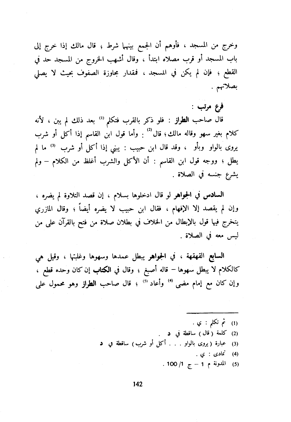 وَخَرَجَ مِنَ الْمَسْجِدِ فَأَوْهَمَ أَنَّ الْجَمْعَ بَيْنَهُمَا شَرْطٌ قَالَ مَالِكٌ إِذَا خَرَجَ إِلَى بَابِ الْمَسْجِدِ أَوْ قُرْبَ مُصَلَّاهُ ابْتَدَأَ وَقَالَ أَشْهَبُ الْخُرُوجُ مِنَ الْمَسْجِدِ حَدٌّ فِي الْقَطْعِ فَإِنْ لَمْ يَكُنْ فِي الْمَسْجِدِ فَمِقْدَارُ مُجَاوَزَةِ الصُّفُوفِ بِحَيْثُ لَا يلصي بِصَلَاتِهِمْ فَرْعٌ مُرَتَّبٌ قَالَ صَاحِبُ الطَّرَّازِ فَلَوْ ذَكَرَ بِالْقُرْبِ فَتَكَلَّمَ بَعْدَ ذَلِكَ لَمْ يَبْنِ لِأَنَّهُ كَلَامٌ بِغَيْرِ سَهْوٍ وَقَالَهُ مَالِكٌ قَالَ وَأَمَّا قَوْلُ ابْنِ الْقَاسِمِ إِذَا أَكَلَ أَوْ شرب يرْوى بِالْوَاو وبأو وَقَدْ قَالَ ابْنُ حَبِيبٍ يَبْنِي إِذَا أَكَلَ أَوْ شَرِبَ مَا لَمْ يُطِلْ وَوَجْهُ قَوْلِ ابْن الْقَاسِم أَن الْأكل وَالشرب وَأَغْلظ مِنَ الْكَلَامِ وَلَمْ يُشْرَعْ جِنْسُهُ فِي الصَّلَاةِ السَّادِسُ فِي الْجَوَاهِرِ لَوْ قَالَ ادْخُلُوهَا بِسَلَامٍ إِنْ قَصَدَ التِّلَاوَةَ لَمْ يَضُرُّهُ وَإِنْ لَمْ يَقْصِدْ إِلَّا الْإِفْهَامَ فَقَالَ ابْنُ حَبِيبٍ لَا يضرّهُ أَيْضًا وَقَالَ الْمَازِرِيُّ يَتَخَرَّجُ فِيهَا قَوْلٌ بِالْإِبْطَالِ من الْخلَافَة فِي بُطْلَانِ صَلَاةِ مَنْ فَتَحَ بِالْقُرْآنِ عَلَى مَنْ لَيْسَ مَعَهُ فِي الصَّلَاةِ السَّابِعُ الْقَهْقَهَةُ فِي الْجَوَاهِرِ يُبْطِلُ عَمْدُهَا وَسَهْوُهَا وَغَلَبَتُهَا وَقِيلَ هِيَ كَالْكَلَامِ لَا يُبْطِلُ سَهْوُهَا قَالَهُ أَصْبَغُ وَقَالَ فِي الْكِتَابِ إِنْ كَانَ وَحْدَهُ قَطَعَ وَإِنْ كَانَ مَعَ إِمَامٍ مَضَى وَأَعَادَ قَالَ صَاحِبُ الطَّرَّازِ وَهُوَ مَحْمُولٌ عَلَى