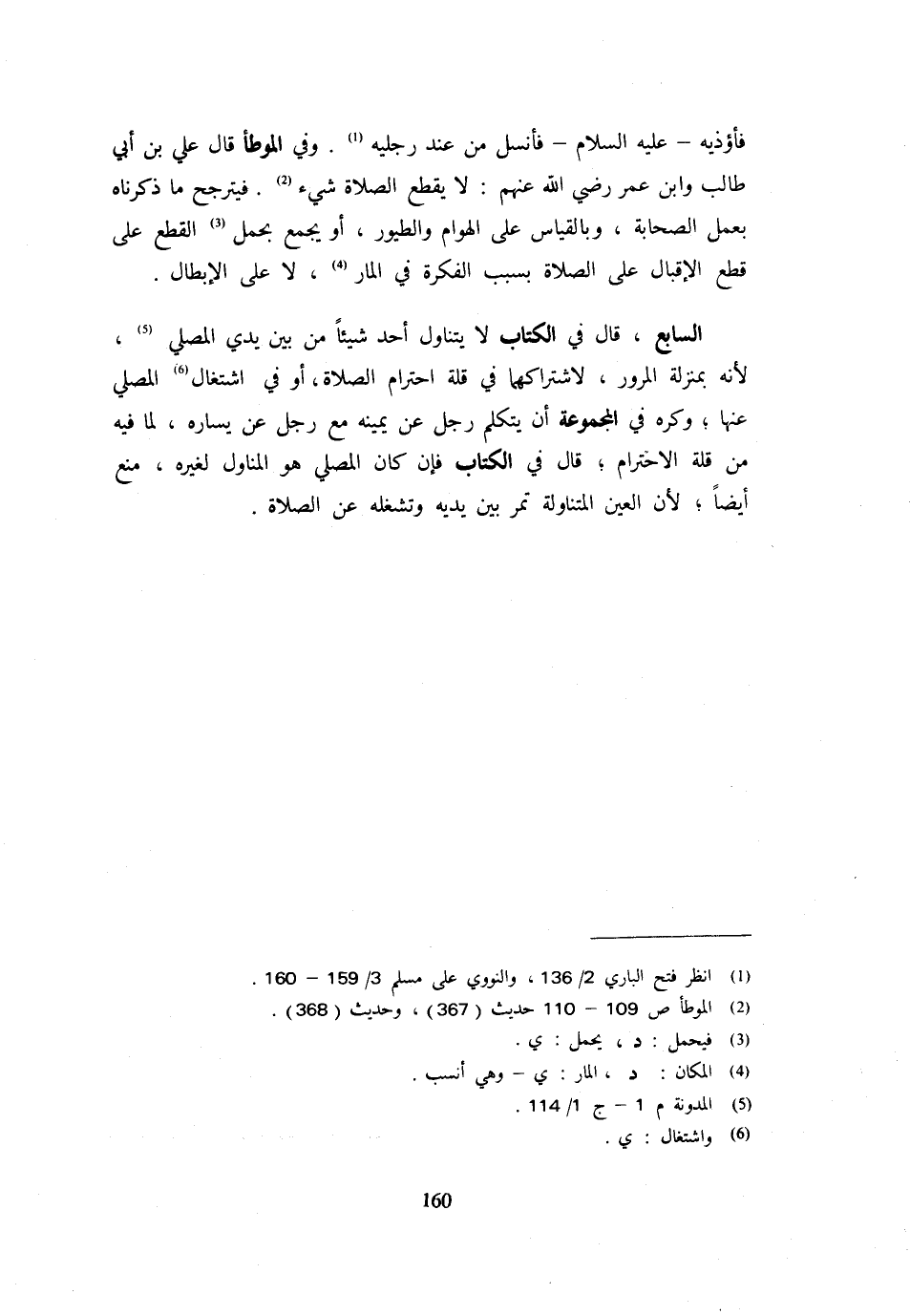 فَأُوذَيَهُ عَلَيْهِ السَّلَامُ فَأَنْسَلُّ مِنْ عِنْدِ رِجْلَيْهِ وَفِي الْمُوَطَّأِ قَالَ عَلِيُّ بْنُ أَبِي طَالِبٍ وَابْن عمر رَضِي الله عَنْهُم لَا يَقْطَعُ الصَّلَاةَ شَيْءٌ فَيَتَرَجَّحُ مَا ذَكَرْنَاهُ بِعَمَلِ الصَّحَابَةِ وَبِالْقِيَاسِ عَلَى الْهَوَامِّ وَالطُّيُورِ أَوْ يجمع بِحمْل الْقَطْعُ عَلَى قَطْعِ الْإِقْبَالِ عَلَى الصَّلَاةِ بِسَبَبِ الْفِكْرَةِ فِي الْمَارِّ لَا عَلَى الْإِبْطَالِ السَّابِعُ قَالَ فِي الْكِتَابِ لَا يَتَنَاوَلُ أَحَدٌ شَيْئًا مِنْ بَيْنِ يَدَيِ الْمُصَلِّي لِأَنَّهُ بِمَنْزِلَةِ الْمُرُورِ لِاشْتِرَاكِهِمَا فِي قِلَّةِ احْتِرَامِ الصَّلَاةِ أَوْ فِي اشْتِغَالِ الْمُصَلِّي عَنْهَا وَكَرِهَ فِي الْمَجْمُوعَةِ أَنْ يَتَكَلَّمَ رَجُلٌ عَنْ يَمِينِهِ مَعَ رَجُلٍ عَنْ يَسَارِهِ لِمَا فِيهِ مِنْ قِلَّةِ الِاحْتِرَامِ قَالَ فِي الْكِتَابِ فَإِنْ كَانَ الْمُصَلِّي هُوَ الْمُنَاوِلَ لِغَيْرِهِ مَنَعَ أَيْضًا لِأَنَّ الْعَيْنَ الْمُتَنَاوَلَةَ تَمُرُّ بَيْنَ يَدَيْهِ وَتَشْغَلُهُ عَنِ الصَّلَاةِ
