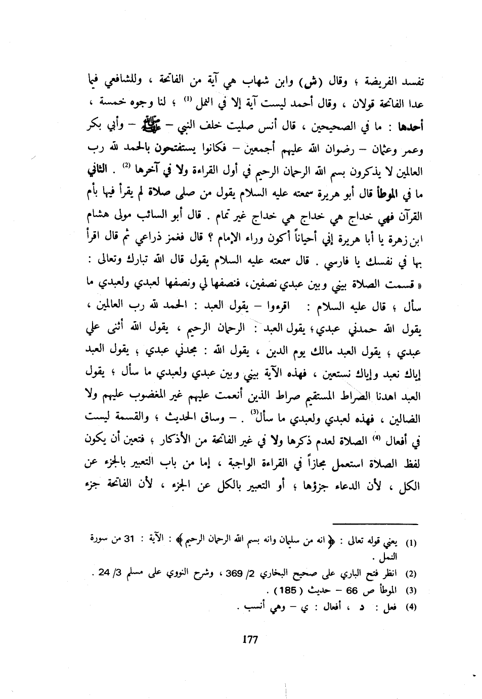 قَسَمْتُ الصَّلَاةَ بَيْنِي وَبَيْنَ عَبْدِي نِصْفَيْنِ فَنِصْفُهَا لِي وَنِصْفُهَا لِعَبْدِي وَلِعَبْدِي مَا سَأَلَ قَالَ عَلَيْهِ السَّلَامُ اقْرَءُوا يَقُولُ الْعَبْدُ الْحَمْدُ لله رب الْعَالمين يَقُول الله حمدني عَبدِي يَقُول العَبْد الرحمان الرَّحِيم يَقُولُ اللَّهُ أَثْنَى عَلَيَّ عَبْدِي يَقُولُ الْعَبْدُ مَالك يَوْم الدّين يَقُولُ اللَّهُ مَجَّدَنِي عَبْدِي يَقُولُ الْعَبْدُ إِيَّاكَ نعْبد وَإِيَّاك نستعين فَهَذِهِ الْآيَةُ بَيْنِي وَبَيْنَ عَبْدِي وَلِعَبْدِي مَا سَأَلَ يَقُول العَبْد اهدنا الصِّرَاط الْمُسْتَقيم صِرَاطَ الَّذِينَ أَنْعَمْتَ عَلَيْهِمْ غَيْرِ الْمَغْضُوبِ عَلَيْهِمْ وَلَا الضَّالّين فَهَذِهِ لِعَبْدِي وَلِعَبْدِي مَا سَأَلَ وَسَاقَ الْحَدِيثَ وَالْقِسْمَةُ لَيْسَتْ فِي أَفْعَالِ الصَّلَاةِ لِعَدَمِ ذِكْرِهَا وَلَا فِي غَيْرِ الْفَاتِحَةِ مِنَ الْأَذْكَارِ فَتَعَيَّنَ أَنْ يَكُونَ لَفْظُ الصَّلَاةِ اسْتُعْمِلَ مَجَازًا فِي الْقِرَاءَةِ الْوَاجِبَةِ إِمَّا مِنْ بَابِ التَّعْبِيرِ بِالْجُزْءِ عَنِ الْكُلِّ لِأَنَّ الدُّعَاءَ جُزْؤُهَا أَوِ التَّعْبِيرِ بِالْكُلِّ عَنِ الْجُزْءِ لِأَنَّ الْفَاتِحَةَ جُزْءُ