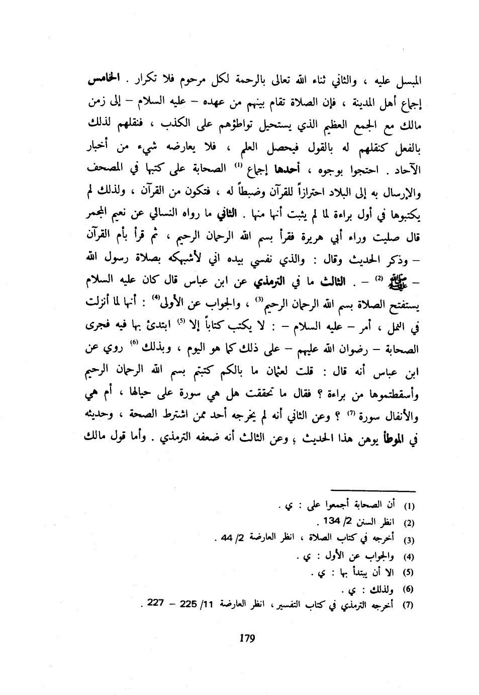المبسل عَلَيْهِ وَالثَّانِي ثَنَاء اللَّهِ تَعَالَى بِالرَّحْمَةِ لِكُلِّ مَرْحُومٍ فَلَا تَكْرَارَ الْخَامِسُ إِجْمَاعُ أَهْلِ الْمَدِينَةِ فَإِنَّ الصَّلَاةَ تُقَامُ بَيْنَهُمْ مِنْ عَهْدِهِ عَلَيْهِ السَّلَامُ إِلَى زَمَنِ مَالِكٍ مَعَ الْجَمْعِ الْعَظِيمِ الَّذِي يَسْتَحِيلُ تَوَاطُؤُهُمْ عَلَى الْكَذِبِ فَنَقْلُهُمْ لِذَلِكَ بِالْفِعْلِ كَنَقْلِهِمْ لَهُ بِالْقَوْلِ فَيَحْصُلُ الْعِلْمُ فَلَا يُعَارِضُهُ شَيْءٌ مِنْ أَخْبَار الْآحَاد احْتَجُّوا بِوُجُوه أَحدهَا إِجْمَاعُ الصَّحَابَةِ عَلَى كَتْبِهَا فِي الْمُصْحَفِ وَالْإِرْسَالِ بِهِ إِلَى الْبِلَادِ احْتِرَازًا لِلْقُرْآنِ وَضَبْطًا لَهُ فَتَكُونُ مِنَ الْقُرْآنِ وَلِذَلِكَ لَمْ يَكْتُبُوهَا فِي أَوَّلِ بَرَاءَةٌ لَمَّا لَمْ يَثْبُتْ أَنَّهَا مِنْهَا الثَّانِي مَا رَوَاهُ النَّسَائِيُّ عَنْ نُعَيْمٍ الْمُجْمِرِ قَالَ صَلَّيْتُ وَرَاءَ أَبِي هُرَيْرَةَ فَقَرَأَ بِسْمِ الله الرَّحْمَن الرَّحِيم ثُمَّ قَرَأَ بِأُمِّ الْقُرْآنِ وَذَكَرَ الْحَدِيثَ وَقَالَ وَالَّذِي نَفسِي بِيَدِهِ أَنِّي لأشبهكه بِصَلَاةِ رَسُولِ اللَّهِ - صَلَّى اللَّهُ عَلَيْهِ وَسَلَّم َ - الثَّالِثُ مَا فِي التِّرْمِذِيِّ عَنِ ابْنِ عَبَّاسٍ قَالَ كَانَ عَلَيْهِ السَّلَام يستفتح الصَّلَاة بِسم الله الرحمان الرَّحِيمِ وَالْجَوَابُ عَنِ الْأُولَى أَنَّهَا لَمَّا أُنْزَلَتْ فِي النَّمْل أَمر عَلَيْهِ السَّلَام لَا يكْتب كتابا إِلَّا ابْتُدِئَ بِهَا فِيهِ فَجَرَى الصَّحَابَةُ رِضْوَانُ اللَّهِ عَلَيْهِمْ عَلَى ذَلِكَ كَمَا هُوَ الْيَوْمُ وَبِذَلِك رُوِيَ عَنِ ابْنِ عَبَّاسٍ أَنَّهُ قَالَ قُلْتُ لعُثْمَان مَا بالكم كتبتم بِسم الله الرحمان الرَّحِيمِ وَأَسْقَطْتُمُوهَا مِنْ بَرَاءَةٌ فَقَالَ مَا تَحَقَّقْتُ هَلْ هِيَ سُورَةٌ عَلَى حِيَالِهَا أَمْ هِيَ وَالْأَنْفَالُ سُورَةٌ وَعَنِ الثَّانِي أَنَّهُ لَمْ يُخْرِجْهُ أَحَدٌ مِمَّنِ اشْتَرَطَ الصِّحَّةَ وَحَدِيثُهُ فِي الْمُوَطَّأِ يُوهِنُ هَذَا الْحَدِيثَ وَعَنِ الثَّالِثِ أَنَّهُ ضَعَّفَهُ التِّرْمِذِيُّ وَأَمَّا قَوْلُ مَالِكٍ
