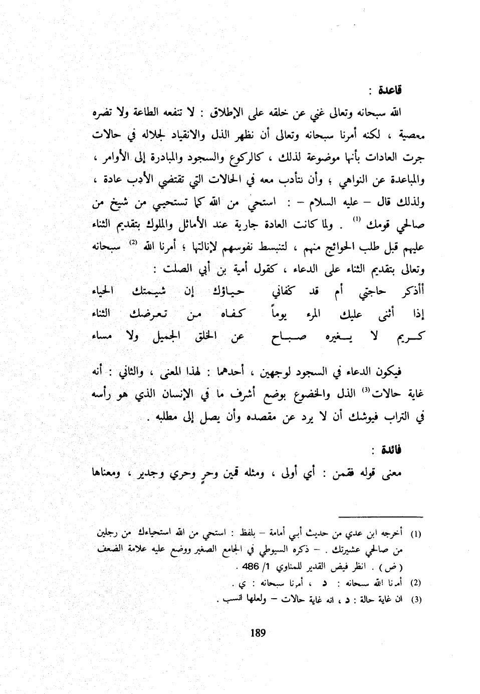 قَاعِدَةٌ اللَّهُ سُبْحَانَهُ وَتَعَالَى غَنِيٌّ عَنْ خَلْقِهِ عَلَى الْإِطْلَاقِ لَا تَنْفَعُهُ الطَّاعَةُ وَلَا تَضُرُّهُ مَعْصِيّة لَكِنَّهُ أَمَرَنَا سُبْحَانَهُ وَتَعَالَى أَنْ نُظْهِرَ الذُّلَّ وَالِانْقِيَادَ لِجَلَالِهِ فِي حَالَاتٍ جَرَتِ الْعَادَاتُ بِأَنَّهَا مَوْضُوعَةٌ لِذَلِكَ كَالرُّكُوعِ وَالسُّجُودِ وَالْمُبَادَرَةِ إِلَى الْأَوَامِرِ وَالْمُبَاعَدَةِ عَنِ النَّوَاهِي وَأَنْ نَتَأَدَّبَ مَعَهُ فِي الْحَالَاتِ الَّتِي تَقْتَضِي الْأَدَبَ عَادَةً وَلِذَلِكَ قَالَ عَلَيْهِ السَّلَامُ اسْتَحْيِ مِنَ اللَّهِ كَمَا تَسْتَحْيِي مِنْ شَيْخٍ مِنْ صَالِحِي قَوْمِكَ وَلَمَّا كَانَتِ الْعَادَةُ جَارِيَةٌ عِنْدَ الْأَمَاثِلِ وَالْمُلُوكِ بِتَقْدِيمِ الثَّنَاءِ عَلَيْهِمْ قَبْلَ طَلَبِ الْحَوَائِجِ مِنْهُمْ لِتَنْبَسِطَ نُفُوسُهُمْ لإنالتها أمرنَا الله سُبْحَانَهُ وَتَعَالَى بِتَقْدِيمِ الثَّنَاءِ عَلَى الدُّعَاءِ كَقَوْلِ أُمَيَّةَ بْنِ أَبِي الصَّلْتِ