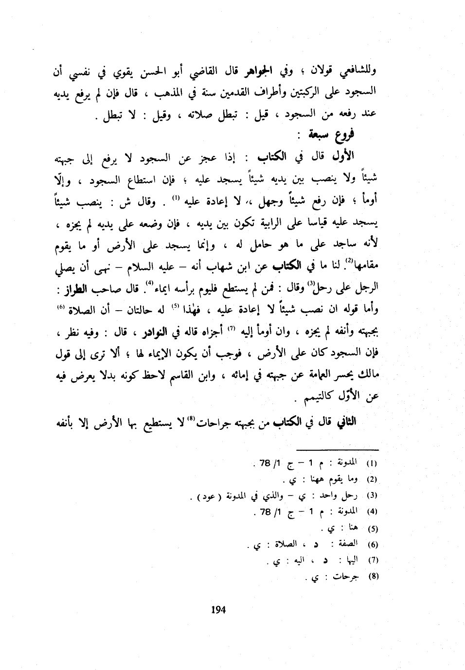 وَللشَّافِعِيّ قَوْلَانِ وَفِي الْجَوَاهِرِ قَالَ الْقَاضِي أَبُو الْحَسَنِ يُقَوِّي فِي نَفْسِي أَنَّ السُّجُودَ عَلَى الرُّكْبَتَيْنِ وَأَطْرَافِ الْقَدَمَيْنِ سُنَّةٌ فِي الْمَذْهَبِ قَالَ فَإِنْ لَمْ يَرْفَعْ يَدَيْهِ عِنْدَ رَفْعِهِ مِنَ السُّجُودِ قِيلَ تَبْطُلُ صَلَاتُهُ وَقِيلَ لَا تَبْطُلُ فُرُوعٌ سَبْعَة الْأَوَّلُ قَالَ فِي الْكِتَابِ إِذَا عَجَزَ عَنِ السُّجُودِ لَا يَرْفَعُ إِلَى جَبْهَتِهِ شَيْئًا وَلَا يَنْصِبُ بَيْنَ يَدَيْهِ شَيْئًا يَسْجُدُ عَلَيْهِ فَإِنِ اسْتَطَاعَ السُّجُودَ وَإِلَّا أَوْمَأَ فَإِنْ رَفَعَ شَيْئًا وَجَهَلَ لَا إِعَادَةَ عَلَيْهِ وَقَالَ ش يَنْصِبُ شَيْئًا يَسْجُدُ عَلَيْهِ قِيَاسًا عَلَى الرَّابِيَةِ تَكُونُ بَيْنَ يَدَيْهِ فَإِنْ وَضَعَهُ عَلَى يَدَيْهِ لَمْ يُجْزِهِ لِأَنَّهُ سَاجِدٌ عَلَى مَا هُوَ حَامِلٌ لَهُ وَإِنَّمَا يَسْجُدُ عَلَى الْأَرْضِ أَوْ مَا يَقُومُ مَقَامَهَا لَنَا مَا فِي الْكِتَابِ عَنِ ابْنِ شِهَابٍ أَنَّهُ عَلَيْهِ السَّلَامُ نَهَى أَنْ يُصَلِّيَ الرَّجُلُ عَلَى رَحْلٍ وَقَالَ فَمَنْ لَمْ يسْتَطع فليوم بِرَأْسِهِ إِيمَاءً قَالَ صَاحِبُ الطَّرَّازِ وَأَمَّا قَوْلُهُ إِنْ نَصَبَ شَيْئًا لَا إِعَادَةَ عَلَيْهِ فَهَذَا لَهُ حالتان أَن الصَّلَاة بِجَبْهَتِهِ وَأَنْفِهِ لَمْ يُجَزْهُ وَإِنْ أَوْمَأَ إِلَيْهِ أَجْزَأَهُ قَالَهُ فِي النَّوَادِرِ قَالَ وَفِيهِ نَظَرٌ فَإِنَّ السُّجُودَ كَانَ عَلَى الْأَرْضِ فَوَجَبَ أَنْ يَكُونَ الْإِيمَاءُ لَهَا أَلَا تَرَى إِلَى قَوْلِ مَالك يحسر الْعِمَامَة عَن جَبهته فِي إمائه وَابْن الْقَاسِم لاحظ كَونه بَدَلا يعرض فِيهِ عَن الأول كالتيمم الثَّانِي قَالَ فِي الْكِتَابِ مَنْ بِجَبْهَتِهِ جِرَاحَاتٌ لَا يَسْتَطِيع بهَا الْأَرْضَ إِلَّا بِأَنْفِهِ