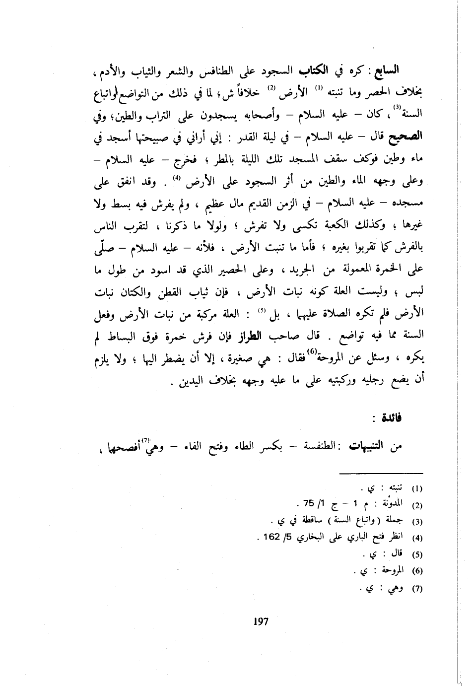 السَّابِعُ كَرِهَ فِي الْكِتَابِ السُّجُودَ عَلَى الطَّنَافِسِ وَالشعر وَالثيَاب والأدم بِخِلَاف الْحصْر وَمَا تنبته الأَرْض خلافًا (ش) لما فِي ذَلِك من التَّوَاضُع اَوْ اتِّبَاع السُّنَّةِ كَانَ عَلَيْهِ السَّلَامُ وَأَصْحَابُهُ يَسْجُدُونَ عَلَى التُّرَابِ وَالطِّينِ وَفِي الصَّحِيحِ قَالَ عَلَيْهِ السَّلَامُ فِي لَيْلَةِ الْقَدْرِ إِنِّي أَرَانِي فِي صَبِيحَتِهَا أَسْجُدُ فِي مَاءٍ وَطِينٍ فَوَكَفَ سَقْفُ الْمَسْجِدِ تِلْكَ اللَّيْلَةَ بِالْمَطَرِ فَخَرَجَ عَلَيْهِ السَّلَامُ وَعَلَى وَجهه الْمَاءُ وَالطِّينُ مِنْ أَثَرِ السُّجُودِ عَلَى الْأَرْضِ وَقَدِ أُنْفِقَ عَلَى مَسْجِدِهِ عَلَيْهِ السَّلَامُ فِي الزَّمَنِ الْقَدِيمِ مَالٌ عَظِيمٌ وَلَمْ يُفْرَشْ فِيهِ بُسُطٌ وَلَا غَيْرُهَا وَكَذَلِكَ الْكَعْبَةُ تُكْسَى وَلَا تفرش وَلَوْلَا مَا ذكرنَا لَتَقَرَّبَ النَّاسُ بِالْفُرُشِ كَمَا تَقَرَّبُوا بِغَيْرِهِ فَأَمَّا مَا تُنْبِتُ الْأَرْضُ فَلِأَنَّهُ عَلَيْهِ السَّلَامُ صَلَّى عَلَى الْخِمْرَةِ الْمَعْمُولَةِ مِنَ الْجَرِيدِ وَعَلَى الْحَصِيرِ الَّذِي قد اسود من طول مَا لبس وَلَيْسَتِ الْعِلَّةُ كَوْنَهُ نَبَاتَ الْأَرْضِ فَإِنَّ ثِيَابَ الْقطن والكتان نَبَات الأَرْض فَلم تُكْرَهِ الصَّلَاةُ عَلَيْهِمَا بَلِ الْعِلَّةُ مُرَكَّبَةٌ مِنْ نَبَاتِ الْأَرْضِ وَفِعْلِ السُّنَّةِ مِمَّا فِيهِ تَوَاضُعٌ قَالَ صَاحِبُ الطَّرَّازِ فَإِنْ فَرَشَ خُمْرَةً فَوْقَ الْبِسَاطِ لَمْ يُكْرَهْ وَسُئِلَ عَنِ الْمِرْوَحَةِ فَقَالَ هِيَ صَغِيرَةٌ إِلَّا أَنْ يَضْطَرَّ إِلَيْهَا وَلَا يَلْزَمُ أَنْ يَضَعَ رِجْلَيْهِ وَرُكْبَتَيْهِ عَلَى مَا عَلَيْهِ وَجْهُهُ بِخِلَافِ الْيَدَيْنِ