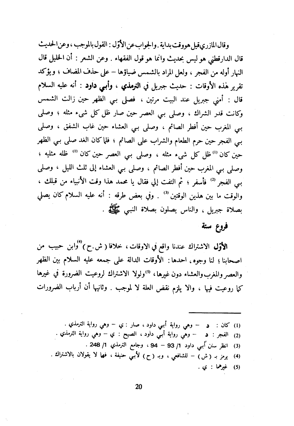 فُرُوعٌ سِتَّةٌ الْأَوَّلُ الِاشْتِرَاكُ عِنْدَنَا وَاقِعٌ فِي الْأَوْقَات خلافًا (ش. ح) وَابْنِ حَبِيبٍ مِنْ أَصْحَابِنَا لَنَا وُجُوهٌ أَحدهَا الْأَوْقَات الدَّالَّةُ عَلَى جَمْعِهِ عَلَيْهِ السَّلَامُ بَيْنَ الظُّهْرِ وَالْعَصْرِ وَالْمَغْرِبِ وَالْعِشَاءِ دُونَ غَيْرِهَا وَلَوْلَا الِاشْتِرَاكُ لَرُوعِيَتِ الضَّرُورَةُ فِي غَيْرِهَا كَمَا رُوعِيَتْ فِيهَا وَإِلَّا يلْزم نقض الْعلَّة لَا لِمُوجَبٍ وَثَانِيهَا أَنَّ أَرْبَابَ الضَّرُورَاتِ