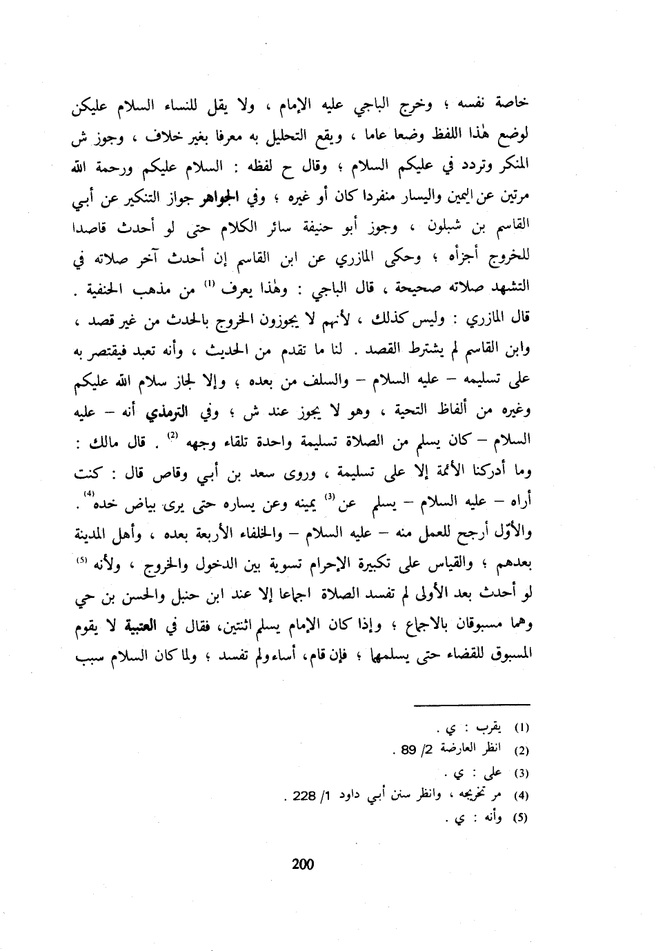 خَاصَّةِ نَفْسِهِ وَخَرَّجَ الْبَاجِيُّ عَلَيْهِ الْإِمَامَ وَلَا يَقُلْ لِلنِّسَاءِ السَّلَامُ عَلَيْكُنَّ لِوَضْعِ هَذَا اللَّفْظِ وَضْعًا عَامًّا وَيَقَعُ التَّحْلِيلُ بِهِ مُعَرَّفًا بِغَيْرِ خِلَافٍ وَجَوَّزَ ش الْمُنَكَّرَ وَتَرَدَّدَ فِي عَلَيْكُمُ السَّلَامُ وَقَالَ ح لَفْظُهُ السَّلَامُ عَلَيْكُمْ وَرَحْمَةُ اللَّهِ مَرَّتَيْنِ عَنِ الْيَمِينِ وَالْيَسَارِ مُنْفَرِدًا كَانَ أَو غَيره وَفِي الْجَوَاهِر جَوَاز التنكير عَن أبي الْقَاسِم بن شبلون وَجوز أَبُو حنيفَة سَائِرَ الْكَلَامِ حَتَّى لَوْ أَحْدَثَ قَاصِدًا لِلْخُرُوجِ أَجْزَأَهُ وَحَكَى الْمَازِرِيُّ عَنِ ابْنِ الْقَاسِمِ إِنْ أحدث آخر صلَاته فِي التَّشَهُّد صلَاته صَحِيحَة قَالَ الْبَاجِيُّ وَهَذَا يُعْرَفُ مِنْ مَذْهَبِ الْحَنَفِيَّةِ قَالَ الْمَازِرِيُّ وَلَيْسَ كَذَلِكَ لِأَنَّهُمْ لَا يُجَوِّزُونَ الْخُرُوجَ بِالْحَدَثِ مِنْ غَيْرِ قَصْدٍ وَابْنُ الْقَاسِمِ لَمْ يَشْتَرِطِ الْقَصْدَ لَنَا مَا تَقَدَّمَ مِنَ الْحَدِيثِ وَأَنَّهُ تَعَبُّدٌ فَيَقْتَصِرُ بِهِ عَلَى تَسْلِيمِهِ عَلَيْهِ السَّلَامُ وَالسَّلَفُ مِنْ بَعْدِهِ وَإِلَّا لَجَازَ سَلَامُ اللَّهِ عَلَيْكُمْ وَغَيْرُهُ مِنْ أَلْفَاظِ التَّحِيَّةِ وَهُوَ لَا يَجُوزُ عِنْدَ ش وَفِي التِّرْمِذِيِّ أَنَّهُ عَلَيْهِ السَّلَامُ كَانَ يُسَلِّمُ مِنَ الصَّلَاةِ تَسْلِيمَةً وَاحِدَةً تِلْقَاءَ وَجْهِهِ قَالَ مَالِكٌ وَمَا أَدْرَكْنَا الْأَئِمَّةَ إِلَّا عَلَى تَسْلِيمَةٍ وَرَوَى سَعْدُ بْنُ أَبِي وَقَّاصٍ قَالَ كُنْتُ أَرَاهُ عَلَيْهِ السَّلَامُ يُسَلِّمُ عَنْ يَمِينِهِ وَعَنْ يَسَارِهِ حَتَّى يُرَى بَيَاض خَدّه وَالْأول أرجح للْعَمَل مِنْهُ عَلَيْهِ السَّلَام وَالْخُلَفَاء الْأَرْبَعَة بعده وَأهل الْمَدِينَة بعدهمْ وَالْقِيَاس عَلَى تَكْبِيرَةِ الْإِحْرَامِ تَسْوِيَةً بَيْنَ الدُّخُولِ وَالْخُرُوجِ وَلِأَنَّهُ لَوْ أَحْدَثَ بَعْدَ الْأُولَى لَمْ تَفْسُدِ الصَّلَاةُ إِجْمَاعًا إِلَّا عِنْدَ ابْنِ حَنْبَلٍ وَالْحَسَنِ بن حَيّ وَهُمَا مَسْبُوقَانِ بِالْإِجْمَاعِ وَإِذَا كَانَ الْإِمَامُ يُسَلِّمُ اثْنَتَيْنِ فَقَالَ فِي الْعُتْبِيَّةِ لَا يَقُومُ الْمَسْبُوقُ للْقَضَاء حَتَّى يُسَلِّمهَا فَإِنْ قَامَ أَسَاءَ وَلَمْ تَفْسُدْ وَلَمَّا كَانَ السَّلَام سَبَب