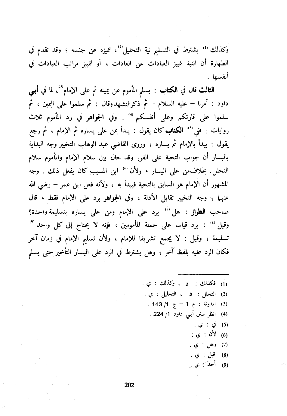 وَكَذَلِكَ يشْتَرط فِي التَّسْلِيم نِيَّة التَّحْلِيل لتميزه عَنْ جِنْسِهِ وَقَدْ تَقَدَّمَ فِي الطَّهَارَةِ أَنَّ النِّيَّةَ لِتَمْيِيزِ الْعِبَادَاتِ عَنِ الْعَادَاتِ أَوْ لِتَمْيِيزِ مَرَاتِبِ الْعِبَادَات فِي أَنْفسهَا الثَّالِثُ قَالَ فِي الْكِتَابِ يُسَلِّمُ الْمَأْمُومُ عَنْ يَمِينِهِ ثُمَّ عَلَى الْإِمَامِ لِمَا فِي أَبِي دَاوُدَ أَمَرَنَا عَلَيْهِ السَّلَامُ ثُمَّ ذَكَرَ التَّشَهُّدَ وَقَالَ ثُمَّ سَلِّمُوا عَلَى الْيَمِينِ ثُمَّ سَلِّمُوا عَلَى قَارِئِكُمْ وَعَلَى أَنْفُسِكُمْ وَفِي الْجَوَاهِرِ فِي رَدِّ الْمَأْمُومِ ثَلَاثُ رِوَايَاتٍ فَفِي الْكِتَابِ كَانَ يَقُولُ يَبْدَأُ بِمَنْ عَلَى يَسَارِهِ ثُمَّ الْإِمَامِ ثُمَّ رَجَعَ يَقُولُ يَبْدَأُ بِالْإِمَامِ ثُمَّ يَسَارِهِ وَرَوَى الْقَاضِي عَبْدُ الْوَهَّابِ التَّخْيِيرَ وَجْهُ الْبِدَايَةِ بِالْيَسَارِ أَنَّ جَوَابَ التَّحِيَّةِ عَلَى الْفَوْرِ وَقَدْ حَالَ بَيْنَ سَلَامِ الْإِمَامِ وَالْمَأْمُومِ سَلَامُ التَّحَلُّلِ بِخِلَافِ مَنْ عَلَى الْيَسَارِ وَلِأَنَّ ابْنَ الْمُسَيَّبِ كَانَ يَفْعَلُ ذَلِكَ وَجْهُ الْمَشْهُورِ أَنَّ الْإِمَامَ هُوَ السَّابِقُ بِالتَّحِيَّةِ فَيُبْدَأُ بِهِ وَلِأَنَّهُ فِعْلُ ابْنِ عُمَرَ رَضِيَ اللَّهُ عَنْهُمَا وَجْهُ التَّخْيِيرِ تَقَابُلُ الْأَدِلَّةِ وَفِي الْجَوَاهِرِ يَرُدُّ عَلَى الْإِمَامِ فَقَطْ قَالَ صَاحِبُ الطَّرَّازِ هَلْ يَرُدُّ عَلَى الْإِمَامِ وَمَنْ عَلَى يَسَارِهِ بِتَسْلِيمَةٍ وَاحِدَةٍ؟ وَقِيلَ يَرُدُّ قِيَاسًا عَلَى جُمْلَةِ الْمَأْمُومِينَ فَإِنَّهُ لَا يَحْتَاجُ إِلَى كُلِّ وَاحِدٍ تَسْلِيمَةً وَقِيلَ لَا يَجْمَعُ تَشْرِيفًا لِلْإِمَامِ وَلِأَنَّ تَسْلِيمَ الْإِمَامِ فِي زَمَانٍ آخَرَ فَكَانَ الرَّدُّ عَلَيْهِ بِلَفْظٍ آخَرَ وَهَلْ يُشْتَرَطُ فِي الرَّدِّ عَلَى الْيَسَارِ التَّأْخِيرُ حَتَّى يسلم