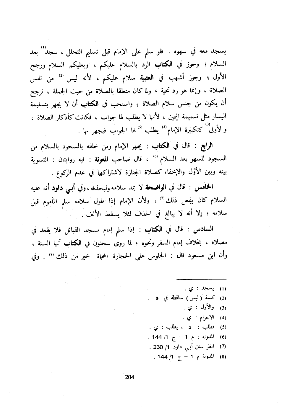 يَسْجُدُ مَعَهُ فِي سَهْوِهِ فَلَوْ سَلَّمَ عَلَى الْإِمَامِ قَبْلَ تَسْلِيمِ التَّحَلُّلِ سَجَدَ بَعْدَ السَّلَامِ وَجَوَّزَ فِي الْكِتَابِ الرَّدَّ بِالسَّلَامِ عَلَيْكُمْ وَبِعَلَيْكُمُ السَّلَامُ وَرَجَّحَ الْأَوَّلَ وَجَوَّزَ أَشْهَبُ فِي الْعُتْبِيَّةِ سَلَامٌ عَلَيْكُمْ لِأَنَّهُ لَيْسَ مِنْ نَفْسِ الصَّلَاةِ وَإِنَّمَا هُوَ رَدُّ تَحِيَّةٍ وَلَمَّا كَانَ مُتَعَلِّقًا بِالصَّلَاةِ مِنْ حَيْثُ الْجُمْلَةِ تَرَجَّحَ أَنْ يَكُونَ مِنْ جِنْسِ سَلَامِ الصَّلَاةِ وَاسْتَحَبَّ فِي الْكِتَابِ أَنْ لَا يَجْهَرَ بِتَسْلِيمَةِ الْيَسَارِ مِثْلَ تَسْلِيمَةِ الْيَمِينِ لِأَنَّهَا لَا يُطْلَبُ لَهَا جَوَابٌ فَكَانَتْ كَأَذْكَارِ الصَّلَاةِ وَالْأُولَى كَتَكْبِيرَةِ الْإِمَامِ يَطْلُبُ لَهَا الْجَواب فيجهر بهَا الرَّابِعُ قَالَ فِي الْكِتَابِ يَجْهَرُ الْإِمَامُ وَمَنْ خَلفه بِالسُّجُود بِالسَّلَامِ من السُّجُود للسَّهْو بعد السَّلَام قَالَ صَاحِبُ الْمَعُونَةِ فِيهِ رِوَايَتَانِ التَّسْوِيَةُ بَيْنَهُ وَبَيْنَ الْأَوَّلِ وَالْإِخْفَاءُ كَصَلَاةِ الْجِنَازَةِ لِاشْتِرَاكِهِمَا فِي عدم الرُّكُوع الْخَامِسُ قَالَ فِي الْوَاضِحَةِ لَا يَمُدُّ سَلَامَهُ وَلْيَحْذِفْهُ وَفِي أَبِي دَاوُدَ أَنَّهُ عَلَيْهِ السَّلَامُ كَانَ يَفْعَلُ ذَلِكَ وَلِأَنَّ الْإِمَامَ إِذَا طَوَّلَ سَلَامَهُ سَلَّمَ الْمَأْمُومُ قَبْلَ سَلَامِهِ إِلَّا أَنَّهُ لَا يُبَالِغُ فِي الْحَذْفِ لِئَلَّا يُسْقِطَ الْأَلِفَ السَّادِسُ قَالَ فِي الْكِتَابِ إِذَا سَلَّمَ إِمَامُ مَسْجِدِ الْقَبَائِلِ فَلَا يَقْعُدُ فِي مُصَلَّاهُ بِخِلَافِ إِمَامِ السَّفَرِ وَنَحْوِهِ لِمَا رَوَى سَحْنُونٌ فِي الْكِتَابِ أَنَّهَا السُّنَّةُ وَأَنَّ ابْنَ مَسْعُودٍ قَالَ الْجُلُوسُ عَلَى الْحِجَارَةِ الْمُحْمَاةِ خَيْرٌ مِنْ ذَلِكَ وَفِي