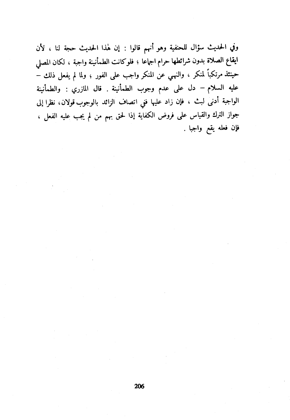 وَفِي الْحَدِيثِ سُؤَالٌ لِلْحَنَفِيَّةِ وَهُوَ أَنَّهُمْ قَالُوا إِنَّ هَذَا الْحَدِيثَ حُجَّةٌ لَنَا لِأَنَّ إِيقَاعَ الصَّلَاةِ بِدُونِ شَرَائِطِهَا حَرَامٌ إِجْمَاعًا فَلَوْ كَانَتِ الطُّمَأْنِينَةُ وَاجِبَةً لَكَانَ الْمُصَلِّي حِينَئِذٍ مُرْتَكِبًا لِمُنْكَرٍ وَالنَّهْيُ عَنِ الْمُنْكَرِ وَاجِبٌ عَلَى الْفَوْرِ وَلَمَّا لَمْ يَفْعَلْ ذَلِكَ عَلَيْهِ السَّلَامُ دَلَّ عَلَى عَدَمِ وُجُوبِ الطُّمَأْنِينَةِ قَالَ الْمَازِرِيُّ وَالطُّمَأْنِينَةُ الْوَاجِبَةُ أَدْنَى لُبْثٍ فَإِنْ زَادَ عَلَيْهَا فَفِي اتِّصَافِ الزَّائِدِ بِالْوُجُوبِ قَوْلَانِ نَظَرًا إِلَى جَوَازِ التَّرْكِ وَالْقِيَاسُ عَلَى فُرُوضِ الْكِفَايَةِ إِذَا لَحِقَ بِهِمْ مَنْ لَمْ يَجِبْ عَلَيْهِ الْفِعْلُ فَإِنْ فَعَلَهُ يَقع وَاجِبا