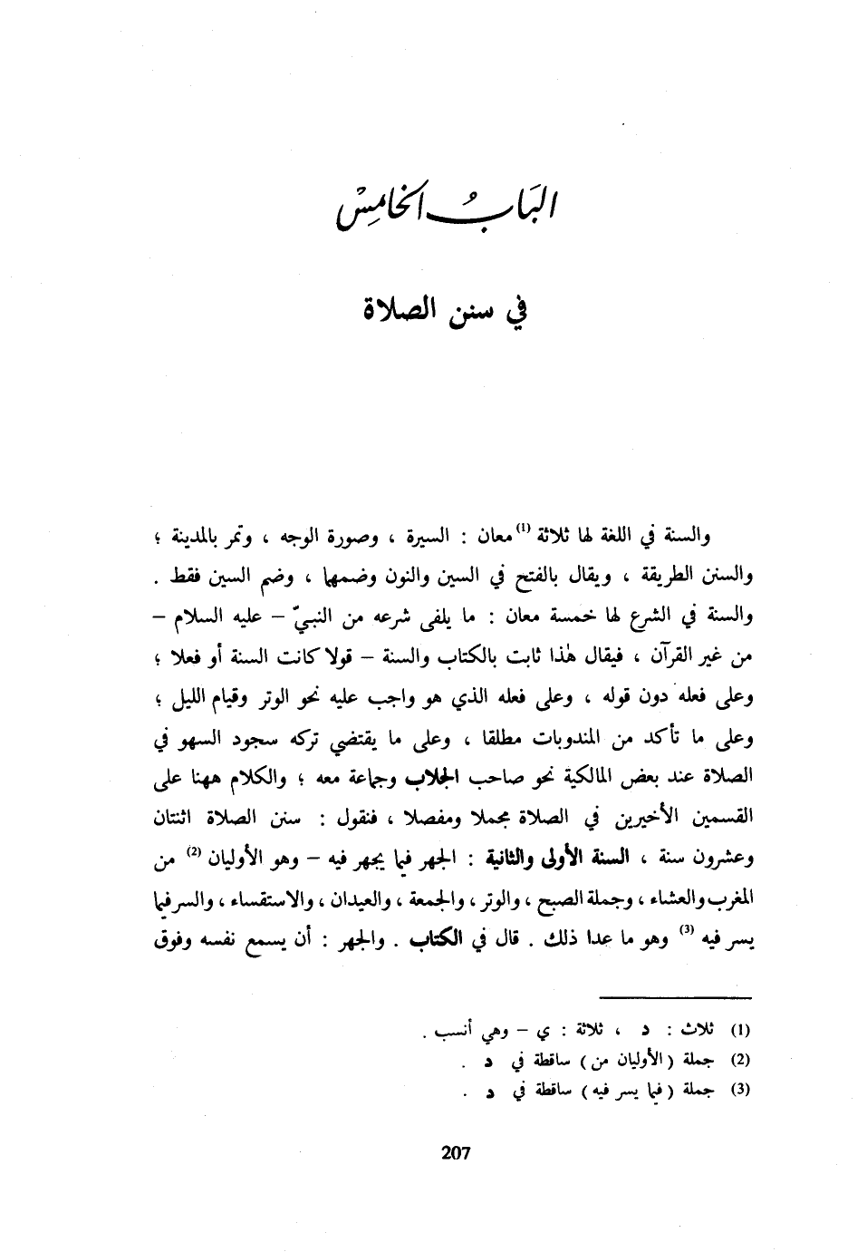 وَالسُّنَّةُ فِي اللُّغَةِ لَهَا ثَلَاثَةُ مَعَانٍ السِّيرَةُ وَصُورَةُ الْوَجْهِ وتمر بِالْمَدِينَةِ وَالسّنَن الطَّرِيقَة وَيُقَالُ بِالْفَتْحِ فِي السِّينِ وَالنُّونِ وَضَمِّهِمَا وَضَمِّ السِّينِ فَقَطْ وَالسُّنَّةُ فِي الشَّرْعِ لَهَا خَمْسَةُ معَان مَا يلفى شَرعه من النَّبِي عَلَيْهِ السَّلَام مِنْ غَيْرِ الْقُرْآنِ فَيُقَالُ هَذَا ثَابِتٌ بِالْكِتَابِ وَالسّنة قولا كَانَت السّنة أَو فِعْلًا وَعَلَى فِعْلِهِ دُونَ قَوْلِهِ وَعَلَى فِعْلِهِ الَّذِي هُوَ وَاجِبٌ عَلَيْهِ نَحْوَ الْوِتْرِ وَقِيَامِ اللَّيْلِ وَعَلَى مَا تَأَكَّدَ مِنَ الْمَنْدُوبَاتِ مُطْلَقًا وَعَلَى مَا يَقْتَضِي تَرْكُهُ سُجُودَ السَّهْوِ فِي الصَّلَاةِ عِنْدَ بَعْضِ الْمَالِكِيَّةِ نَحْوَ صَاحِبِ الْجُلَّابِ وَجَمَاعَة مَعَه وَالْكَلَام هَهُنَا عَلَى الْقِسْمَيْنِ الْأَخِيرَيْنِ فِي الصَّلَاةِ مُجْمَلًا وَمُفَصَّلًا فَنَقُولُ سُنَنُ الصَّلَاةِ اثْنَتَانِ وَعِشْرُونَ سُنَّةً السُّنَّةُ الْأُولَى وَالثَّانِيَةُ الْجَهْرُ فِيمَا يُجْهَرُ فِيهِ وَهُوَ الْأُولَيَانِ مِنَ الْمَغْرِبِ وَالْعِشَاءِ وَجُمْلَةُ الصُّبْحِ وَالْوِتْرُ وَالْجُمُعَةُ وَالْعِيدَانِ وَالِاسْتِسْقَاءُ وَالسِّرُّ فِيمَا يُسَرُّ فِيهِ وَهُوَ مَا عَدَا ذَلِكَ قَالَ فِي الْكِتَابِ وَالْجَهْرُ أَنْ يُسْمِعَ نَفْسَهُ وَفَوْقَ