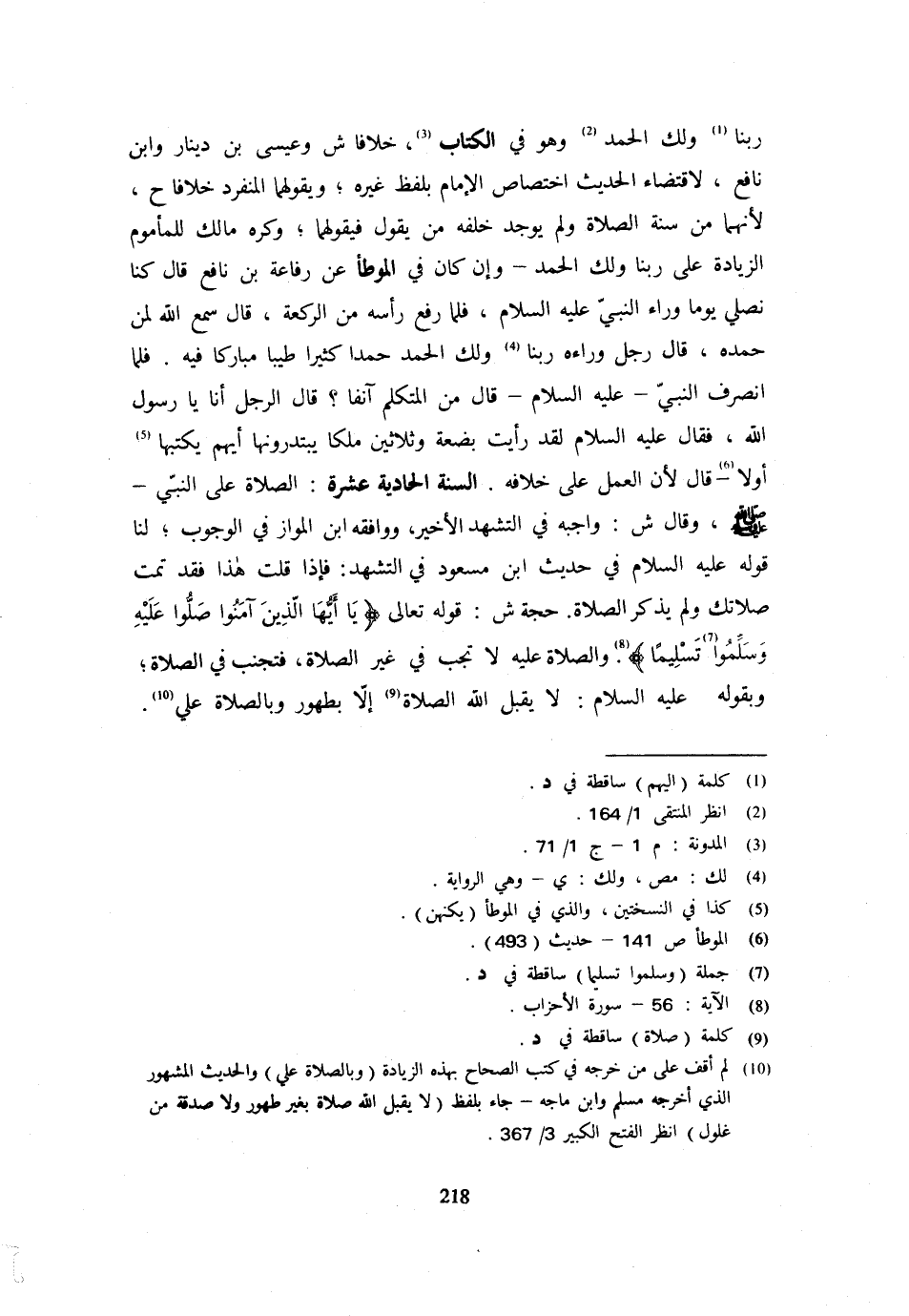 رَبَّنَا وَلَكَ الْحَمْدُ وَهُوَ فِي الْكِتَابِ خِلَافًا ش وَعِيسَى بْنِ دِينَارٍ وَابْنِ نَافِعٍ لِاقْتِضَاءِ الْحَدِيثِ اخْتِصَاصَ الْإِمَامِ بِلَفْظٍ غَيْرِهِ وَيَقُولُهَا الْمُنْفَرِدُ خلافًا ح لِأَنَّهُمَا مِنْ سُنَّةِ الصَّلَاةِ وَلَمْ يُوجَدْ خَلْفَهُ مَنْ يَقُول فيقولهما وَكَرِهَ مَالِكٌ لِلْمَأْمُومِ الزِّيَادَةَ عَلَى رَبَّنَا وَلَكَ الْحَمْدُ وَإِنْ كَانَ فِي الْمُوَطَّأِ عَنْ رِفَاعَةَ بْنِ نَافِعٍ قَالَ كُنَّا نُصَلِّي يَوْمًا وَرَاءَ النَّبِيِّ عَلَيْهِ السَّلَامُ فَلَمَّا رَفَعَ رَأْسَهُ مِنَ الرَّكْعَةِ قَالَ سَمِعَ اللَّهُ لِمَنْ حَمِدَهُ قَالَ رجل وَرَاءه رَبنَا وَلَك الْحَمْدُ حَمْدًا كَثِيرًا طَيِّبًا مُبَارَكًا فِيهِ فَلَمَّا انْصَرَفَ النَّبِيُّ عَلَيْهِ السَّلَامُ قَالَ مَنِ الْمُتَكَلِّمُ آنِفًا؟ قَالَ الرَّجُلُ أَنَا يَا رَسُولَ اللَّهِ فَقَالَ عَلَيْهِ السَّلَامُ لَقَدْ رَأَيْتُ بِضْعَةً وَثَلَاثِينَ مَلِكًا يَبْتَدِرُونَهَا أَيُّهُمْ يَكْتُبُهَا أَوَّلًا قَالَ لِأَنَّ الْعَمَلَ عَلَى خِلَافِهِ السُّنَّةُ الْحَادِيَةَ عَشْرَةَ الصَّلَاةُ عَلَى النَّبِيِّ - صَلَّى اللَّهُ عَلَيْهِ وَسَلَّم َ - وَقَالَ ش وَاجِبُةٌ فِي التَّشَهُّدِ الْأَخِيرِ وَوَافَقَهُ ابْنُ الْمَوَّازِ فِي الْوُجُوبِ لَنَا قَوْلُهُ عَلَيْهِ السَّلَامُ فِي حَدِيثِ ابْنِ مَسْعُودٍ فِي التَّشَهُّدِ فَإِذَا قُلْتَ هَذَا فَقَدَ تَمَّتْ صَلَاتُكَ وَلَمْ يَذْكُرِ الصَّلَاةَ حُجَّةُ ش قَوْله تَعَالَى {يَا أَيُّهَا الَّذِينَ آمَنُوا صَلُّوا عَلَيْهِ وَسَلِّمُوا تَسْلِيمًا} وَالصَّلَاةُ عَلَيْهِ لَا تَجِبُ فِي غَيْرِ الصَّلَاةِ فتجنب فِي الصَّلَاة وَبِقَوْلِهِ عَلَيْهِ السَّلَامُ لَا يَقْبَلُ اللَّهُ الصَّلَاةَ إِلَّا بِطَهُورٍ وَبِالصَّلَاةِ عَلَيَّ