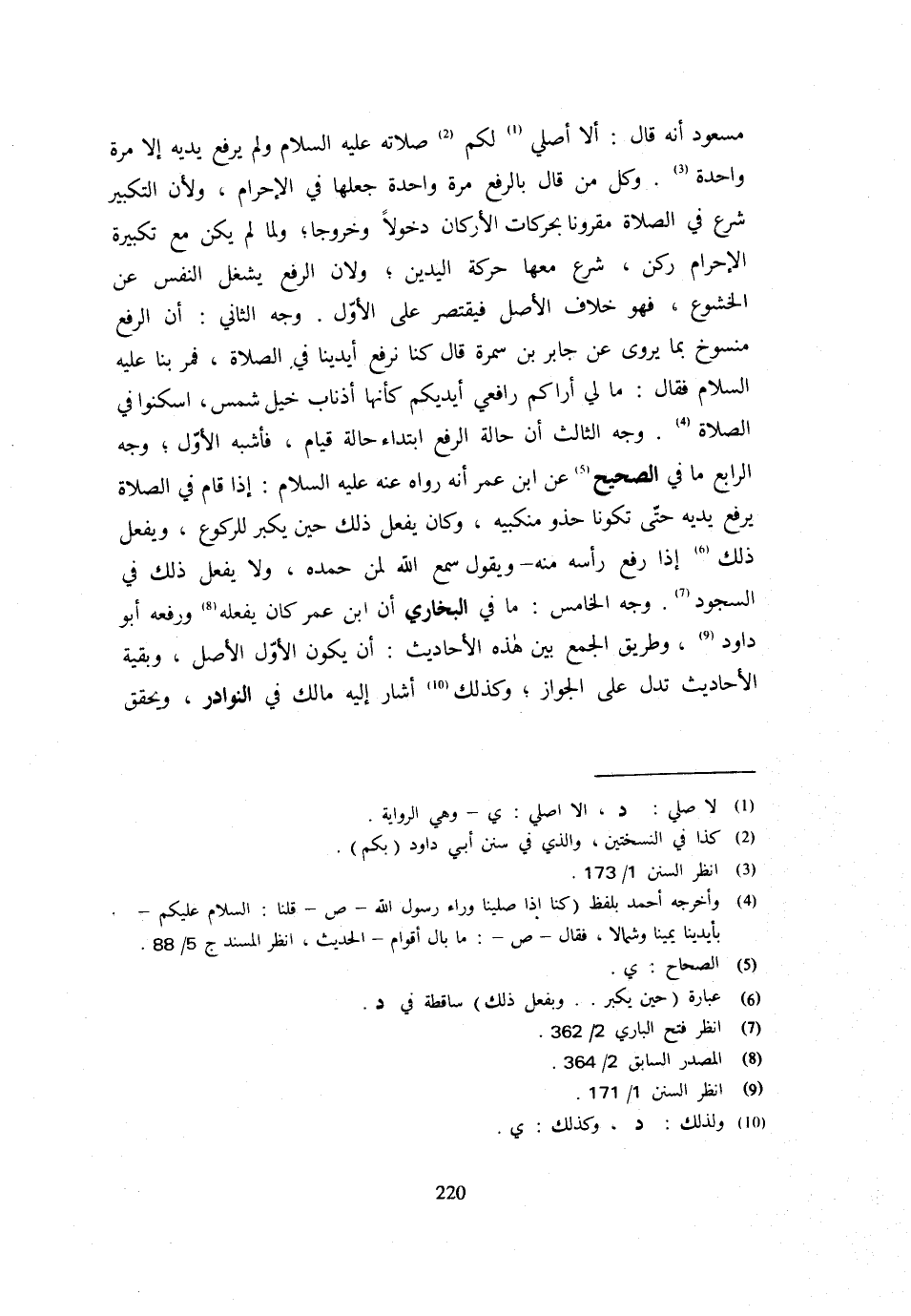 مَسْعُودٍ أَنَّهُ قَالَ أَلَا أُصَلِّي لَكُمْ صَلَاتَهُ عَلَيْهِ السَّلَامُ وَلَمْ يَرْفَعْ يَدَيْهِ إِلَّا مَرَّةً وَاحِدَةً وَكُلُّ مَنْ قَالَ بِالرَّفْعِ مَرَّةً وَاحِدَةً جَعَلَهَا فِي الْإِحْرَامِ وَلِأَنَّ التَّكْبِيرَ شُرِعَ فِي الصَّلَاةِ مَقْرُونًا بِحَرَكَاتِ الْأَرْكَانِ دُخُولًا وَخُرُوجًا وَلَمَّا لَمْ يَكُنْ مَعَ تَكْبِيرَةِ الْإِحْرَامِ رُكْنٌ شُرِعَ مَعَهَا حَرَكَةُ الْيَدَيْنِ وَلِأَنَّ الرَّفْعَ يَشْغَلُ النَّفْسَ عَنِ الْخُشُوعِ فَهُوَ خِلَافُ الْأَصْلِ فَيَقْتَصِرُ عَلَى الْأَوَّلِ وَجْهُ الثَّانِي أَنَّ الرَّفْعَ مَنْسُوخٌ بِمَا يُرْوَى عَنْ جَابِرِ بْنِ سَمُرَةَ قَالَ كُنَّا نَرْفَعُ أَيْدِيَنَا فِي الصَّلَاةِ فَمَرَّ بِنَا عَلَيْهِ السَّلَامُ فَقَالَ مَا لِي أَرَاكُمْ رَافِعِي أَيْدِيكُمْ كَأَنَّهَا أَذْنَابُ خَيْلِ شَمْسٍ اسْكُنُوا فِي الصَّلَاةِ وَجْهُ الثَّالِثُ أَنَّ حَالَةَ الرَّفْعِ ابْتِدَاءُ حَالَةِ قِيَامٍ فَأَشْبَهَ الْأَوَّلَ وَجْهُ الرَّابِعِ مَا فِي الصَّحِيحِ عَنِ ابْنِ عُمَرَ أَنَّهُ رَوَاهُ عَنْهُ عَلَيْهِ السَّلَامُ إِذَا قَامَ فِي الصَّلَاةِ يَرْفَعُ يَدَيْهِ حَتَّى تَكُونَا حَذْوَ مَنْكِبَيْهِ وَكَانَ يَفْعَلُ ذَلِكَ حِينَ يُكَبِّرُ لِلرُّكُوعِ وَيَفْعَلُ ذَلِكَ إِذَا رفع رَأسه مِنْهُ وَيَقُولُ سَمِعَ اللَّهُ لِمَنْ حَمِدَهُ وَلَا يَفْعَلُ ذَلِكَ فِي السُّجُودِ وَجْهُ الْخَامِسِ مَا فِي الْبُخَارِيِّ أَنَّ ابْنَ عُمَرَ كَانَ يَفْعَلُهُ وَرَفَعَهُ أَبُو دَاوُدَ وَطَرِيقُ الْجَمْعِ بَيْنَ هَذِهِ الْأَحَادِيثِ أَنْ يَكُونَ الْأَوَّلُ الْأَصْلَ وَبَقِيَّةُ الْأَحَادِيثِ تَدُلُّ عَلَى الْجَوَازِ وَكَذَلِكَ أَشَارَ إِلَيْهِ مَالِكٌ فِي النَّوَادِر ويحقق