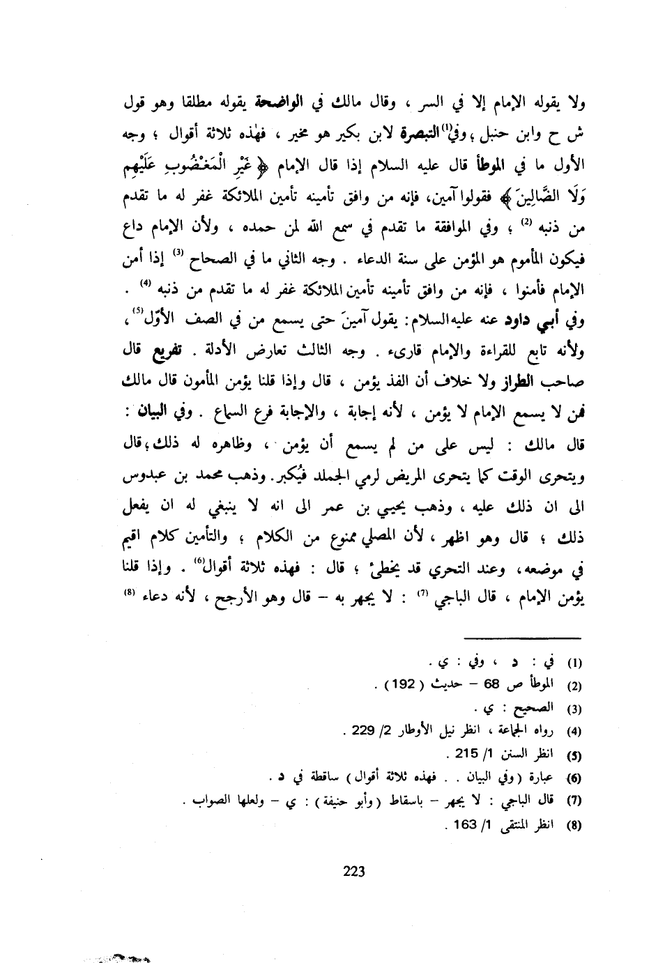 وَلَا يَقُوله الْإِمَامُ إِلَّا فِي السِّرِّ وَقَالَ مَالِكٌ فِي الْوَاضِحَة يَقُوله مُطلقًا وَهُوَ قَول ش ح وَابْنِ حَنْبَلٍ وَفِي التَّبْصِرَةِ لِابْنِ بُكَيْرٍ هُوَ مُخَيَّرٌ فَهَذِهِ ثَلَاثَةُ أَقْوَالٍ وَجْهُ الْأَوَّلِ مَا فِي الْمُوَطَّأِ قَالَ عَلَيْهِ السَّلَامُ إِذَا قَالَ الْإِمَامُ {غَيْرِ الْمَغْضُوبِ عَلَيْهِمْ وَلا الضَّالِّينَ} فَقُولُوا آمِينَ فَإِنَّهُ مَنْ وَافَقَ تَأْمِينُهُ الْمَلَائِكَةَ غُفِرَ لَهُ مَا تَقَدَّمَ مِنْ ذَنْبِهِ وَفِي الْمُوَافَقَةِ مَا تَقَدَّمَ فِي سَمِعَ اللَّهُ لِمَنْ حَمِدَهُ وَلِأَنَّ الْإِمَامَ دَاعٍ فَيَكُونُ الْمَأْمُومُ هُوَ الْمُؤَمِّنُ عَلَى سُنَّةِ الدُّعَاءِ وَجْهُ الثَّانِي مَا فِي الصِّحَاحِ إِذَا أَمَّنَ الْإِمَامُ فَأَمِّنُوا فَإِنَّهُ مَنْ وَافَقَ تَأْمِينُهُ تَأْمِينَ الْمَلَائِكَةِ غُفِرَ لَهُ مَا تَقَدَّمَ مِنْ ذَنْبِهِ وَفِي أَبِي دَاوُدَ عَنْهُ عَلَيْهِ السَّلَامُ يَقُولُ آمِينَ حَتَّى يَسْمَعَ من فِي الصَّفّ الأ , ل وَلِأَنَّهُ تَابِعٌ لِلْقِرَاءَةِ وَالْإِمَامُ قَارِئٌ وَجْهُ الثَّالِثِ تَعَارُضُ الْأَدِلَّةِ تَفْرِيعٌ قَالَ صَاحِبُ الطَّرَّازِ وَلَا خِلَافَ أَنَّ الْفَذَّ يُؤَمِّنُ قَالَ وَإِذَا قُلْنَا يُؤمن قَالَ وَإِذا قُلْنَا يُؤمن الْمَأْمُون قَالَ مَالِكٌ فَمَنْ لَا يَسْمَعُ الْإِمَامَ لَا يُؤَمِّنُ لِأَنَّهُ إِجَابَةٌ وَالْإِجَابَةُ فَرْعُ السَّمَاعِ وَفِي الْبَيَانِ قَالَ مَالِكٌ لَيْسَ عَلَى مَنْ لَمْ يَسْمَعْ أَنْ يُؤَمِّنَ وَظَاهِرُهُ لَهُ ذَلِكَ قَالَ وَيَتَحَرَّى الْوَقْتَ كَمَا يَتَحَرَّى الْمَرِيضُ لِرَمْيِ الْجَمْلَدِ فَيُكَبِّرُ وَذَهَبَ مُحَمَّدُ بْنُ عَبْدُوسٍ إِلَى أَنَّ ذَلِكَ عَلَيْهِ وَذَهَبَ يَحْيَى بْنُ عُمَرَ إِلَى أَنَّهُ لَا يَنْبَغِي لَهُ أَنْ يَفْعَلَ ذَلِكَ قَالَ وَهُوَ أَظْهَرُ لِأَنَّ الْمُصَلِّيَ مَمْنُوعٌ مِنَ الْكَلَامِ وَالتَّأْمِينُ كَلَامٌ أُقِيمَ فِي مَوْضِعِهِ وَعِنْدَ التَّحَرِّي قَدْ يُخْطِئُ قَالَ فَهَذِهِ ثَلَاثَةُ أَقْوَالٍ وَإِذا قُلْنَا يُؤمن الإِمَام قَالَ الْبَاجِيّ لَا يَجْهَرُ بِهِ قَالَ وَهُوَ الْأَرْجَحُ لِأَنَّهُ دُعَاء