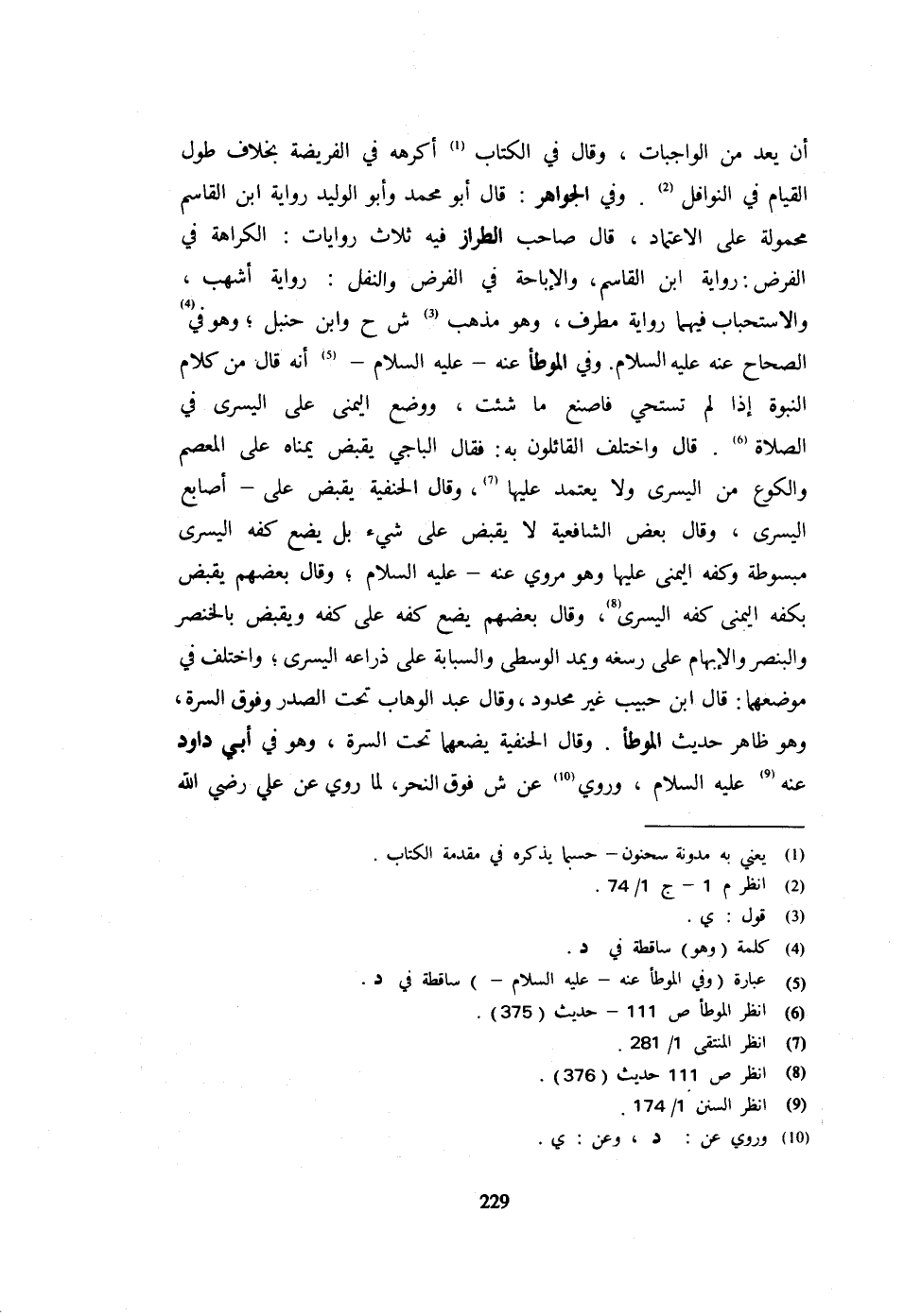 أَنْ يُعَدَّ مِنَ الْوَاجِبَاتِ وَقَالَ فِي الْكِتَابِ أَكْرَهُهُ فِي الْفَرِيضَةِ بِخِلَافِ طُولِ الْقِيَامِ فِي النَّوَافِلِ وَفِي الْجَوَاهِرِ قَالَ أَبُو مُحَمَّدٍ وَأَبُو الْوَلِيدِ رِوَايَةُ ابْنُ الْقَاسِمِ مَحْمُولَةٌ عَلَى الِاعْتِمَادِ قَالَ صَاحِبُ الطَّرَّازِ فِيهِ ثَلَاثُ رِوَايَاتٍ الْكَرَاهَةُ فِي الْفَرْضِ رِوَايَةُ ابْنُ الْقَاسِمِ وَالْإِبَاحَةُ فِي الْفَرْضِ وَالنَّفْلِ رِوَايَةُ أَشْهَبَ وَالِاسْتِحْبَابُ فِيهِمَا رِوَايَةُ مطرف وَهُوَ مَذْهَب ش ح وَابْن حَنْبَل وَهُوَ فِي الصِّحَاح عَنهُ عَلَيْهِ السَّلَام وَفِي الْمُوَطَّأِ عَنْهُ عَلَيْهِ السَّلَامُ أَنَّهُ قَالَ من كَلَام النُّبُوَّة إِذا لم تَسْتَحي فَاصْنَعْ مَا شِئْتَ وَوَضْعُ الْيُمْنَى عَلَى الْيُسْرَى فِي الصَّلَاةِ قَالَ وَاخْتَلَفَ الْقَائِلُونَ بِهِ فَقَالَ الْبَاجِيُّ يَقْبِضُ يُمْنَاهُ عَلَى الْمِعْصَمِ وَالْكُوعِ مِنَ الْيُسْرَى وَلَا يَعْتَمِدُ عَلَيْهَا وَقَالَ الْحَنَفِيَّةُ يَقْبِضُ عَلَى أَصَابِعِ الْيُسْرَى وَقَالَ بَعْضُ الشَّافِعِيَّةِ لَا يَقْبِضُ عَلَى شَيْءٍ بَلْ يَضَعُ كَفَّهُ الْيُسْرَى مبسوطة وكفه الْيُمْنَى عَلَيْهَا وَهُوَ مَرْوِيٌّ عَنْهُ عَلَيْهِ السَّلَامُ وَقَالَ بَعْضُهُمْ يَقْبِضُ بِكَفِّهِ الْيُمْنَى كَفَّهُ الْيُسْرَى وَقَالَ بَعْضُهُمْ يَضَعُ كَفَّهُ عَلَى كَفِّهِ وَيَقْبِضُ بِالْخِنْصَرِ وَالْبِنْصَرِ وَالْإِبْهَامِ عَلَى رُسْغِهِ وَيَمُدُّ الْوُسْطَى وَالسَّبَّابَةَ عَلَى ذِرَاعِهِ الْيُسْرَى وَاخْتُلِفَ فِي مَوْضِعِهِمَا قَالَ ابْنُ حَبِيبٍ غَيْرُ مَحْدُودٍ وَقَالَ عَبْدُ الْوَهَّابِ تَحْتَ الصَّدْرِ وَفَوْقَ السُّرَّةِ وَهُوَ ظَاهِرُ حَدِيثِ الْمُوَطَّأِ وَقَالَ الْحَنَفِيَّةُ يَضَعُهُمَا تَحْتَ السُّرَّةِ وَهُوَ فِي أَبِي دَاوُدَ عَنْهُ عَلَيْهِ السَّلَامُ وَرُوِيَ عَنْ ش فَوْقَ النَّحْرِ لِمَا رُوِيَ عَنْ عَلِيٍّ رَضِيَ اللَّهُ