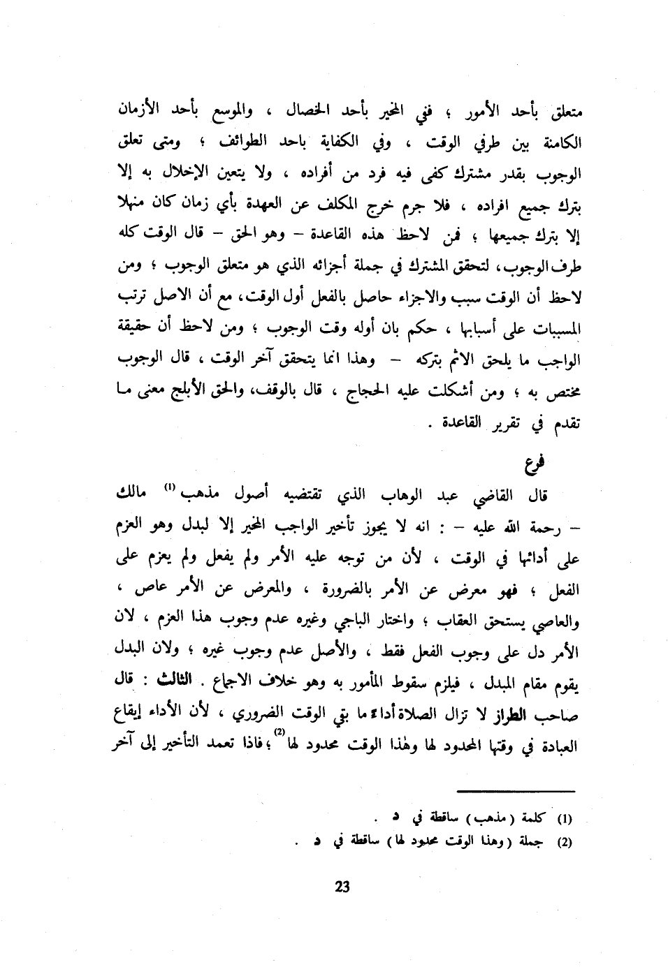 فَرْعٌ قَالَ الْقَاضِي عَبْدُ الْوَهَّابِ الَّذِي تَقْتَضِيهِ أُصُولُ مَذْهَبِ مَالِكٍ رَحْمَةُ اللَّهِ عَلَيْهِ أَنَّهُ لَا يَجُوزُ تَأْخِيرُ الْوَاجِب الْمُخَير إِلَّا لبدل وَهُوَ الْعَزْم على أَدَائِهَا فِي الْوَقْتِ لِأَنَّ مَنْ تَوَجَّهَ عَلَيْهِ الْأَمْرُ وَلَمْ يَفْعَلْ وَلَمْ يَعْزِمْ عَلَى الْفِعْلِ فَهُوَ مُعْرِضٌ عَنِ الْأَمْرِ بِالضَّرُورَةِ وَالْمُعْرِضُ عَنِ الْأَمْرِ عَاصٍ وَالْعَاصِي يَسْتَحِقُّ الْعِقَابَ وَاخْتَارَ الْبَاجِيُّ وَغَيْرُهُ عَدَمُ وُجُوبِ هَذَا الْعَزْمِ لِأَنَّ الْأَمْرَ دَلَّ عَلَى وُجُوبِ الْفِعْلِ فَقَطْ وَالْأَصْلُ عَدَمُ وُجُوبِ غَيره وَلِأَن الْبَدَل يقوم مقَام الْبَدَل فَيَلْزَمُ سُقُوطُ الْمَأْمُورِ بِهِ وَهُوَ خِلَافُ الْإِجْمَاعِ الثَّالِثُ قَالَ صَاحِبُ الطَّرَّازِ لَا تَزَالُ الصَّلَاةُ أَدَاءً مَا بَقِيَ الْوَقْتُ الضَّرُورِيُّ لِأَنَّ الْأَدَاءَ إِيقَاع الْعِبَادَة فِي وَقتهَا الْمَحْدُود لَهَا وَلِهَذَا الْوَقْتُ مَحْدُودٌ لَهَا فَإِذَا تَعَمَّدَ التَّأْخِيرَ إِلَى آخر