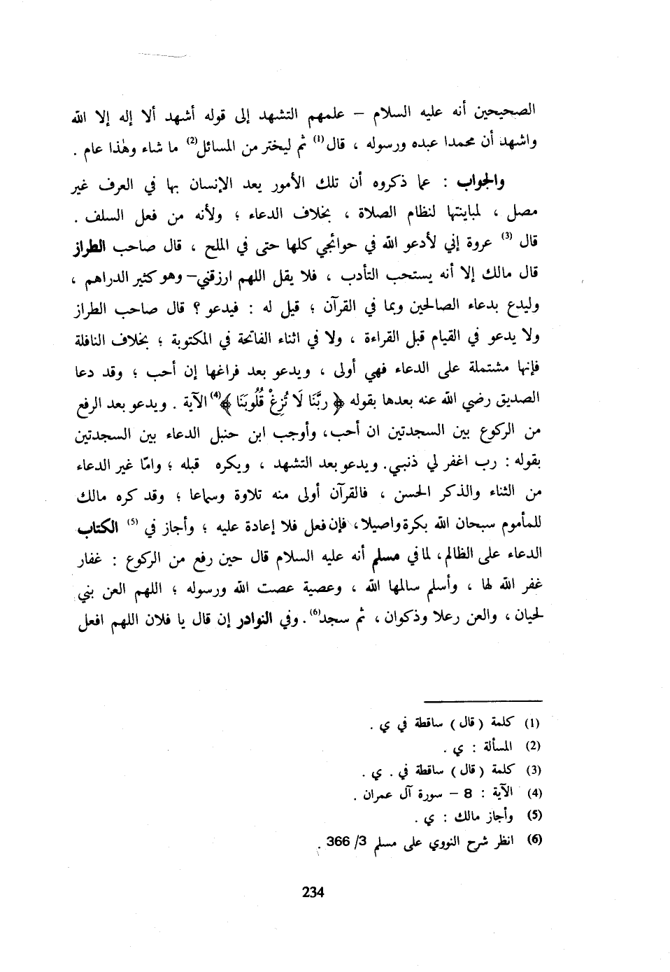 الصَّحِيحَيْنِ أَنَّهُ عَلَيْهِ السَّلَامُ عَلَّمَهُمُ التَّشَهُّدَ إِلَى قَوْله أشهد أَلا إِلَهَ إِلَّا اللَّهُ وَأَشْهَدُ أَنَّ مُحَمَّدًا عَبْدُهُ وَرَسُولُهُ قَالَ ثُمَّ لِيَخْتَرْ مِنَ الْمَسَائِلِ مَا شَاءَ وَهَذَا عَامٌّ وَالْجَوَابُ عَمَّا ذَكَرُوهُ أَنَّ تِلْكَ الْأُمُورَ يُعَدُّ الْإِنْسَانُ بِهَا فِي الْعُرْفِ غَيْرَ مُصَلٍّ لِمُبَايَنَتِهَا لِنِظَامِ الصَّلَاةِ بِخِلَافِ الدُّعَاءِ وَلِأَنَّهُ مِنْ فِعْلِ السَّلَفِ قَالَ عُرْوَةُ إِنِّي لَأَدْعُو اللَّهَ فِي حَوَائِجِي كُلِّهَا حَتَّى فِي الْمِلْحِ قَالَ صَاحِبُ الطَّرَّازِ قَالَ مَالِكٌ إِلَّا أَنَّهُ يُسْتَحَبُّ التَّأَدُّبُ فَلَا يَقُلْ اللَّهُمَّ ارْزُقْنِي وَهُوَ كَثِيرُ الدَّرَاهِمِ وَلْيَدْعُ بِدُعَاءِ الصَّالِحِينَ وَبِمَا فِي الْقُرْآن قيل لَهُ فيدعو قَالَ صَاحِبُ الطَّرَّازِ وَلَا يَدْعُو فِي الْقِيَامِ قَبْلَ الْقِرَاءَةِ وَلَا فِي أَثْنَاءِ الْفَاتِحَةِ فِي الْمَكْتُوبَةِ بِخِلَافِ النَّافِلَةِ فَإِنَّهَا مُشْتَمِلَةٌ عَلَى الدُّعَاءِ فَهِيَ أَوْلَى وَيَدْعُو بَعْدَ فَرَاغِهَا إِنْ أَحَبَّ وَقَدْ دَعَا الصِّدِّيقُ رَضِيَ اللَّهُ عَنْهُ بَعْدَهَا بقوله {رَبنَا لَا تزغ قُلُوبنَا} الْآيَةَ وَيَدْعُو بَعْدَ الرَّفْعِ مِنَ الرُّكُوعِ بَيْنَ السَّجْدَتَيْنِ إِنْ أَحَبَّ وَأَوْجَبَ ابْنُ حَنْبَلٍ الدُّعَاءَ بَيْنَ السَّجْدَتَيْنِ بِقَوْلِهِ رَبِّ اغْفِرْ لِي ذَنْبِي وَيَدْعُو بَعْدَ التَّشَهُّدِ وَيُكْرَهُ قَبْلَهُ وَأَمَّا غَيْرُ الدُّعَاءِ مِنَ الثَّنَاءِ وَالذِّكْرِ الْحَسَنِ فَالْقُرْآنُ أَوْلَى مِنَهُ تِلَاوَةً وَسَمَاعًا وَقَدْ كَرِهَ مَالِكٌ لِلْمَأْمُومِ سُبْحَانَ اللَّهِ بُكْرَةً وَأَصِيلًا فَإِنْ فَعَلَ فَلَا إِعَادَةَ عَلَيْهِ وَأَجَازَ فِي الْكِتَابِ الدُّعَاءَ عَلَى الظَّالِمِ لِمَا فِي مُسْلِمٍ أَنَّهُ عَلَيْهِ السَّلَامُ قَالَ حِينَ رَفَعَ مِنَ الرُّكُوعِ غِفَارٌ غَفَرَ اللَّهُ لَهَا وَأَسْلَمُ سَالَمَهَا اللَّهُ وَعَصِيَّةُ عَصَتِ اللَّهَ وَرَسُولَهُ اللَّهُمَّ الْعَنْ بَنِي لَحْيَانَ وَالْعَنْ رَعْلًا وَذَكْوَانَ ثُمَّ سَجَدَ وَفِي النَّوَادِرِ إِنْ قَالَ يَا فُلَانُ اللَّهُمَّ افْعَلْ