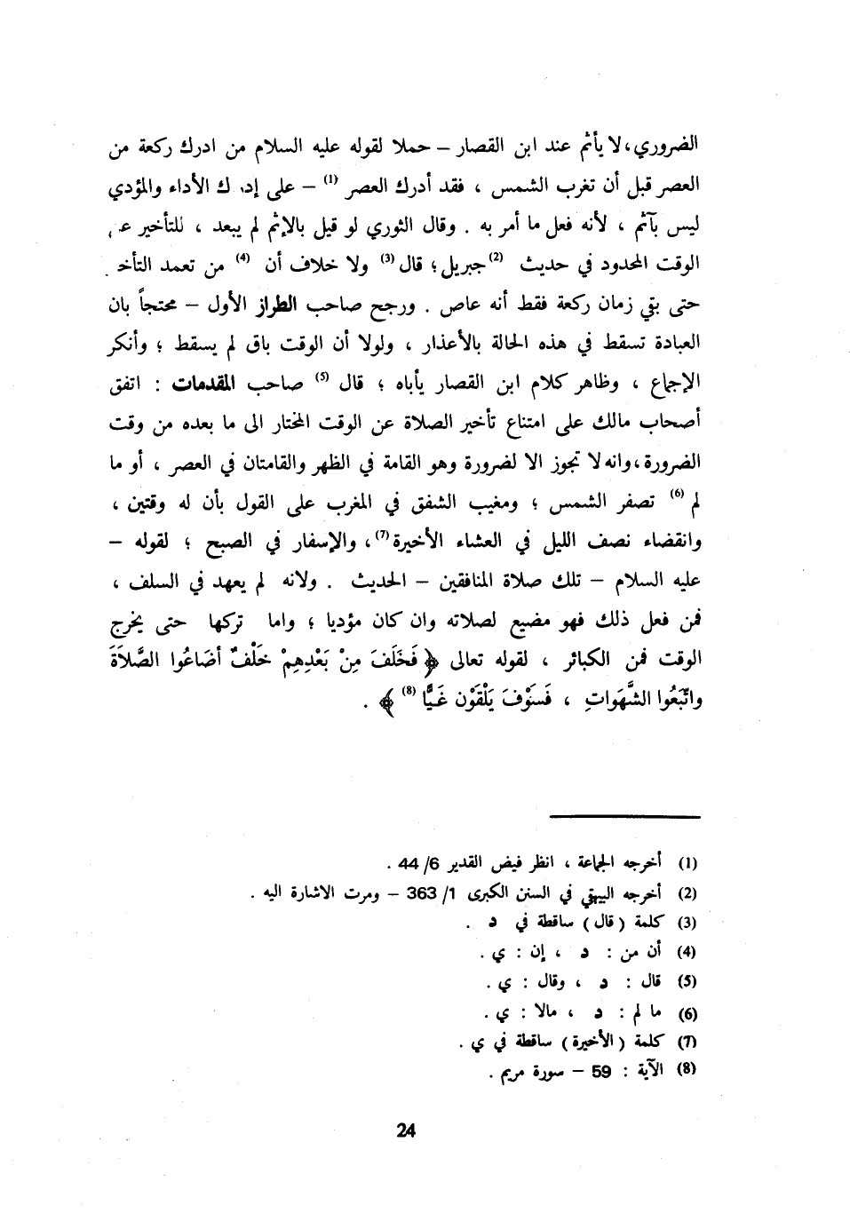 الضَّرُورِيِّ لَا يَأْثَمُ عِنْدَ ابْنِ الْقَصَّارِ حَمَلًا لِقَوْلِهِ عَلَيْهِ السَّلَامُ مَنْ أَدْرَكَ رَكْعَةً مِنَ الْعَصْرِ قَبْلَ أَنْ تَغْرُبَ الشَّمْسُ فَقَدْ أَدْرَكَ الْعَصْرَ عَلَى إِدْرَاكِ الْأَدَاءِ وَالْمُؤَدِّي لَيْسَ بِآثِمٍ لِأَنَّهُ فَعَلَ مَا أُمِرَ بِهِ وَقَالَ الثَّوْرِيُّ لَوْ قِيلَ بِالْإِثْمِ لَمْ يَبْعُدْ لِلتَّأْخِيرِ عَنِ الْوَقْتِ الْمَحْدُودِ فِي حَدِيثِ جِبْرِيلَ قَالَ وَلَا خِلَافَ أَنَّ مَنْ تَعَمَّدَ التَّأْخِيرَ حَتَّى بَقِيَ زَمَانُ رَكْعَةٍ فَقَطْ أَنَّهُ عَاصٍ وَرَجَّحَ صَاحِبُ الطَّرَّازِ الْأَوَّلَ مُحْتَجًّا بِأَنَّ الْعِبَادَةَ تَسْقُطُ فِي هَذِهِ الْحَالَةِ بِالْأَعْذَارِ وَلَوْلَا أَنَّ الْوَقْتَ بَاقٍ لم يسْقط وَأَنْكَرَ الْإِجْمَاعَ وَظَاهِرُ كَلَامِ ابْنِ الْقَصَّارِ يَأْبَاهُ قَالَ صَاحِبُ الْمُقَدِّمَاتِ اتَّفَقَ أَصْحَابُ مَالِكٍ عَلَى امْتِنَاعِ تَأْخِيرِ الصَّلَاةِ عَنِ الْوَقْتِ الْمُخْتَارِ إِلَى مَا بَعْدَهُ مِنْ وَقْتِ الضَّرُورَةِ وَأَنَّهُ لَا تجوز إِلَّا لِضَرُورَةٍ وَهُوَ الْقَامَةُ فِي الظُّهْرِ وَالْقَامَتَانِ فِي الْعَصْرِ أَوْ مَا لَمْ تَصْفَرَّ الشَّمْسُ وَمَغِيبُ الشَّفَقِ فِي الْمَغْرِبِ عَلَى الْقَوْلِ بِأَنَّ لَهُ وَقْتَيْنِ وَانْقِضَاءُ نِصْفِ اللَّيْلِ فِي الْعِشَاءِ الأخيره والإسفار فِي الصُّبْح لقَوْله عَلَيْهِ السَّلَام