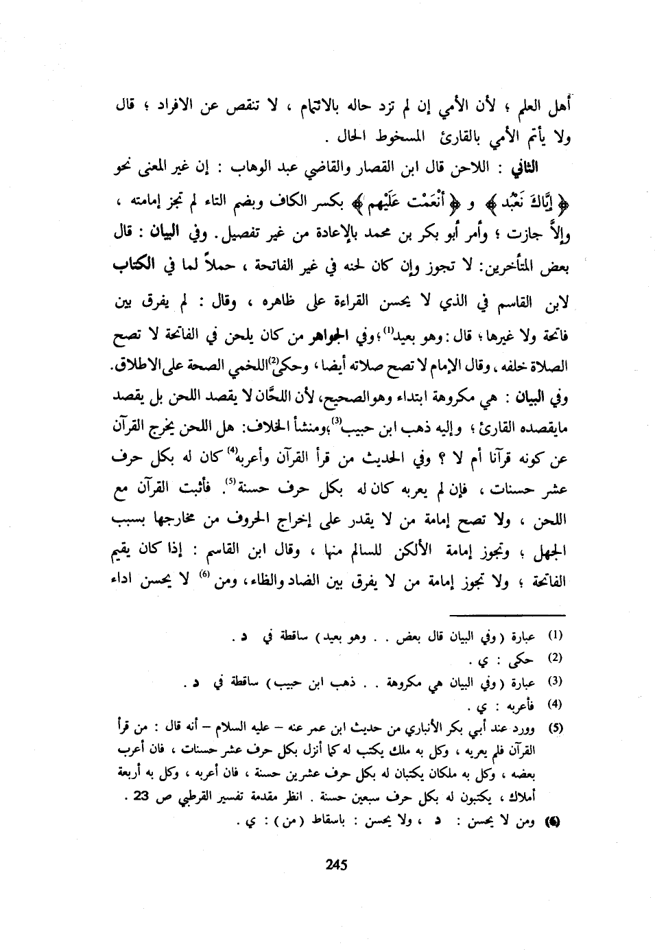 أَهْلِ الْعِلْمِ لِأَنَّ الْأُمِّيَّ إِنْ لَمْ تَزِدْ حَالَة بالإتمام لَا تنقص عَنِ الْإِفْرَادِ قَالَ وَلَا يَأْتَمُّ الْأُمِّيُّ بِالْقَارِئِ المسخوط الْحَال الثَّانِي اللَّاحِنُ قَالَ ابْنُ الْقَصَّارِ وَالْقَاضِي عَبْدُ الْوَهَّابِ إِنْ غَيَّرَ الْمَعْنَى نَحْوَ {إِيَّاكَ نَعْبُدُ} و {أَنْعَمت عَلَيْهِم} بِكَسْرِ الْكَافِ وَبِضَمِّ التَّاءِ لَمْ تَجُزْ إِمَامَتُهُ وَإِلَّا جَازَتْ وَأَمَرَ أَبُو بَكْرِ بْنُ مُحَمَّدٍ بِالْإِعَادَةِ مِنْ غَيْرِ تَفْصِيلٍ وَفِي الْبَيَانِ قَالَ بَعْضُ الْمُتَأَخِّرِينَ لَا تَجُوزُ وَإِنْ كَانَ لَحْنُهُ فِي غَيْرِ الْفَاتِحَةِ حَمْلًا لِمَا فِي الْكِتَابِ لِابْنِ الْقَاسِمِ فِي الَّذِي لَا يُحْسِنُ الْقِرَاءَةَ عَلَى ظَاهِرِهِ وَقَالَ لَمْ يُفَرِّقْ بَيْنَ فَاتِحَةٍ وَلَا غَيْرِهَا قَالَ وَهُوَ بَعِيدٌ وَفِي الْجَوَاهِرِ مَنْ كَانَ يَلْحَنُ فِي الْفَاتِحَةِ لَا تَصِحُّ الصَّلَاةُ خَلْفَهُ وَقَالَ الْإِمَامُ لَا تَصِحُّ صَلَاتُهُ أَيْضًا وَحَكَى اللَّخْمِيُّ الصِّحَّةَ عَلَى الْإِطْلَاقِ وَفِي الْبَيَانِ هِيَ مَكْرُوهَةٌ ابْتِدَاءً وَهُوَ الصَّحِيحُ لِأَنَّ اللَّحَّانَ لَا يَقْصِدُ اللَّحْنَ بَلْ يَقْصِدُ مَا يَقْصِدُهُ الْقَارِئُ وَإِلَيْهِ ذَهَبَ ابْنُ حَبِيبٍ وَمَنْشَأُ الْخِلَافِ هَلِ اللَّحْنُ يُخْرِجُ الْقُرْآنَ عَنْ كَوْنِهِ قُرْآنًا أَمْ لَا وَفِي الْحَدِيثِ مَنْ قَرَأَ الْقُرْآنَ وَأَعْرَبَهُ كَانَ لَهُ بِكُلِّ حَرْفٍ عَشْرُ حَسَنَاتٍ فَإِنْ لَمْ يُعْرِبْهُ كَانَ لَهُ بِكُلِّ حَرْفٍ حَسَنَةٌ فَأَثْبَتَ الْقُرْآنَ مَعَ اللَّحْنِ وَلَا تَصِحُّ إِمَامَةُ مَنْ لَا يَقْدِرُ عَلَى إِخْرَاجِ الْحُرُوفِ مِنْ مَخَارِجِهَا بِسَبَبِ الْجَهْلِ وَتَجُوزُ إِمَامَةُ الْأَلْكَنِ لِلسَّالِمِ مِنْهَا وَقَالَ ابْنُ الْقَاسِمِ إِذَا كَانَ يُقِيمُ الْفَاتِحَةَ وَلَا تَجُوزُ إِمَامَةُ مَنْ لَا يُفَرِّقُ بَيْنَ الضَّادِ وَالظَّاءِ وَمَنْ لَا يحسن أَدَاء