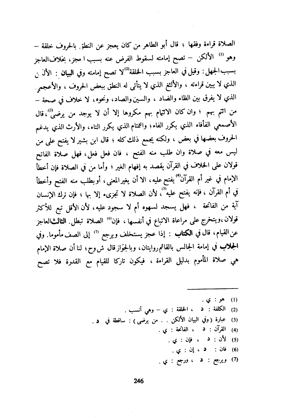 الصَّلَاةِ قِرَاءَةً وَفِقْهًا قَالَ أَبُو الطَّاهِرِ مَنْ كَانَ يَعْجِزُ عَنِ النُّطْقِ بِالْحُرُوفِ خِلْقَةً وَهُوَ الْأَلْكَنُ تَصِحُّ إِمَامَتُهُ لِسُقُوطِ الْفَرْضِ عَنْهُ بِسَبَبِ الْعَجْزِ بِخِلَافِ الْعَاجِزِ بِسَبَبِ الْجَهْلِ وَقِيلَ فِي الْعَاجِز بِسَبَب الْخلقَة لَا تَصِحُّ إِمَامَتُهُ وَفِي الْبَيَانِ الْأَلْكَنُ الَّذِي لَا يُبَيِّنُ قِرَاءَتَهُ وَالْأَلْثَغُ الَّذِي لَا يَتَأَتَّى لَهُ النُّطْقُ بِبَعْضِ الْحُرُوفِ وَالْأَعْجَمِيُّ الَّذِي لَا يُفَرِّقُ بَيْنَ الظَّاءِ وَالضَّادِ وَالسِّينِ وَالصَّادِ وَنَحْوِهُ لَا خِلَافَ فِي صِحَّةِ مَنِ ائْتَمَّ بِهِمْ وَإِنْ كَانَ الِائْتِمَامُ بِهِمْ مَكْرُوهًا إِلَّا أَنْ لَا يُوجَدَ مَنْ يَرْضَى قَالَ الْأَصْمَعِيُّ الْفَأْفَاءُ الَّذِي يُكَرِّرُ الْفَاءَ وَالتَّمْتَامُ الَّذِي يُكَرِّرُ التَّاءَ والأرث الَّذِي يدغم الْحُرُوف بَعْضهَا فِي بعض وَلكنه يجمع ذَلِكَ كُلَّهُ قَالَ ابْنُ بَشِيرٍ لَا يَفْتَحُ على من لَيْسَ مَعَه فِي صَلَاة وَأَن طلب مِنْهُ الْفَتْح فَإِن فعل فعل فَهَل صَلَاةُ الْفَاتِحِ قَوْلَانِ عَلَى الْخِلَافِ فِي الْقُرْآنِ يَقْصِدُ بِهِ إِفْهَامَ الْغَيْرِ وَأَمَّا مَنْ فِي الصَّلَاةِ فَإِنْ أَخْطَأَ الْإِمَامُ فِي غَيْرِ أُمِّ الْقُرْآنِ يَفْتَحُ عَلَيْهِ إِلَّا أَنْ يُغَيِّرَ الْمَعْنَى أَو بِطَلَب مِنْهُ الْفَتْح وَأَخْطَأ فِي أُمِّ الْقُرْآنِ فَإِنَّهُ يَفْتَحُ عَلَيْهِ لِأَنَّ الصَّلَاة لَا تُجزئ إِلَّا بهَا فَإِن تَرَكَ الْإِنْسَانُ آيَةً مِنَ الْفَاتِحَةِ فَهَلْ يَسْجُدُ لِسَهْوِهِ أَمْ لَا سُجُودَ عَلَيْهِ لِأَنَّ الْأَقَلَّ تَبَعٌ لِلْأَكْثَرِ قَوْلَانِ وَيَتَخَرَّجُ عَلَى مُرَاعَاةِ الِاتِّبَاعِ فِي أَنْفسهَا فَإِن الصَّلَاة تبطل الثَّالِثُ الْعَاجِزُ عَنِ الْقِيَامِ قَالَ فِي الْكِتَابِ إِذَا عَجَزَ يَسْتَخْلِفُ وَيَرْجِعُ إِلَى الصَّفِّ مَأْمُومًا وَفِي الْجُلَّابِ فِي إِمَامَةِ الْجَالِسِ بِالْقَائِمِ رِوَايَتَانِ وبالجواز قَالَ ش وح لَنَا أَنَّ صَلَاةَ الْإِمَامِ هِيَ صَلَاةُ الْمَأْمُومِ بِدَلِيلِ الْقِرَاءَةِ فَيَكُونُ تَارِكًا لِلْقِيَامِ مَعَ الْقُدْرَةِ فَلَا تصح
