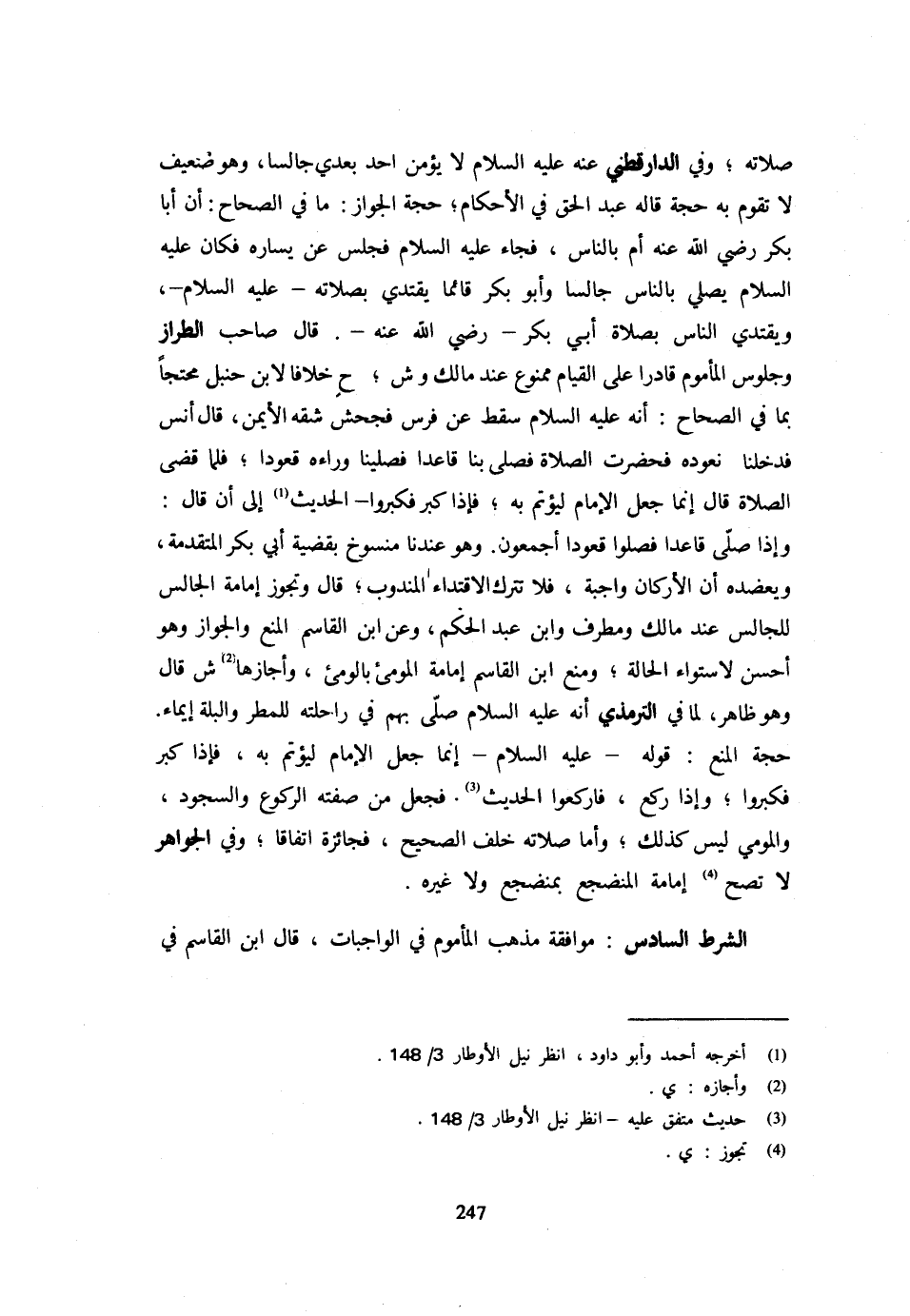 صَلَاتُهُ وَفِي الدَّارَقُطْنِيِّ عَنْهُ عَلَيْهِ السَّلَامُ لَا يَؤُمَّنَّ أَحَدٌ بَعْدِي جَالِسًا وَهُوَ ضَعِيفٌ لَا تَقُومُ بِهِ حُجَّةٌ قَالَهُ عَبْدُ الْحَقِّ فِي الْأَحْكَامِ حُجَّةُ الْجَوَازِ مَا فِي الصِّحَاحِ أَنَّ أَبَا بَكْرٍ رَضِيَ اللَّهُ عَنْهُ أَمَّ بِالنَّاسِ فَجَاءَ عَلَيْهِ السَّلَامُ فَجَلَسَ عَنْ يَسَارِهِ فَكَانَ عَلَيْهِ السَّلَامُ يُصَلِّي بِالنَّاسِ جَالِسًا وَأَبُو بَكْرٍ قَائِمًا يَقْتَدِي بِصَلَاتِهِ عَلَيْهِ السَّلَامُ وَيَقْتَدِي النَّاسُ بِصَلَاةِ أَبِي بَكْرٍ رَضِيَ اللَّهُ عَنْهُ قَالَ صَاحِبُ الطَّرَّازِ وَجُلُوسُ الْمَأْمُومِ قَادِرًا عَلَى الْقِيَامِ مَمْنُوع عِنْد مَالك وش ح خِلَافًا لِابْنِ حَنْبَلٍ مُحْتَجًّا بِمَا فِي الصِّحَاحِ أَنَّهُ عَلَيْهِ السَّلَامُ سَقَطَ عَنْ فَرَسٍ فَجُحِشَ شِقُّهُ الْأَيْمَنُ قَالَ أَنَسٌ فَدَخَلْنَا نَعُودُهُ فَحَضَرَتِ الصَّلَاةُ فَصَلَّى بِنَا قَاعِدًا فَصَلَّيْنَا وَرَاءَهُ قُعُودًا فَلَمَّا قَضَى الصَّلَاةَ قَالَ إِنَّمَا جُعِلَ الْإِمَامُ لِيُؤْتَمَّ بِهِ فَإِذَا كَبَّرَ فَكَبِّرُوا الْحَدِيثَ إِلَى أَنْ قَالَ وَإِذَا صَلَّى قَاعِدًا فَصَلُّوا قعُودا أَجْمَعُونَ وَهُوَ عندنَا مَنْسُوخ بقضية أَبِي بَكْرٍ الْمُتَقَدِّمَةِ وَيُعَضِّدُهُ أَنَّ الْأَرْكَانَ وَاجِبَةٌ فَلَا تتْرك الِاقْتِدَاء الْمَنْدُوبَ قَالَ وَتَجُوزُ إِمَامَةُ الْجَالِسِ لِلْجَالِسِ عِنْدَ مَالِكٍ وَمُطَرِّفٍ وَابْنِ عَبْدِ الْحَكَمِ وَعَنِ ابْنِ الْقَاسِمِ الْمَنْعُ وَالْجَوَازُ وَهُوَ أَحْسَنُ لِاسْتِوَاءِ الْحَالَةِ وَمنع ابْن الْقَاسِم إِمَامَة المومئ بالومئ وَأَجَازَهَا ش قَالَ وَهُوَ ظَاهِرٌ لِمَا فِي التِّرْمِذِيِّ أَنَّهُ عَلَيْهِ السَّلَامُ صَلَّى بِهِمْ فِي رَاحِلَتِهِ لِلْمَطَرِ وَالْبِلَّةِ إِيمَاءً حُجَّةُ الْمَنْعِ قَوْلُهُ عَلَيْهِ السَّلَامُ إِنَّمَا جُعِلَ الْإِمَامُ لِيُؤْتَمَّ بِهِ فَإِذَا كَبَّرَ فَكَبِّرُوا وَإِذَا رَكَعَ فَارْكَعُوا الْحَدِيثَ فَجعل من صفته الرُّكُوع وَالسُّجُود والمومي لَيْسَ كَذَلِكَ وَأَمَّا صَلَاتُهُ خَلْفَ الصَّحِيحِ فَجَائِزَةٌ اتِّفَاقًا وَفِي الْجَوَاهِر لَا تصح إِمَامَة المنضجع بمنضجع وَلَا غَيْرُهُ الشَّرْطُ السَّادِسُ مُوَافَقَةُ مَذْهَبِ الْمَأْمُومِ فِي الْوَاجِبَاتِ قَالَ ابْنُ الْقَاسِمِ فِي