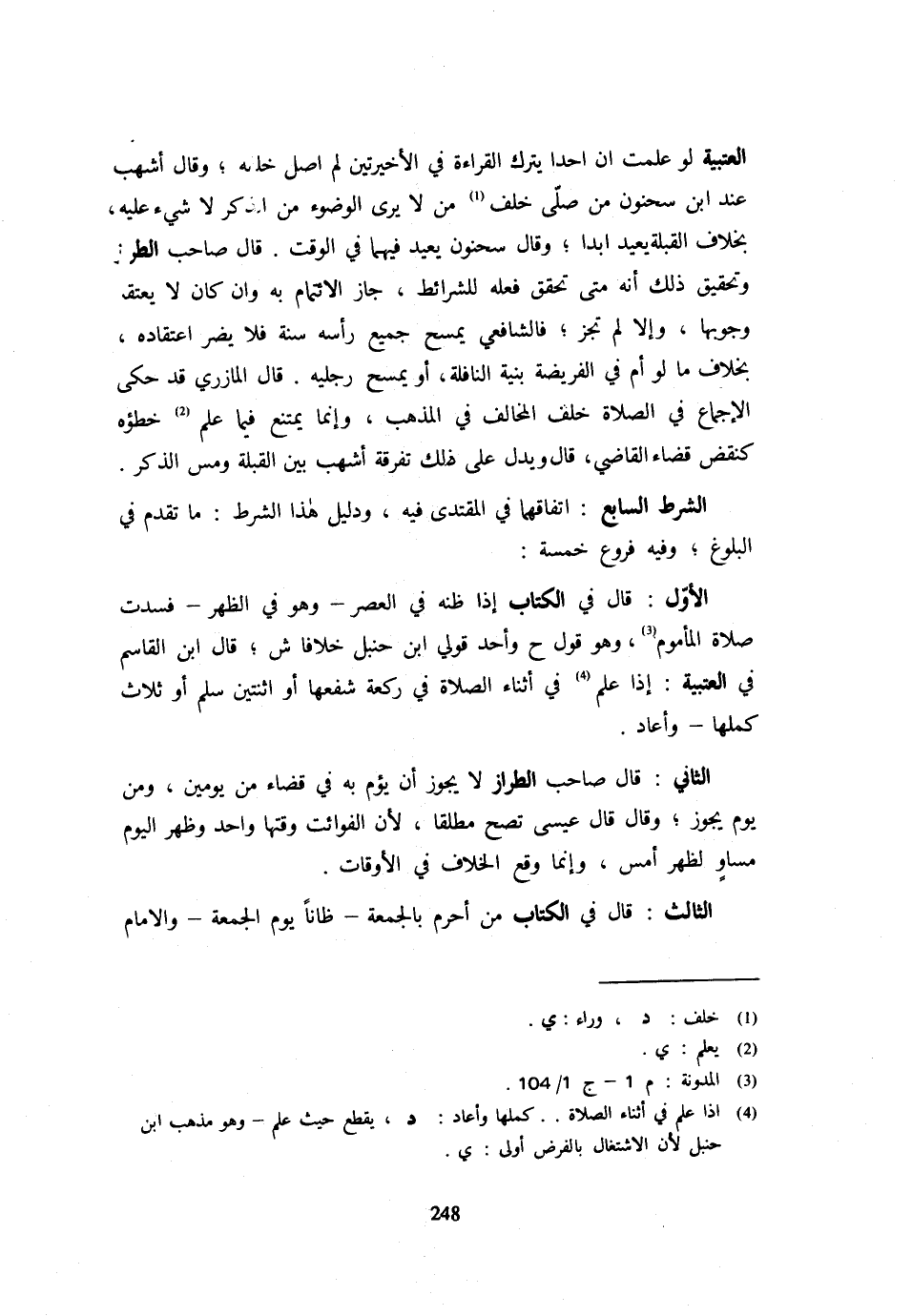 الْعُتْبِيَّةِ لَوْ عَلِمْتُ أَنَّ أَحَدًا يَتْرُكُ الْقِرَاءَةَ فِي الْأَخِيرَتَيْنِ لَمْ أُصَلِّ خَلْفَهُ وَقَالَ أَشْهَبُ عِنْدَ ابْنِ سَحْنُونٍ مَنْ صَلَّى خَلْفَ مَنْ لَا يرى الْوضُوء من الذَّكَرِ لَا شَيْءَ عَلَيْهِ بِخِلَافِ الْقِبْلَةِ يُعِيدُ أَبَدًا وَقَالَ سَحْنُونٌ يُعِيدُ فِيهِمَا فِي الْوَقْتِ قَالَ صَاحِبُ الطَّرَّازِ وَتَحْقِيقُ ذَلِكَ أَنَّهُ مَتَى تَحَقَّقَ فِعْلُهُ لِلشَّرَائِطِ جَازَ الِائْتِمَامُ بِهِ وَإِنْ كَانَ لَا يعْتَقد وُجُوبهَا وَإِلَّا لم تجز فالشافعي يَمْسَحُ جَمِيعَ رَأْسِهِ سُنَّةً فَلَا يَضُرُّ اعْتِقَادُهُ بِخِلَافِ مَا لَوْ أَمَّ فِي الْفَرِيضَةِ بِنِيَّةِ النَّافِلَةِ أَوْ يَمْسَحُ رِجْلَيْهِ قَالَ الْمَازِرِيُّ قَدْ حُكِي الْإِجْمَاعُ فِي الصَّلَاةِ خَلْفَ الْمُخَالِفِ فِي الْمَذْهَبِ وَإِنَّمَا يَمْتَنِعُ فِيمَا عُلِمَ خَطَؤُهُ كَنَقْضِ قَضَاءِ الْقَاضِي قَالَ وَيَدُلُّ عَلَى ذَلِكَ تَفْرِقَةُ أَشْهَبَ بَيْنَ الْقُبْلَةِ وَمَسِّ الذَّكَرِ الشَّرْطُ السَّابِعُ اتِّفَاقُهُمَا فِي الْمُقْتَدَى فِيهِ وَدَلِيلُ هَذَا الشَّرْطِ مَا تَقَدَّمَ فِي الْبُلُوغِ وَفِيهِ فُرُوعٌ خَمْسَةٌ الْأَوَّلُ قَالَ فِي الْكِتَابِ إِذَا ظَنَّهُ فِي الْعَصْرِ وَهُوَ فِي الظُّهْرِ فَسَدَتْ صَلَاةُ الْمَأْمُومِ وَهُوَ قَوْلُ ح وَأَحَدُ قَوْلَيِ ابْنِ حَنْبَلٍ خلافًا ش قَالَ ابْنُ الْقَاسِمِ فِي الْعُتْبِيَّةِ إِذَا عَلِمَ فِي أَثْنَاءِ الصَّلَاةِ فِي رَكْعَةٍ شَفَّعَهَا أَوِ اثْنَتَيْنِ سَلَّمَ أَوْ ثَلَاثٍ كَمَّلَهَا وَأَعَادَ الثَّانِي قَالَ صَاحِبُ الطَّرَّازِ لَا يَجُوزُ أَنْ يَؤُمَّ بِهِ فِي قَضَاءٍ مِنْ يَوْمَيْنِ وَمِنْ يَوْم يجوز وَقَالَ قَالَ عِيسَى تصح مُطْلَقًا لِأَنَّ الْفَوَائِتَ وَقْتُهَا وَاحِدٌ وَظُهْرُ الْيَوْمِ مُسَاوٍ لِظُهْرِ أَمْسِ وَإِنَّمَا وَقَعَ الْخِلَافُ فِي الْأَوْقَات الثَّالِثُ قَالَ فِي الْكِتَابِ مَنْ أَحْرَمَ بِالْجُمُعَةِ ظَانًّا يَوْمَ الْجُمُعَةِ وَالْإِمَامُ