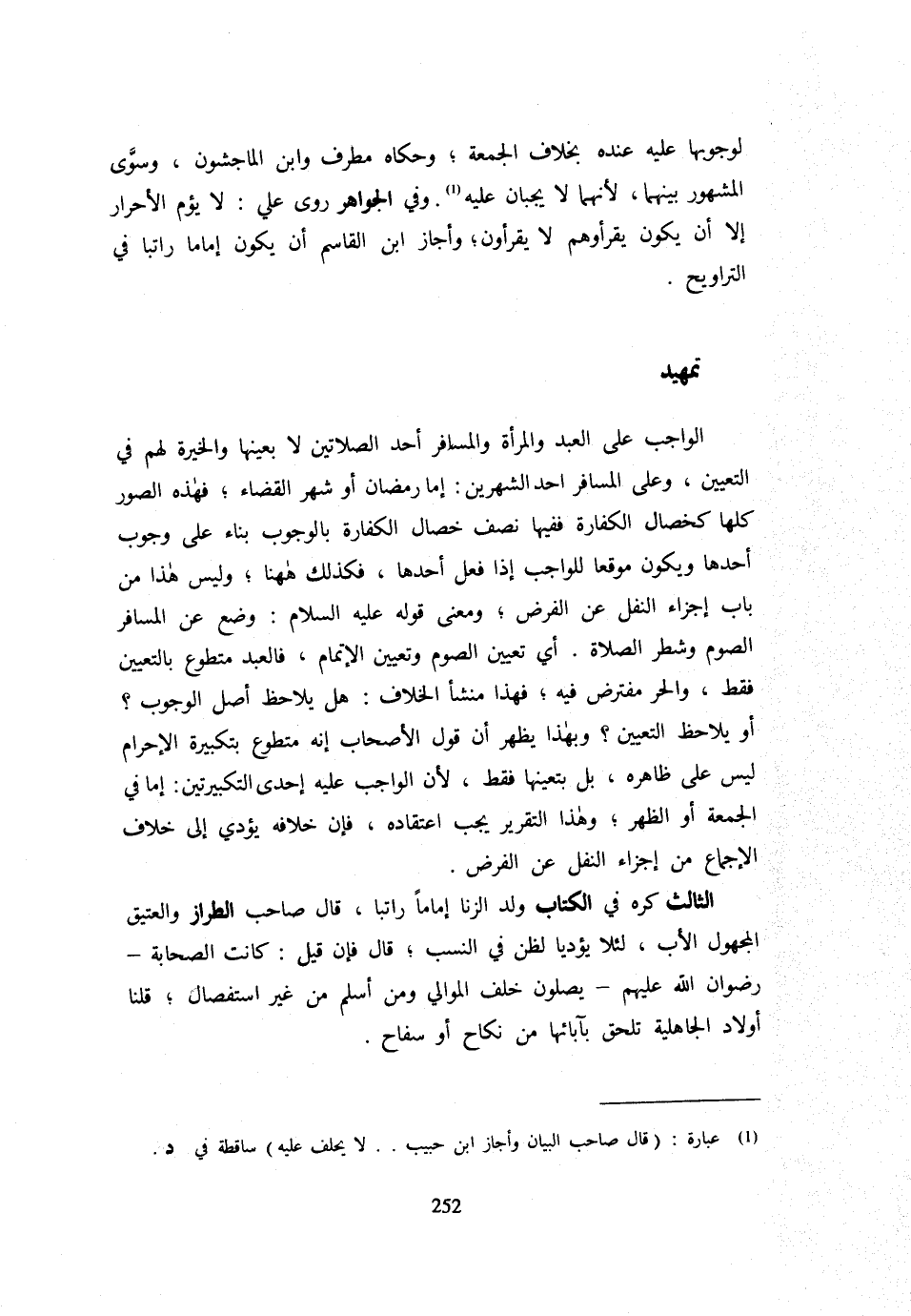 تَمْهِيدٌ الْوَاجِبُ عَلَى الْعَبْدِ وَالْمَرْأَةِ وَالْمُسَافر أحد الصَّلَاتَيْنِ لَا بِعَيْنِهَا وَالْخِيَرَةُ لَهُمْ فِي التَّعْيِينِ وَعَلَى الْمُسَافِرِ أَحَدُ الشَّهْرَيْنِ إِمَّا رَمَضَانُ أَوْ شَهْرُ الْقَضَاءِ فَهَذِهِ الصُّوَرُ كُلُّهَا كَخِصَالِ الْكَفَّارَةِ فَفِيهَا نِصْفُ خِصَالِ الْكَفَّارَةِ بِالْوُجُوبِ بِنَاءً عَلَى وُجُوبِ أَحَدِهَا وَيَكُونُ مُوقِعًا لِلْوَاجِبِ إِذَا فَعَلَ أَحدهَا فَكَذَلِك هَهُنَا وَلَيْسَ هَذَا مِنْ بَابِ إِجْزَاءِ النَّفْلِ عَنِ الْفَرْضِ وَمَعْنَى قَوْلِهِ عَلَيْهِ السَّلَامُ وُضِعَ عَنِ الْمُسَافِرِ الصَّوْمُ وَشَطْرُ الصَّلَاةِ أَيْ تَعْيِينُ الصَّوْمِ وَتَعْيِينُ الْإِتْمَامِ فَالْعَبْدُ مُتَطَوِّعٌ بِالتَّعْيِينِ فَقَطْ وَالْحُرُّ مُفْتَرِضٌ فِيهِ فَهَذَا مَنْشَأُ الْخِلَافِ هَلْ يُلَاحِظُ أَصْلَ الْوُجُوبِ أَوْ يُلَاحِظُ التَّعْيِينَ وَبِهَذَا يَظْهَرُ أَنَّ قَوْلَ الْأَصْحَابِ إِنَّهُ مُتَطَوِّعٌ بِتَكْبِيرَةِ الْإِحْرَامِ لَيْسَ على ظَاهره بل بتعينها فَقَطْ لِأَنَّ الْوَاجِبَ عَلَيْهِ إِحْدَى التَّكْبِيرَتَيْنِ إِمَّا فِي الْجُمُعَةِ أَوِ الظُّهْرِ وَهَذَا التَّقْرِيرُ يَجِبُ اعْتِقَادُهُ فَإِنَّ خِلَافَهُ يُؤَدِّي إِلَى خِلَافِ الْإِجْمَاعِ من إِجْزَاء النَّفْل عَن الْفَرْض الثَّالِثُ كَرِهَ فِي الْكِتَابِ وَلَدَ الزِّنَا إِمَامًا رَاتِبًا قَالَ صَاحِبُ الطَّرَّازِ وَالْعَتِيقَ الْمَجْهُولَ الْأَبِ لِئَلَّا يؤديا لظن فِي النَّسَبِ قَالَ فَإِنْ قِيلَ كَانَتِ الصَّحَابَةُ رِضْوَانُ اللَّهِ عَلَيْهِمْ يُصَلُّونَ خَلْفَ الْمَوَالِي وَمَنْ أَسْلَمَ مِنْ غَيْرِ اسْتِفْصَالٍ قُلْنَا أَوْلَادُ الْجَاهِلِيَّةِ تلْحق بِآبَائِهَا من نِكَاح أَو سفاح