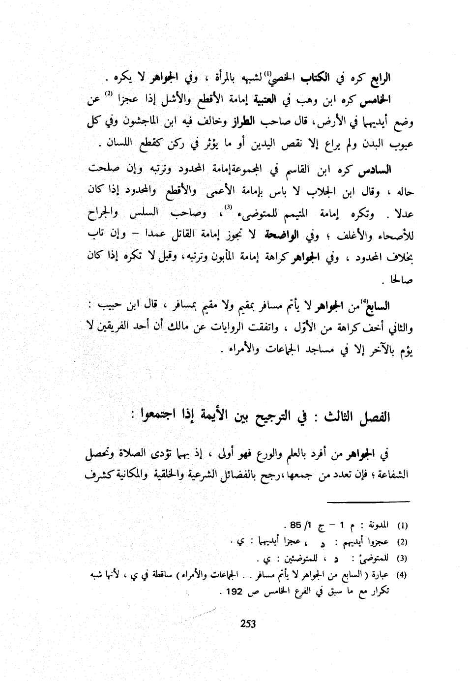 الرَّابِعُ كَرِهَ فِي الْكِتَابِ الْخَصِيَّ لِشَبَهِهِ بِالْمَرْأَةِ وَفِي الْجَوَاهِر لَا يكره الْخَامِسُ كَرِهَ ابْنُ وَهْبٍ فِي الْعُتْبِيَّةِ إِمَامَةَ الْأَقْطَعِ وَالْأَشَلِّ إِذَا عَجَزَا عَنْ وَضْعِ أَيْدِيهِمَا فِي الْأَرْضِ قَالَ صَاحِبُ الطَّرَّازِ وَخَالَفَ فِيهِ ابْنُ الْمَاجِشُونِ وَفِي كُلِّ عُيُوبِ الْبَدَنِ وَلَمْ يُرَاعِ إِلَّا نَقْصَ الْيَدَيْنِ أَوْ مَا يُؤَثِّرُ فِي ركن كَقطع اللِّسَان السَّادِسُ كَرِهَ ابْنُ الْقَاسِمِ فِي الْمَجْمُوعَةِ إِمَامَةَ الْمَحْدُود وترتبه وَإِنْ صَلَحَتْ حَالُهُ وَقَالَ ابْنُ الْجَلَّابِ لَا بَأْسَ بِإِمَامَةِ الْأَعْمَى وَالْأَقْطَعِ وَالْمَحْدُودِ إِذَا كَانَ عَدْلًا وَتُكْرَهُ إِمَامَةُ الْمُتَيَمِّمِ لِلْمُتَوَضِّئِ وَصَاحِبِ السَّلَسِ والجراح للأصحاء والأغلف وَفِي الْوَاضِحَة لَا تجوز إِمَامَةُ الْقَاتِلِ عَمْدًا وَإِنْ تَابَ بِخِلَافِ الْمَحْدُودِ وَفِي الْجَوَاهِر كَرَاهَة إِمَامَة المأبون وترتبه وَقيل لَا تكره إِذا كَانَ صَالحا السَّابِع من الْجَوَاهِرِ لَا يَأْتَمُّ مُسَافِرٌ بِمُقِيمٍ وَلَا مُقِيمٌ بِمُسَافِرٍ قَالَ ابْنُ حَبِيبٍ وَالثَّانِي أَخَفُّ كَرَاهَةً مِنَ الْأَوَّلِ وَاتَّفَقَتِ الرِّوَايَاتُ عَنْ مَالِكٍ أَنَّ أَحَدَ الْفَرِيقَيْنِ لَا يَؤُمُّ بِالْآخَرِ إِلَّا فِي مَسَاجِدِ الْجَمَاعَاتِ وَالْأُمَرَاءِ