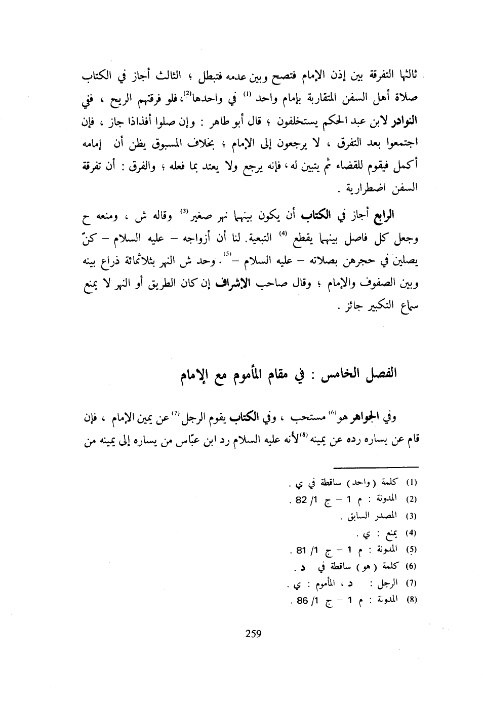 ثَالِثُهَا التَّفْرِقَةُ بَيْنَ إِذْنِ الْإِمَامِ فَتَصِحُّ وَبَيْنَ عَدمه فَتبْطل الثَّالِثُ أَجَازَ فِي الْكِتَابِ صَلَاةَ أَهْلِ السُّفُنِ المتقاربة بِإِمَام وَاحِد فِي وَاحِدهَا فَلَوْ فَرَّقَتْهُمُ الرِّيحُ فَفِي النَّوَادِرِ لِابْنِ عَبْدِ الحكم يستخلفون قَالَ أَبُو طَاهِر وَإِنْ صَلَّوْا أَفْذَاذًا جَازَ فَإِنِ اجْتَمَعُوا بَعْدَ التَّفَرُّقِ لَا يَرْجِعُونَ إِلَى الْإِمَامِ بِخِلَافِ الْمَسْبُوقِ يَظُنُّ أَنَّ إِمَامَهُ أَكْمَلَ فَيَقُومُ لِلْقَضَاءِ ثُمَّ يَتَبَيَّنُ لَهُ فَإِنَّهُ يَرْجِعُ وَلَا يَعْتَدُّ بِمَا فعله وَالْفرق أَن تَفْرِقَة السفن اضطرارية الرَّابِع أجَاز فِي الْكتاب أَن يكون بَينهمَا نَهْرٌ صَغِيرٌ وَقَالَهُ ش وَمَنَعَهُ ح وَجَعَلَ كُلَّ فَاصِلٍ بَيْنَهُمَا يَقْطَعُ التَّبَعِيَّةِ لَنَا أَنَّ أَزْوَاجَهُ عَلَيْهِ السَّلَامُ كُنَّ يُصَلِّينَ فِي حُجُرِهِنَّ بِصَلَاتِهِ عَلَيْهِ السَّلَامُ وَحَدَّ ش النَّهْرَ بِثَلَاثِمِائَةِ ذِرَاع بَينه وَبَين الصُّفُوف وَالْإِمَام وَقَالَ صَاحِبُ الْإِشْرَافِ إِنْ كَانَ الطَّرِيقُ أَوِ النَّهر لَا يمْنَع سَماع التَّكْبِير جَائِز