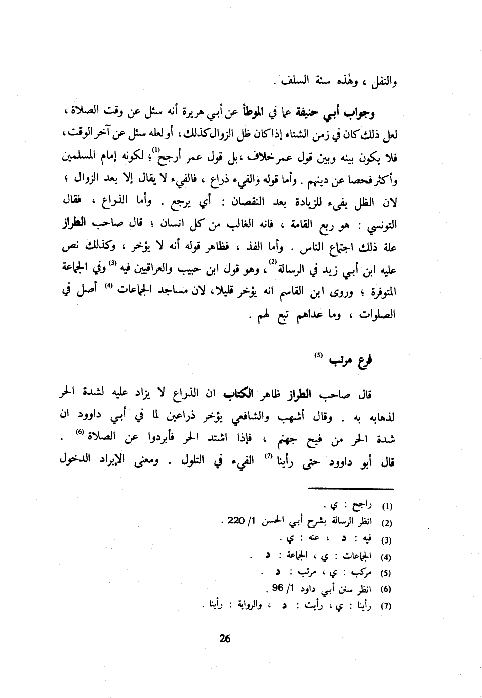 وَالنَّفْل وَهَذِه سنة السّلف وَجَوَاب أبي حنيفَة عَمَّا فِي الْمُوَطَّأِ عَنْ أَبِي هُرَيْرَةَ أَنَّهُ سُئِلَ عَنْ وَقْتِ الصَّلَاةِ لَعَلَّ ذَلِكَ كَانَ فِي زَمَنِ الشِّتَاءِ إِذَا كَانَ ظِلُّ الزَّوَالِ كَذَلِكَ أَوْ لَعَلَّهُ سُئِلَ عَنْ آخِرِ الْوَقْتِ فَلَا يَكُونُ بَيْنَهُ وَبَيْنَ قَوْلِ عُمَرَ خِلَافٌ بَلْ قَوْلُ عُمَرَ أَرْجَحُ لِكَوْنِهِ إِمَامَ الْمُسْلِمِينَ وَأَكْثَرَ فَحْصًا عَنْ دِينِهِمْ وَأَمَّا قَوْلُهُ وَالْفَيْءُ ذِرَاعٌ فَالْفَيْءُ لَا يُقَالُ إِلَّا بَعْدَ الزَّوَالِ لِأَن الظل يفِيء للزِّيَادَة بَعْدَ النُّقْصَانِ أَيْ يَرْجِعُ وَأَمَّا الذِّرَاعُ فَقَالَ التُّونِسِيُّ هُوَ رُبْعُ الْقَامَةِ فَإِنَّهُ الْغَالِبُ مِنْ كُلِّ إِنْسَانٍ قَالَ صَاحِبُ الطَّرَّازِ عِلَّةُ ذَلِكَ اجْتِمَاعُ النَّاسِ وَأَمَّا الْفَذُّ فَظَاهِرُ قَوْلِهِ أَنَّهُ لَا يُؤَخِّرُ وَكَذَلِكَ نَصَّ عَلَيْهِ ابْنُ أَبِي زَيْدٍ فِي الرِّسَالَةِ وَهُوَ قَوْلُ ابْنِ حَبِيبٍ وَالْعِرَاقِيِّينَ فِيهِ وَفِي الْجَمَاعَةِ الْمُتَوَفِّرَةِ وَرَوَى ابْنُ الْقَاسِمِ أَنَّهُ يُؤَخِّرُ قَلِيلًا لِأَنَّ مَسَاجِدَ الْجَمَاعَاتِ أَصْلٌ فِي الصَّلَوَاتِ وَمَا عَدَاهُمْ تَبَعٌ لَهُمْ
