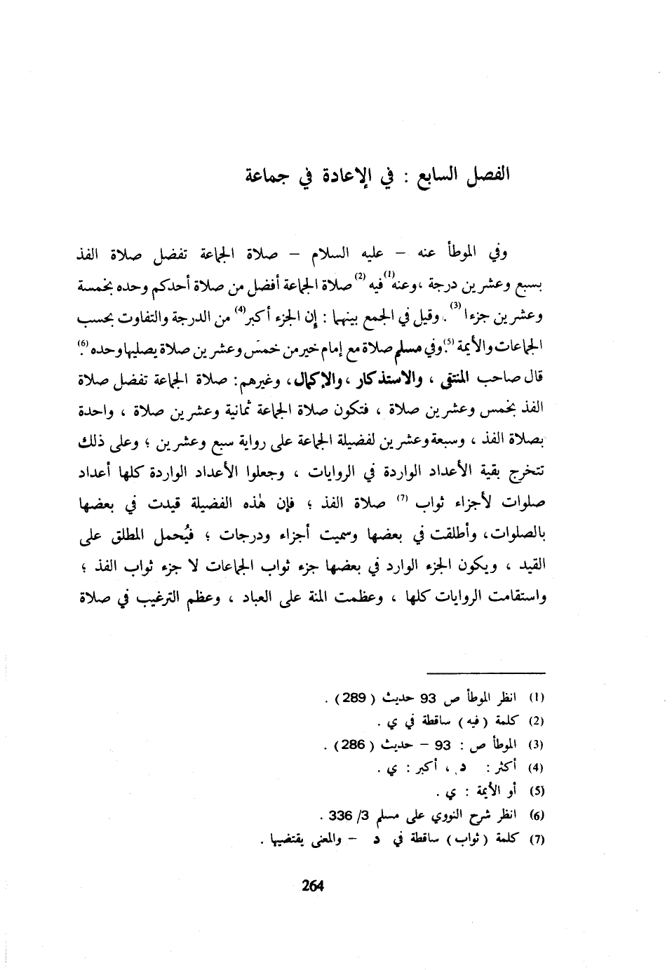 وَفِي الْمُوَطَّأِ عَنْهُ عَلَيْهِ السَّلَامُ صَلَاةُ الْجَمَاعَةِ تَفْضُلُ صَلَاةَ الْفَذِّ بِسَبْعٍ وَعِشْرِينَ دَرَجَةً وَعَنْهُ فِيهِ صَلَاةُ الْجَمَاعَةِ أَفْضَلُ مِنْ صَلَاةِ أَحَدِكُمْ وَحْدَهُ بِخَمْسَةٍ وَعِشْرِينَ جُزْءًا وَقِيلَ فِي الْجَمْعِ بَيْنَهُمَا إِنَّ الْجُزْءَ أَكْبَرُ مِنَ الدَّرَجَةِ وَالتَّفَاوُتُ بِحَسب الْجَمَاعَات وَالْأَيمَة وَفِي مُسْلِمِ صَلَاةٌ مَعَ إِمَامٍ خَيْرٌ مِنْ خَمْسٍ وَعِشْرِينَ صَلَاةً يُصَلِّيهَا وَحْدَهُ قَالَ صَاحِبُ الْمُنْتَقَى وَالِاسْتِذْكَارُ وَالْإِكْمَالُ وَغَيْرِهِمْ صَلَاةُ الْجَمَاعَةِ تَفْضُلُ صَلَاةَ الْفَذِّ بِخَمْسٍ وَعِشْرِينَ صَلَاةً فَتَكُونُ صَلَاةُ الْجَمَاعَة ثَمَانِيَة وَعِشْرِينَ صَلَاةً وَاحِدَةً بِصَلَاةِ الْفَذِّ وَسَبْعَةً وَعِشْرِينَ لِفَضِيلَةِ الْجَمَاعَةِ عَلَى رِوَايَةِ سَبْعٍ وَعِشْرِينَ وَعَلَى ذَلِكَ تَتَخَرَّجُ بَقِيَّةُ الْأَعْدَادِ الْوَارِدَةِ فِي الرِّوَايَاتِ وَجَعَلُوا الْأَعْدَادَ الْوَارِدَةَ كُلَّهَا أَعْدَادَ صَلَوَاتٍ لِأَجْزَاءِ ثَوَابِ صَلَاةِ الْفَذِّ فَإِنَّ هَذِهِ الْفَضِيلَةَ قُيِّدَتْ فِي بَعْضِهَا بِالصَّلَوَاتِ وَأُطْلِقَتْ فِي بَعْضِهَا وَسُمِّيَتْ أَجْزَاءً وَدَرَجَاتٍ فَيُحْمَلُ الْمُطْلَقُ عَلَى الْقَيْدِ وَيَكُونُ الْجُزْءُ الْوَارِدُ فِي بَعْضِهَا جُزْءَ ثَوَابِ الْجَمَاعَاتِ لَا جُزْءَ ثَوَابِ الْفَذِّ وَاسْتَقَامَتِ الرِّوَايَاتُ كُلُّهَا وَعَظُمَتِ الْمِنَّةُ عَلَى الْعِبَادِ وَعَظُمَ التَّرْغِيبُ فِي صَلَاة