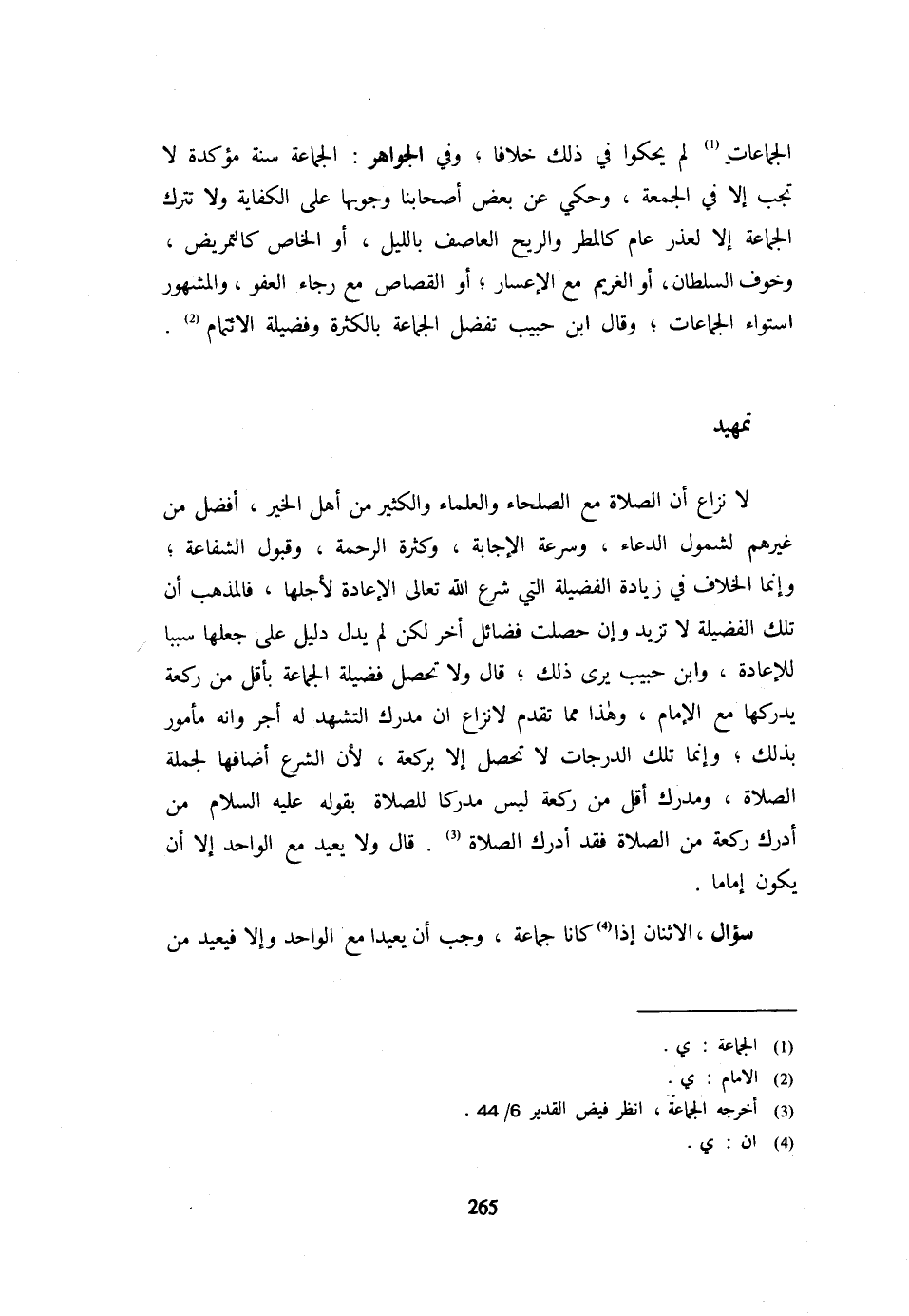 الْجَمَاعَات لَمْ يَحْكُوا فِي ذَلِكَ خِلَافًا وَفِي الْجَوَاهِرِ الْجَمَاعَةُ سُنَّةٌ مُؤَكَّدَةٌ لَا تَجِبُ إِلَّا فِي الْجُمُعَةِ وَحُكِيَ عَنْ بَعْضِ أَصْحَابِنَا وُجُوبُهَا عَلَى الْكِفَايَة وَلَا تتْرك الْجَمَاعَة إِلَّا لعذر عَامٍّ كَالْمَطَرِ وَالرِّيحِ الْعَاصِفِ بِاللَّيْلِ أَوِ الْخَاصِّ كَالتَّمْرِيضِ وَخَوْفِ السُّلْطَانِ أَوِ الْغَرِيمِ مَعَ الْإِعْسَارِ أَوِ الْقِصَاصِ مَعَ رَجَاءِ الْعَفْوِ وَالْمَشْهُورُ اسْتِوَاءُ الْجَمَاعَاتِ وَقَالَ ابْنُ حَبِيبٍ تُفَضَّلُ الْجَمَاعَةُ بِالْكَثْرَةِ وفضيلة الائتمام