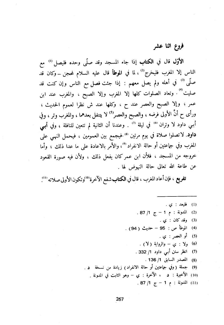 فروع اثْنَا عشر الْأَوَّلُ قَالَ فِي الْكِتَابِ إِذَا جَاءَ الْمَسْجِدَ وَقَدْ صَلَّى وَحْدَهُ فَلْيُصَلِّ مَعَ النَّاسِ إِلَّا الْمَغْرِبَ فَلْيَخْرُجْ لِمَا فِي الْمُوَطَّأِ قَالَ عَلَيْهِ السَّلَامُ لِمِحْجَنٍ وَكَانَ قَدْ صَلَّى فِي أَهْلِهِ وَلَمْ يُصَلِّ مَعَهُمْ إِذَا جِئْتَ فَصَلِّ مَعَ النَّاسِ وَإِنْ كُنْتَ قَدْ صَلَّيْتَ وَتُعَادُ الصَّلَوَاتُ كُلُّهَا إِلَّا الْمَغْرِبَ وَإِلَّا الصُّبْحَ وَالْمَغْرِبَ عِنْدَ ابْن عمر وَإِلَّا الصُّبْح وَالْعَصْرَ عِنْدَ ح وَكُلُّهَا عِنْدَ ش نَظَرًا لِعُمُومِ الْحَدِيثِ وَرَأَى ح أَنَّ الْأُولَى فَرْضُهُ وَالصُّبْحَ وَالْعَصْرَ لَا يَتَنَفَّلُ بَعْدَهُمَا وَالْمَغْرِبَ وِتْرٌ وَفِي أَبِي دَاوُدَ لَا وِتْرَانِ فِي لَيْلَةٍ وَعِنْدَنَا أَنَّ الثَّانِيَةَ لَمْ تَتَعَيَّنْ لِلنَّافِلَةِ وَفِي أَبِي دَاوُدَ لَا تُصَلُّوا صَلَاةً فِي يَوْمٍ مرَّتَيْنِ فَيجمع بَين العمومين فَيحمل النَّهْي على الْمغرب وَفِي جَمَاعَتَيْنِ أَوْ حَالَةِ الِانْفِرَادِ وَالْأَمْرُ بِالْإِعَادَةِ عَلَى مَا عَدَا ذَلِكَ وَأَمَّا خُرُوجُهُ مِنَ الْمَسْجِدِ فَلِأَنَّ ابْنَ عُمَرَ كَانَ يَفْعَلُ ذَلِكَ وَلِأَنَّ فِيهِ صُورَةَ الْقُعُودِ عَنْ طَاعَةِ اللَّهِ تَعَالَى حَالَةَ النُّهُوضِ لَهَا تَفْرِيعٌ فَإِنْ أَعَادَ الْمَغْرِبَ قَالَ فِي الْكتاب شفع الْآخِرَه وَتَكُونُ الْأُولَى صَلَاتُهُ