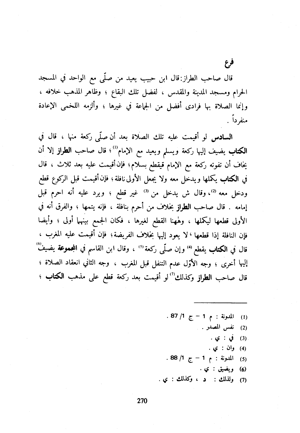 فَرْعٌ قَالَ صَاحِبُ الطَّرَّازِ قَالَ ابْنُ حَبِيبٍ يُعِيدُ مَنْ صَلَّى مَعَ الْوَاحِدِ فِي الْمَسْجِدِ الْحَرَامِ وَمَسْجِدِ الْمَدِينَةِ وَالْمُقَدَّسِ لِفَضْلِ تِلْكَ الْبِقَاعِ وَظَاهِرُ الْمَذْهَبِ خِلَافُهُ وَإِنَّمَا الصَّلَاةُ بِهَا فُرَادَى أَفْضَلُ مِنَ الْجَمَاعَةِ فِي غَيْرِهَا وَأَلْزَمُهُ اللَّخْمِيُّ الْإِعَادَة مُنْفَردا السَّادِسُ لَوْ أُقِيمَتْ عَلَيْهِ تِلْكَ الصَّلَاةُ بَعْدَ أَنْ صَلَّى رَكْعَةً مِنْهَا قَالَ فِي الْكِتَابِ يُضِيفُ إِلَيْهَا رَكْعَةً وَيُسَلِّمُ وَيُعِيدُ مَعَ الْإِمَامِ قَالَ صَاحِبُ الطَّرَّازِ إِلَّا أَنْ يَخَافَ أَنْ تَفُوتَهُ رَكْعَةٌ مَعَ الْإِمَامِ فَيَقْطَعُ بِسَلَامٍ فَإِنْ أُقِيمَتْ عَلَيْهِ بَعْدَ ثَلَاثٍ قَالَ فِي الْكِتَابِ يُكْمِلُهَا وَيَدْخُلُ مَعَهُ وَلَا يَجْعَلُ الْأُولَى نَافِلَةً فَإِنْ أُقِيمَتْ قَبْلَ الرُّكُوعِ قَطَعَ وَدَخَلَ مَعَهُ وَقَالَ ش يَدْخُلُ مِنْ غَيْرِ قَطْعٍ وَيُرَدُّ عَلَيْهِ أَنَّهُ أَحْرَمَ قَبْلَ إِمَامِهِ قَالَ صَاحِبُ الطَّرَّازِ بِخِلَافِ مَنْ أَحْرَمَ بِنَافِلَةٍ فَإِنَّهُ يُتِمُّهَا وَالْفرق أَنه فِي الأولى قطعهَا ليكملها وَهَهُنَا الْقَطْعُ لِغَيْرِهَا فَكَانَ الْجَمْعُ بَيْنَهُمَا أَوْلَى وَأَيْضًا فَإِنَّ النَّافِلَةَ إِذَا قَطَعَهَا لَا يَعُودُ إِلَيْهَا بِخِلَافِ الْفَرِيضَةِ فَإِنْ أُقِيمَتْ عَلَيْهِ الْمَغْرِبُ قَالَ فِي الْكِتَابِ يَقْطَعُ وَإِنْ صَلَّى رَكْعَةً وَقَالَ ابْنُ الْقَاسِمِ فِي الْمَجْمُوعَةِ يُضِيفُ إِلَيْهَا أُخْرَى وَجه الأول عدم التَّنْفِيل قبل الْمغرب وَجْهُ الثَّانِي انْعِقَادُ الصَّلَاةِ قَالَ صَاحِبُ الطَّرَّازِ وَكَذَلِكَ لَوْ أُقِيمَتْ بَعْدَ رَكْعَةٍ قَطَعَ عَلَى مَذْهَب الْكتاب