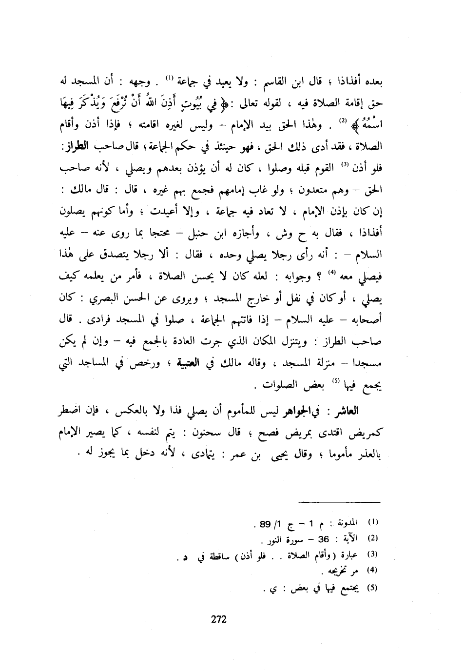 بعده أفذاذا قَالَ ابْن الْقَاسِم وَلَا يُعِيدُ فِي جَمَاعَةٍ وَجْهُهُ أَنَّ الْمَسْجِدَ لَهُ حَقُّ إِقَامَةِ الصَّلَاةِ فِيهِ لِقَوْلِهِ تَعَالَى {فِي بُيُوتٍ أَذِنَ اللَّهُ أَنْ تُرْفَعَ وَيُذْكَرَ فِيهَا اسْمه} وَهَذَا الْحَقُّ بِيَدِ الْإِمَامِ وَلَيْسَ لِغَيْرِهِ إِقَامَتُهُ فَإِذَا أَذَّنَ وَأَقَامَ الصَّلَاةَ فَقَدْ أَدَّى ذَلِكَ الْحَقَّ فَهُوَ حِينَئِذٍ فِي حُكْمِ الْجَمَاعَةِ قَالَ صَاحِبُ الطَّرَّازِ فَلَوْ أَذَّنَ الْقَوْمُ قَبْلَهُ وَصَلَّوْا كَانَ لَهُ أَنْ يُؤَذِّنَ بَعْدَهُمْ وَيُصَلِّيَ لِأَنَّهُ صَاحب الْحق وهم معتدون وَلَوْ غَابَ إِمَامُهُمْ فَجَمَعَ بِهِمْ غَيْرُهُ قَالَ قَالَ مَالِكٌ إِنْ كَانَ بِإِذْنِ الْإِمَامِ لَا تُعَادُ فِيهِ جَمَاعَةٌ وَإِلَّا أُعِيدَتْ وَأَمَّا كَوْنُهُمْ يصلونَ أفذاذا فَقَالَ بِهِ ح وش وَأَجَازَهُ ابْنُ حَنْبَلٍ مُحْتَجًّا بِمَا رُوِيَ عَنْهُ عَلَيْهِ السَّلَامُ أَنَّهُ رَأَى رَجُلًا يُصَلِّي وَحْدَهُ فَقَالَ أَلا رجلا يَتَصَدَّقُ عَلَى هَذَا فَيُصَلِّيَ مَعَهُ؟ وَجَوَابُهُ لَعَلَّهُ كَانَ لَا يُحْسِنُ الصَّلَاةَ فَأَمَرَ مَنْ يُعَلِّمُهُ كَيْفَ يُصَلِّي أَوْ كَانَ فِي نَفْلٍ أَوْ خَارِجَ الْمَسْجِدِ وَيُرْوَى عَنِ الْحَسَنِ الْبَصْرِيِّ كَانَ أَصْحَابه عَلَيْهِ السَّلَام إِذا فَاتَتْهُمْ الْجَمَاعَة صَلَّوْا فِي الْمَسْجِدِ فُرَادَى قَالَ صَاحِبُ الطَّرَّازِ وَيَتَنَزَّلُ الْمَكَانُ الَّذِي جَرَتِ الْعَادَةُ بِالْجَمْعِ فِيهِ وَإِنْ لَمْ يَكُنْ مَسْجِدًا مَنْزِلَةَ الْمَسْجِدِ وَقَالَهُ مَالِكٌ فِي الْعُتْبِيَّةِ وَرَخَّصَ فِي الْمَسَاجِدِ الَّتِي يجمع فِيهَا بعض الصَّلَوَات الْعَاشِرُ فِي الْجَوَاهِرِ لَيْسَ لِلْمَأْمُومِ أَنْ يُصَلِّيَ فَذًّا وَلَا بِالْعَكْسِ فَإِنِ اضْطُرَّ كَمَرِيضٍ اقْتَدَى بِمَرِيضٍ فَصَحَّ قَالَ سَحْنُونٌ يُتِمُّ لِنَفْسِهِ كَمَا يَصِيرُ الْإِمَامُ بِالْعُذْرِ مَأْمُومًا وَقَالَ يَحْيَى بْنُ عُمَرَ يَتَمَادَى لِأَنَّهُ دَخَلَ بِمَا يَجُوزُ لَهُ