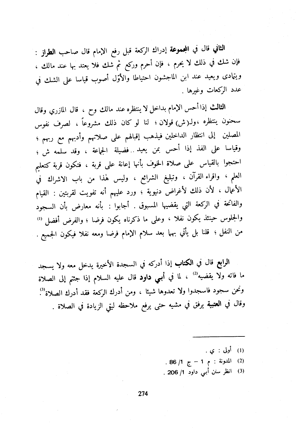 الثَّانِي قَالَ فِي الْمَجْمُوعَةِ إِدْرَاكُ الرَّكْعَةِ قَبْلَ رَفْعِ الْإِمَامِ قَالَ صَاحِبُ الطَّرَّازِ فَإِنْ شَكَّ فِي ذَلِكَ لَا يَحْرُمُ فَإِنْ أَحْرَمَ وَرَكَعَ ثُمَّ شَكَّ فَلَا يَعْتَدُّ بِهَا عِنْدَ مَالِكٍ وَيَتَمَادَى وَيُعِيدُ عِنْدَ ابْنِ الْمَاجِشُونِ احْتِيَاطًا وَالْأَوَّلُ أَصْوَبُ قِيَاسًا عَلَى الشَّكِّ فِي عَدَدِ الرَّكَعَاتِ وَغَيرهَا الثَّالِث إِذا أحس الإِمَام بداخل لَا ينتظره عِنْد مَالك وح قَالَ الْمَازِرِيُّ وَقَالَ سَحْنُونٌ يَنْتَظِرُهُ وَلِ ش قَوْلَانِ لَنَا لَوْ كَانَ ذَلِكَ مَشْرُوعًا لَصَرَفَ نُفُوسَ الْمُصَلِّينَ إِلَى انْتِظَارِ الدَّاخِلِينَ فَيَذْهَبُ إِقْبَالُهُمْ عَلَى صَلَاتِهِمْ وَأَدَبُهُمْ مَعَ رَبِّهِمْ وَقِيَاسًا عَلَى الْفَذ إِذا أحس بِمن يُعِيد فَضِيلَة الْجَمَاعَة وَقد سلمه ش احْتَجُّوا بِالْقِيَاسِ على صَلَاة الْخَوْف بِأَنَّهَا إِعَانَةٌ عَلَى قُرْبَةٍ فَتَكُونُ قُرْبَةً كَتَعْلِيمِ الْعِلْمِ وَإِقْرَاءِ الْقُرْآنِ وَتَبْلِيغِ الشَّرَائِعِ وَلَيْسَ هَذَا مِنْ بَابِ الْإِشْرَاكِ فِي الْأَعْمَالِ لِأَنَّ ذَلِكَ لِأَغْرَاضٍ دُنْيَوِيَّةٍ وَرَدَّ عَلَيْهِمْ أَنَّهُ تَفْوِيتٌ لِقُرْبَتَيْنِ الْقِيَامُ وَالْفَاتِحَةُ فِي الرَّكْعَةِ الَّتِي يَقْضِيهَا الْمَسْبُوقُ أَجَابُوا بِأَنَّهُ مُعَارَضٌ بِأَنَّ السُّجُودَ وَالْجُلُوسَ حِينَئِذٍ يَكُونُ نَفْلًا وَعَلَى مَا ذَكَرْنَاهُ يَكُونُ فَرْضًا وَالْفَرْضُ أَفْضَلُ مِنَ النَّفْلِ قُلْنَا بَلْ يَأْتِي بِهِمَا بَعْدَ سَلَامِ الْإِمَامِ فَرْضًا وَمَعَهُ نَفْلًا فَيَكُونُ الْجَمِيع الرَّابِعُ قَالَ فِي الْكِتَابِ إِذَا أَدْرَكَهُ فِي السَّجْدَةِ الْأَخِيرَةِ يَدْخُلُ مَعَهُ وَلَا يَسْجُدُ مَا فَاتَهُ وَلَا يَقْضِيهِ لِمَا فِي أَبِي دَاوُدَ قَالَ عَلَيْهِ السَّلَامُ إِذَا جِئْتُمْ إِلَى الصَّلَاةِ وَنَحْنُ سُجُودٌ فَاسْجُدُوا وَلَا تَعُدُّوهَا شَيْئًا وَمَنْ أَدْرَكَ الرَّكْعَةَ فَقَدْ أَدْرَكَ الصَّلَاةَ وَقَالَ فِي الْعُتْبِيَّةِ يُرْفِقُ فِي مَشْيِهِ حَتَّى يَرْفَعَ مُلَاحِظَهُ ليقي الزِّيَادَة فِي الصَّلَاة