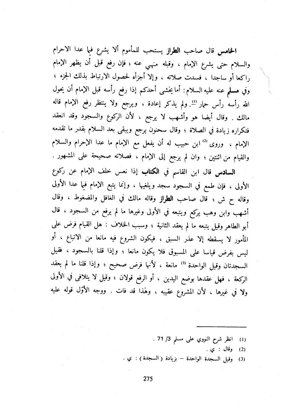 الْخَامِسُ قَالَ صَاحِبُ الطَّرَّازِ يُسْتَحَبُّ لِلْمَأْمُومِ أَلَّا يَشْرَعَ فِيمَا عَدَا الْإِحْرَامِ وَالسَّلَامِ حَتَّى يَشْرَعَ الْإِمَامُ وَقَبْلُهُ مِنَهِيٌّ عَنْهُ فَإِنْ رَفَعَ قَبْلَ أَن يظْهر الْإِمَامُ رَاكِعًا أَوْ سَاجِدًا فَسَدَتْ صَلَاتُهُ وَإِلَّا أَجْزَأَهُ لِحُصُولِ الِارْتِبَاطِ بِذَلِكَ الْجُزْءِ وَفِي مُسْلِمٍ عَنْهُ عَلَيْهِ السَّلَامُ أَمَا يَخْشَى أَحَدُكُمْ إِذَا رَفَعَ رَأْسَهُ قَبْلَ الْإِمَامِ أَنْ يُحَوِّلَ اللَّهُ رَأْسَهُ رَأْسَ حِمَارٍ وَلَمْ يَذْكُرْ إِعَادَةً وَيَرْجِعُ وَلَا يَنْتَظِرُ رَفْعَ الْإِمَامِ قَالَهُ مَالِكٌ وَقَالَ أَيْضًا هُوَ وَأَشْهَبُ لَا يَرْجِعُ لِأَنَّ الرُّكُوعَ وَالسُّجُود وَقد انْعَقَدَ فَتَكْرَارُهُ زِيَادَةٌ فِي الصَّلَاةِ وَقَالَ سَحْنُونٌ يَرْجِعُ وَيَبْقَى بَعْدَ السَّلَامِ بِقَدْرِ مَا تَقَدَّمَهُ الْإِمَامُ وَرَوَى ابْنُ حَبِيبٍ لَهُ أَنْ يَفْعَلَ مَعَ الْإِمَامِ مَا عَدَا الْإِحْرَامَ وَالسَّلَامِ وَالْقِيَامَ مِنِ اثْنَتَيْنِ وَإِنْ لَمْ يَرْجِعْ إِلَى الْإِمَامِ فَصلَاته صَحِيحَة على الْمَشْهُور السَّادِسُ قَالَ ابْنُ الْقَاسِمِ فِي الْكِتَابِ إِذَا نَعَسَ خَلْفَ الْإِمَامِ عَنْ رُكُوعِ الْأُولَى فَإِنْ طَمَعَ فِي السُّجُودِ سَجَدَ وَيُلْغِيهَا وَإِنَّمَا يَتْبَعُ الإِمَام فِيمَا عدا الأولى وَقَالَهُ ح وش قَالَ صَاحِبُ الطَّرَّازِ وَقَالَهُ مَالِكٌ فِي الْغَافِلِ وَالْمَضْغُوطِ وَقَالَ أَشْهَبُ وَابْنُ وَهْبٍ يَرْكَعُ وَيَتْبَعُهُ فِي الْأُولَى وَغَيْرِهَا مَا لَمْ يَرْفَعْ مِنَ السُّجُودِ قَالَ أَبُو الطَّاهِرِ وَقِيلَ يَتْبَعُهُ مَا لَمْ يَعْقِدِ الثَّانِيَةَ وَسَبَبُ الْخِلَافِ هَلِ الْقِيَامُ فرض على الْمَأْمُور لَا يُسْقِطُهُ إِلَّا عُذْرُ السَّبْقِ فَيَكُونُ الشُّرُوعُ فِيهِ مَانِعًا مِنَ الِاتِّبَاعِ أَوْ لَيْسَ بِفَرْضٍ قِيَاسًا عَلَى الْمَسْبُوقِ فَلَا يَكُونُ مَانِعًا وَإِذَا قُلْنَا بِالسُّجُودِ فَقِيلَ السَّجْدَتَانِ وَقِيلَ الْوَاحِدَةُ مَانِعَةٌ لِأَنَّهَا فَرْضٌ صَحِيحٌ وَإِذَا قُلْنَا مَا لَمْ يَعْقِدِ الرَّكْعَةَ فَهَلْ عَقْدُهَا بِوَضْعِ الْيَدَيْنِ أَوِ الرَّفْعِ قَوْلَانِ وَقِيلَ لَا يَتَلَافَى فِي الْأُولَى وَلَا فِي غَيرهَا لِأَن الْمَشْرُوع عَقِيبَهُ وَهَذَا قَدْ فَاتَ وَوَجْهُ الْأَوَّلِ قَوْلُهُ عَلَيْهِ