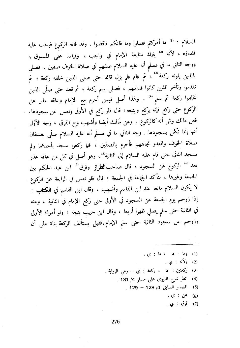 السَّلَامُ مَا أَدْرَكْتُمْ فَصَلُّوا وَمَا فَاتَكُمْ فَاقْضُوا وَقد فَاتَهُ الرُّكُوع فَيجب عَلَيْهِ قَضَاؤُهُ لِأَنَّهُ يَتْرُكُ مُتَابَعَةَ الْإِمَامِ فِي وَاجِبٍ وَقِيَاسًا عَلَى الْمَسْبُوقِ وَوَجْهُ الثَّانِي مَا فِي مُسْلِمٍ أَنَّهُ عَلَيْهِ السَّلَامُ صَفَّهُمْ فِي صَلَاةِ الْخَوْفِ صَفَّيْنِ فَصَلَّى بِالَّذِينَ يَلُونَهُ رَكْعَةً ثُمَّ قَامَ فَلَمْ يَزَلْ قَائِمًا حَتَّى صَلَّى الَّذِينَ خَلْفَهُ رَكْعَةً ثُمَّ تَقَدَّمُوا وَتَأَخَّرَ الَّذِينَ كَانُوا قُدَّامَهُمْ فَصَلَّى بِهِمْ رَكْعَةً ثُمَّ قَعَدَ حَتَّى صَلَّى الَّذِينَ تَخَلَّفُوا رَكْعَةً ثُمَّ سَلَّمَ وَهَذَا أَصْلٌ فِيمَنْ أَحْرَمَ مَعَ الْإِمَامِ وَعَاقَهُ عُذْرٌ عَنِ الرُّكُوعِ حَتَّى رَكَعَ فَإِنَّهُ يَرْكَعُ وَيَتْبَعُهُ قَالَ فَلَوْ رَكَعَ فِي الْأُولَى وَنَعَسَ عَنْ سُجُودِهَا فَعَنْ مَالك وش أَنه كالركوع وَعَن مَالك أَيْضا وَأَشْهَب وح الْفَرْقُ وَجْهُ الْأَوَّلِ أَنَّهَا إِنَّمَا تَكْمُلُ بِسُجُودِهَا وَجْهُ الثَّانِي مَا فِي مُسْلِمٍ أَنَّهُ عَلَيْهِ السَّلَامُ صَلَّى بِعُسْفَانَ صَلَاةَ الْخَوْفِ وَالْعَدُوُّ تُجَاهَهُمْ فَأَحْرَمَ بِالصَّفَّيْنِ فَلَمَّا رَكَعُوا سَجَدَ بِأَحَدِهِمَا وَلَمْ يَسْجُدِ الثَّانِي حَتَّى قَامَ عَلَيْهِ السَّلَامُ إِلَى الثَّانِيَة وَهُوَ أَصْلٌ فِي كُلِّ مَنْ عَاقَهُ عُذْرٌ بَعْدَ الرُّكُوعِ عَنِ السُّجُودِ قَالَ صَاحِبُ الطَّرَّازِ وَفَرَّقَ ابْنُ عَبْدِ الْحَكَمِ بَيْنَ الْجُمُعَةِ وَغَيْرِهَا لِتَأَكُّدِ الْجَمَاعَةِ فِي الْجُمُعَةِ قَالَ فَلَوْ نَعَسَ فِي الرَّابِعَةِ عَنِ الرُّكُوعِ لَا يَكُونُ السَّلَامُ مَانِعًا عِنْدَ ابْنِ الْقَاسِمِ وَأَشْهَبَ وَقَالَ ابْنُ الْقَاسِمِ فِي الْكِتَابِ إِذَا زُوحِمَ يَوْمَ الْجُمُعَةِ عَنِ السُّجُودِ فِي الْأُولَى حَتَّى رَكَعَ الْإِمَامُ فِي الثَّانِيَةِ وَعَنْهُ فِي الثَّانِيَةِ حَتَّى سَلَّمَ يُصَلِّي ظُهْرًا أَرْبَعًا وَقَالَ ابْنُ حَبِيبٍ يَتْبَعُهُ وَلَوْ أَدْرَكَ الْأُولَى وَزُوحِمَ عَنْ سُجُودِ الثَّانِيَةِ حَتَّى سَلَّمَ الْإِمَامُ فَقِيلَ يَسْتَأْنِفُ الرَّكْعَةَ بِنَاءً عَلَى أَن