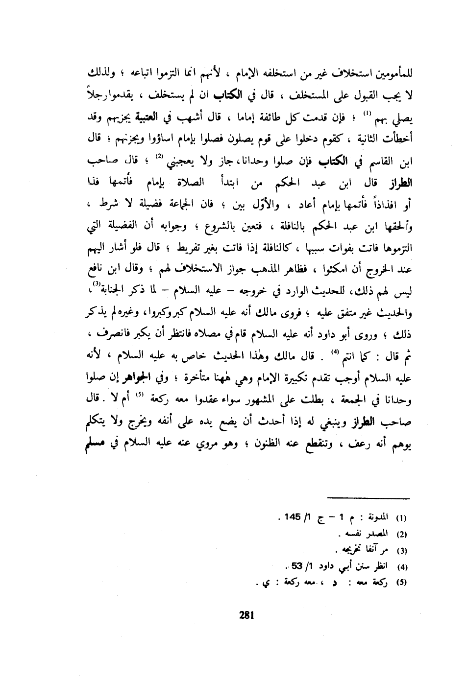 لِلْمَأْمُومِينَ اسْتِخْلَافُ غَيْرِ مَنِ اسْتَخْلَفَهُ الْإِمَامُ لِأَنَّهُمْ إِنَّمَا الْتَزَمُوا اتِّبَاعَهُ وَلِذَلِكَ لَا يَجِبُ الْقَبُولُ عَلَى الْمُسْتَخْلَفِ قَالَ فِي الْكِتَابِ إِنْ لَمْ يسْتَخْلف يقدموا رَجُلًا يُصَلِّي بِهِمْ فَإِنْ قَدَّمَتْ كُلُّ طَائِفَةٍ إِمَامًا قَالَ أَشهب فِي الْعُتْبِيَّة يجزيهم وَقَدْ أَخْطَأَتِ الثَّانِيَةُ كَقَوْمٍ دَخَلُوا عَلَى قَوْمٍ يصلونَ فصلوا بِإِمَام اساؤوا ويجزنهم قَالَ ابْن الْقَاسِم فِي الْكتاب فَإِن صَلَّوْا وُحْدَانًا جَازَ وَلَا يُعْجِبُنِي قَالَ صَاحِبُ الطَّرَّازِ قَالَ ابْنُ عَبْدِ الْحَكَمِ مَنِ ابْتَدَأَ الصَّلَاة بِإِمَام فأتمها فَذا أَو افذاذا فَأَتَمَّهَا بِإِمَامٍ أَعَادَ وَالْأَوَّلُ بَيِّنٌ فَإِنَّ الْجَمَاعَةَ فَضِيلَةٌ لَا شَرْطٌ وَأَلْحَقَهَا ابْنُ عَبْدِ الْحَكَمِ بالنافلة فَتعين بِالشُّرُوعِ وَجَوَابُهُ أَنَّ الْفَضِيلَةَ الَّتِي الْتَزَمُوهَا فَاتَتْ بِفَوَاتِ سَبَبِهَا كَالنَّافِلَةِ إِذَا فَاتَتْ بِغَيْرِ تَفْرِيطٍ قَالَ فَلَوْ أَشَارَ إِلَيْهِمْ عِنْدَ الْخُرُوجِ أَنِ امْكُثُوا فَظَاهِرُ الْمَذْهَبِ جَوَازُ الِاسْتِخْلَافِ لَهُمْ وَقَالَ ابْنُ نَافِعٍ لَيْسَ لَهُمْ ذَلِكَ لِلْحَدِيثِ الْوَارِدِ فِي خُرُوجِهِ عَلَيْهِ السَّلَامُ لَمَّا ذَكَرَ الْجَنَابَةَ والْحَدِيث غير مُتَّفَقٌ عَلَيْهِ فَرَوَى مَالِكٌ أَنَّهُ عَلَيْهِ السَّلَامُ كَبَّرَ وَكَبَّرُوا وَغَيْرُهُ لَمْ يَذْكُرْ ذَلِكَ وَرَوَى أَبُو دَاوُدَ أَنَّهُ عَلَيْهِ السَّلَامُ قَامَ فِي مُصَلَّاهُ فَانْتَظَرَ أَنْ يُكَبِّرَ فَانْصَرَفَ ثُمَّ قَالَ كَمَا أَنْتُمْ قَالَ مَالِكٌ وَهَذَا الْحَدِيثُ خَاصٌّ بِهِ عَلَيْهِ السَّلَامُ لِأَنَّهُ عَلَيْهِ السَّلَامُ أَوْجَبَ تقدم تَكْبِيرَة الإِمَام وَهِي هَهُنَا مُتَأَخِّرَة وَفِي الْجَوَاهِرِ إِنْ صَلَّوْا وُحْدَانًا فِي الْجُمُعَةِ بَطَلَتْ عَلَى الْمَشْهُورِ سَوَاءٌ عَقَدُوا مَعَهُ رَكْعَةً أَمْ لَا قَالَ صَاحِبُ الطَّرَّازِ وَيَنْبَغِي لَهُ إِذَا أَحْدَثَ أَنْ يَضَعَ يَدَهُ عَلَى أَنْفِهِ وَيَخْرُجَ وَلَا يَتَكَلَّمَ يُوهِمُ أَنَّهُ رَعَفَ وَتَنْقَطِعُ عَنْهُ الظُّنُونُ وَهُوَ مَرْوِيٌّ عَنْهُ عَلَيْهِ السَّلَامُ فِي مُسلم