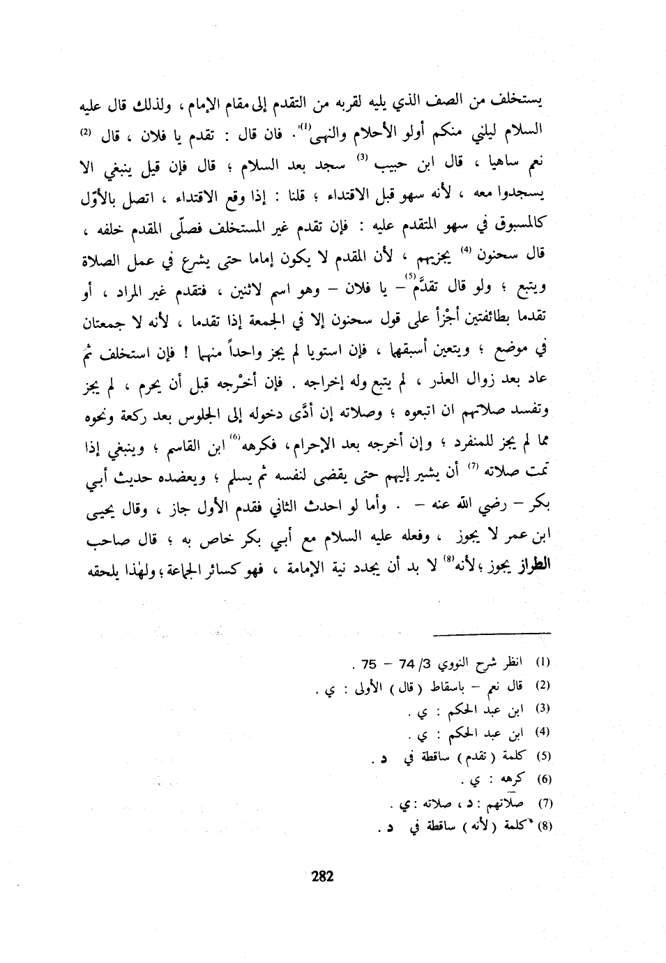 يسْتَخْلف مِنَ الصَّفِّ الَّذِي يَلِيهِ لِقُرْبِهِ مِنَ التَّقَدُّمِ إِلَى مَقَامِ الْإِمَامِ وَلِذَلِكَ قَالَ عَلَيْهِ السَّلَامُ ليلني مِنْكُمْ أُولُو الْأَحْلَامِ وَالنُّهَى فَإِنْ قَالَ تَقَدَّمْ يَا فُلَانُ قَالَ نَعَمْ سَاهِيًا قَالَ ابْنُ حَبِيبٍ سَجَدَ بَعْدَ السَّلَامِ قَالَ فَإِنْ قِيلَ يَنْبَغِي أَلَّا يَسْجُدُوا مَعَهُ لِأَنَّهُ سَهْوٌ قَبْلَ الِاقْتِدَاءِ قُلْنَا إِذَا وَقَعَ الِاقْتِدَاءُ اتَّصَلَ بِالْأَوَّلِ كَالْمَسْبُوقِ فِي سَهْوِ الْمُتَقَدِّمِ عَلَيْهِ فَإِنْ تَقَدَّمَ غيرالمستخلف فصلى الْمُقدم خَلفه قَالَ سَحْنُون يجزيهم لِأَنَّ الْمُقَدَّمَ لَا يَكُونُ إِمَامًا حَتَّى يَشْرَعَ فِي عَمَلِ الصَّلَاةِ وَيُتَّبَعَ وَلَوْ قَالَ تَقَدَّمْ يَا فُلَانُ وَهُوَ اسْمٌ لِاثْنَيْنِ فَتَقَدَّمَ غَيْرُ الْمُرَادِ أَوْ تَقَدَّمَا بِطَائِفَتَيْنِ أَجْزَأَ عَلَى قَوْلِ سَحْنُونٍ إِلَّا فِي الْجُمُعَةِ إِذَا تَقَدَّمَا لِأَنَّهُ لَا جُمْعَتَانِ فِي مَوْضِعٍ وَيَتَعَيَّنُ أَسْبَقُهُمَا فَإِنِ اسْتَوَيَا لَمْ يُجِزْ وَاحِدًا مِنَهُمَا فَإِنِ اسْتَخْلَفَ ثمَّ عَاد بعد زَوَال الْعذر لم يتبع وَله إِخْرَاجُهُ فَإِنْ أَخْرَجَهُ قَبْلَ أَنْ يُحْرِمَ لَمْ يَجُزْ وَتَفْسُدُ صَلَاتُهُمْ إِنِ اتَّبَعُوهُ وَصَلَاتُهُ إِنْ أَدَّى دُخُولُهُ إِلَى الْجُلُوسِ بَعْدَ رَكْعَةٍ وَنَحْوِهُ مِمَّا لَمْ يَجُزْ لِلْمُنْفَرِدِ وَإِنْ أَخْرَجَهُ بَعْدَ الْإِحْرَامِ فَكَرِهَهُ ابْنُ الْقَاسِمِ وَيَنْبَغِي إِذَا تَمَّتْ صَلَاتُهُ أَنْ يُشِيرَ إِلَيْهِمْ حَتَّى يَقْضِيَ لِنَفْسِهِ ثُمَّ يُسَلِّمَ وَيُعَضِّدُهُ حَدِيثُ أَبِي بَكْرٍ رَضِيَ اللَّهُ عَنْهُ وَأَمَّا لَوْ أَحْدَثَ الثَّانِي فَقَدَّمَ الأول جَازَ وَقَالَ يحيى ابْن عمر لَا يَجُوزُ وَفِعْلُهُ عَلَيْهِ السَّلَامُ مَعَ أَبِي بَكْرٍ خَاصٌّ بِهِ قَالَ صَاحِبُ الطَّرَّازِ يَجُوزُ لِأَنَّهُ لَا بُدَّ أَنْ يُجَدِّدَ نِيَّةَ الْإِمَامَةِ فَهُوَ كَسَائِرِ الْجَمَاعَةِ وَلِهَذَا يَلْحَقُهُ