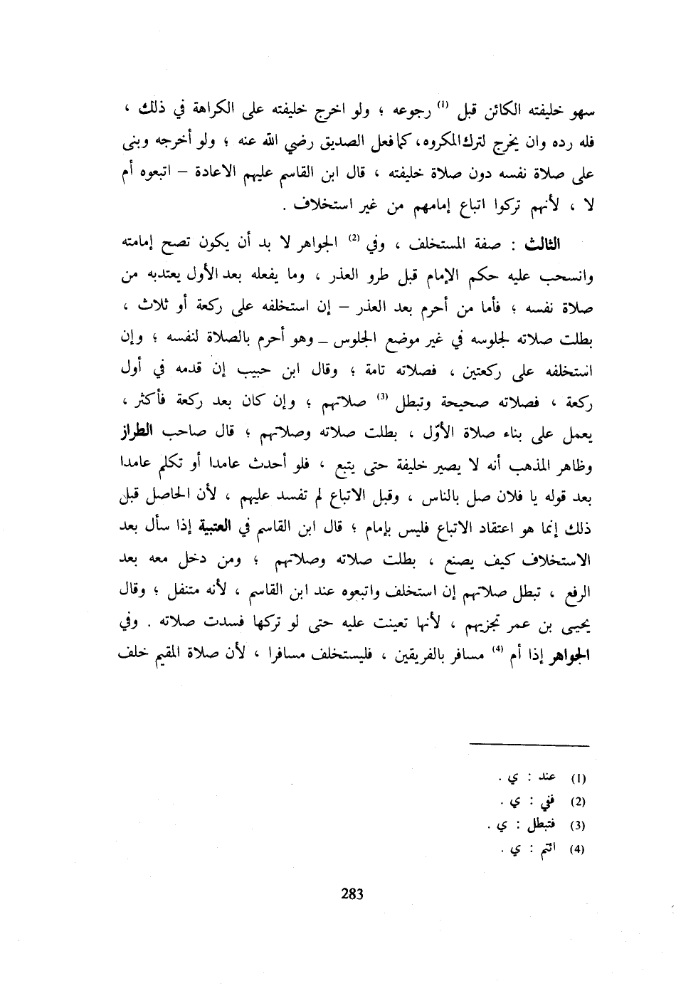 سَهْوُ خَلِيفَتِهِ الْكَائِنِ قَبْلَ رُجُوعِهِ وَلَوْ أَخْرَجَ خَلِيفَتَهُ عَلَى الْكَرَاهَةِ فِي ذَلِكَ فَلَهُ رَدُّهُ وَأَنْ يَخْرُجَ لِتَرْكِ الْمَكْرُوهِ كَمَا فَعَلَ الصِّدِّيقُ رَضِيَ اللَّهُ عَنْهُ وَلَوْ أَخْرَجَهُ وَبَنَى عَلَى صَلَاةِ نَفْسِهِ دُونَ صَلَاةِ خَلِيفَتِهِ قَالَ ابْنُ الْقَاسِمِ عَلَيْهِمُ الْإِعَادَةُ اتَّبَعُوهُ أَمْ لَا لِأَنَّهُمْ تَرَكُوا اتِّبَاعَ إِمَامِهِمْ مِنْ غَيْرِ اسْتِخْلَافٍ الثَّالِثُ صفة الْمُسْتَخْلف وَفِي الْجَوَاهِرِ لَا بُدَّ أَنْ يَكُونَ تَصِحُّ إِمَامَتُهُ وَانْسَحَبَ عَلَيْهِ حُكْمُ الْإِمَامِ قَبْلَ طُرُوِّ الْعُذْرِ وَمَا يَفْعَله بعد الأول يعتدبه مِنْ صَلَاةِ نَفْسِهِ فَأَمَّا مَنْ أَحْرَمَ بَعْدَ الْعُذْرِ إِنِ اسْتَخْلَفَهُ عَلَى رَكْعَةٍ أَوْ ثَلَاثٍ بَطَلَتْ صَلَاتُهُ لِجُلُوسِهِ فِي غَيْرِ مَوْضِعِ الْجُلُوسِ وَهُوَ أَحْرَمَ بِالصَّلَاةِ لِنَفْسِهِ وَإِنِ اسْتَخْلَفَهُ عَلَى رَكْعَتَيْنِ فَصَلَاتُهُ تَامَّةٌ وَقَالَ ابْنُ حَبِيبٍ إِنْ قَدَّمَهُ فِي أَوَّلِ رَكْعَةٍ فَصَلَاتُهُ صَحِيحَةٌ وَتَبْطُلُ صَلَاتُهُمْ وَإِنْ كَانَ بَعْدَ رَكْعَةٍ فَأَكْثَرَ يَعْمَلُ عَلَى بِنَاءِ صَلَاةِ الْأَوَّلِ بَطَلَتْ صَلَاتُهُ وَصَلَاتُهُمْ قَالَ صَاحِبُ الطَّرَّازِ وَظَاهِرُ الْمَذْهَبِ أَنَّهُ لَا يَصِيرُ خَلِيفَةً حَتَّى يَتْبَعَ فَلَوْ أَحْدَثَ عَامِدًا أَوْ تَكَلَّمَ عَامِدًا بَعْدَ قَوْلِهِ يَا فُلَانُ صَلِّ بِالنَّاسِ وَقَبْلَ الِاتِّبَاعِ لَمْ تَفْسُدْ عَلَيْهِمْ لِأَنَّ الْحَاصِلَ قَبْلُ ذَلِكَ إِنَّمَا هُوَ اعْتِقَادُ الِاتِّبَاعِ فَلَيْسَ بِإِمَامٍ قَالَ ابْنُ الْقَاسِمِ فِي الْعُتْبِيَّةِ إِذَا سَأَلَ بَعْدَ الِاسْتِخْلَافِ كَيْفَ يَصْنَعُ بَطَلَتْ صَلَاتُهُ وَصَلَاتُهُمْ وَمَنْ دَخَلَ مَعَهُ بَعْدَ الرَّفْعِ تَبْطُلُ صَلَاتُهُمْ إِنِ اسْتَخْلَفَ وَاتَّبَعُوهُ عِنْدَ ابْنِ الْقَاسِمِ لِأَنَّهُ مُتَنَفِّلٌ وَقَالَ يَحْيَى بْنُ عمر تجزيهم لِأَنَّهَا تَعَيَّنَتْ عَلَيْهِ حَتَّى لَوْ تَرَكَهَا فَسَدَتْ صَلَاتُهُ وَفِي الْجَوَاهِرِ إِذَا أَمَّ مُسَافِرٌ بِالْفَرِيقَيْنِ فَلْيَسْتَخْلِفْ مُسَافِرًا لِأَنَّ صَلَاةَ الْمُقِيمِ خَلَفَ