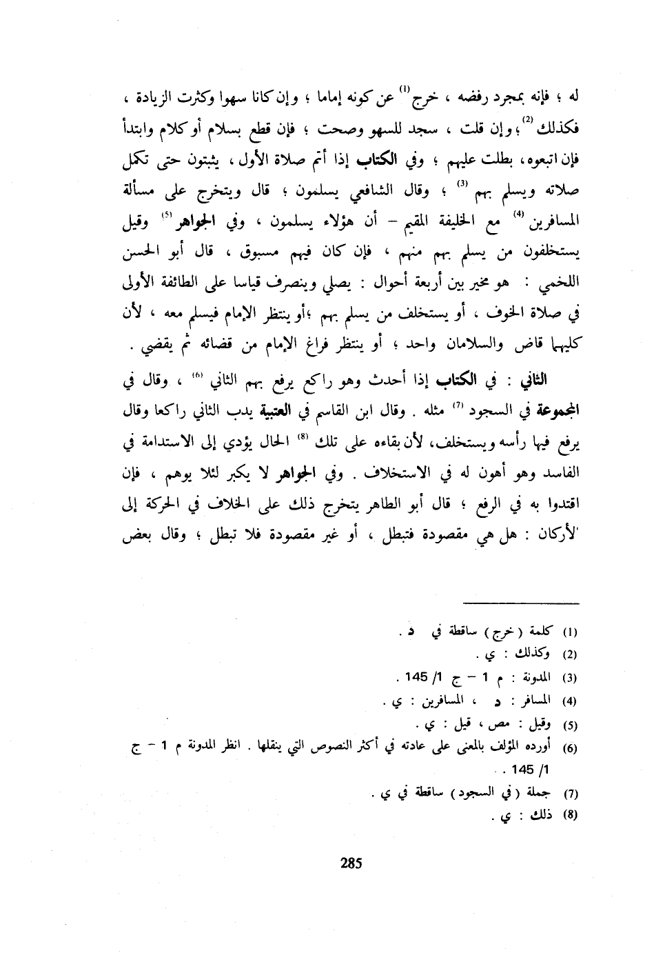 لَهُ فَإِنَّهُ بِمُجَرَّدِ رَفْضِهِ خَرَجَ عَنْ كَوْنِهِ إِمَامًا وَإِنْ كَانَا سَهْوًا وَكَثُرَتِ الزِّيَادَةُ فَكَذَلِكَ وَإِنْ قَلَّتْ سَجَدَ لِلسَّهْوِ وَصَحَّتْ فَإِنْ قَطَعَ بِسَلَامٍ أَوْ كَلَامٍ وَابْتَدَأَ فَإِنِ اتَّبَعُوهُ بَطَلَتْ عَلَيْهِمْ وَفِي الْكِتَابِ إِذَا أَتَمَّ صَلَاةَ الْأَوَّلِ يَثْبُتُونَ حَتَّى تَكْمُلَ صَلَاتُهُ وَيُسَلِّمَ بِهِمْ وَقَالَ الشَّافِعِي يسلمُونَ قَالَ وَيتَخَرَّج على مَسْأَلَة الْمُسَافِرين مَعَ الْخَلِيفَةِ الْمُقِيمِ أَنَّ هَؤُلَاءِ يُسَلِّمُونَ وَفِي الْجَوَاهِرِ وَقِيلَ يَسْتَخْلِفُونَ مَنْ يُسَلِّمُ بِهِمْ مِنْهُمْ فَإِنْ كَانَ فِيهِمْ مَسْبُوقٌ قَالَ أَبُو الْحَسَنِ اللَّخْمِيّ هُوَ مُخَيّر بَين أَرْبَعَة أَحْوَال يُصَلِّي وَيَنْصَرِفُ قِيَاسًا عَلَى الطَّائِفَةِ الْأُولَى فِي صَلَاةِ الْخَوْفِ أَوْ يَسْتَخْلِفُ مَنْ يُسَلِّمُ بِهِمْ أَوْ يَنْتَظِرُ الْإِمَامَ فَيُسَلِّمُ مَعَهُ لِأَنَّ كِلَيْهِمَا قَاضٍ وَالسَّلَامَانِ وَاحِدٌ أَوْ يَنْتَظِرُ فَرَاغَ الْإِمَامِ من قَضَائِهِ ثمَّ يقْضِي الثَّانِي فِي الْكِتَابِ إِذَا أَحْدَثَ وَهُوَ رَاكِعٌ يَرْفَعُ بِهِمُ الثَّانِي وَقَالَ فِي الْمَجْمُوعَةِ فِي السُّجُودِ مِثْلُهُ وَقَالَ ابْنُ الْقَاسِمِ فِي الْعُتْبِيَّةِ يَدِبُّ الثَّانِي رَاكِعًا وَقَالَ يَرْفَعُ فِيهَا رَأْسَهُ وَيَسْتَخْلِفُ لِأَنَّ بَقَاءَهُ عَلَى تِلْكَ الْحَالِ يُؤَدِّي إِلَى الِاسْتِدَامَةِ فِي الْفَاسِدِ وَهُوَ أَهْوَنُ لَهُ فِي الِاسْتِخْلَافِ وَفِي الْجَوَاهِرِ لَا يُكَبِّرُ لِئَلَّا يُوهِمَ فَإِنِ اقْتَدَوْا بِهِ فِي الرَّفْعِ قَالَ أَبُو الطَّاهِرِ يَتَخَرَّجُ ذَلِكَ عَلَى الْخِلَافِ فِي الْحَرَكَةِ إِلَى الْأَرْكَانِ هَلْ هِيَ مَقْصُودَةٌ فَتَبْطُلُ أَوْ غَيْرُ مَقْصُودَةٍ فَلَا تَبْطُلُ وَقَالَ بَعْضُ