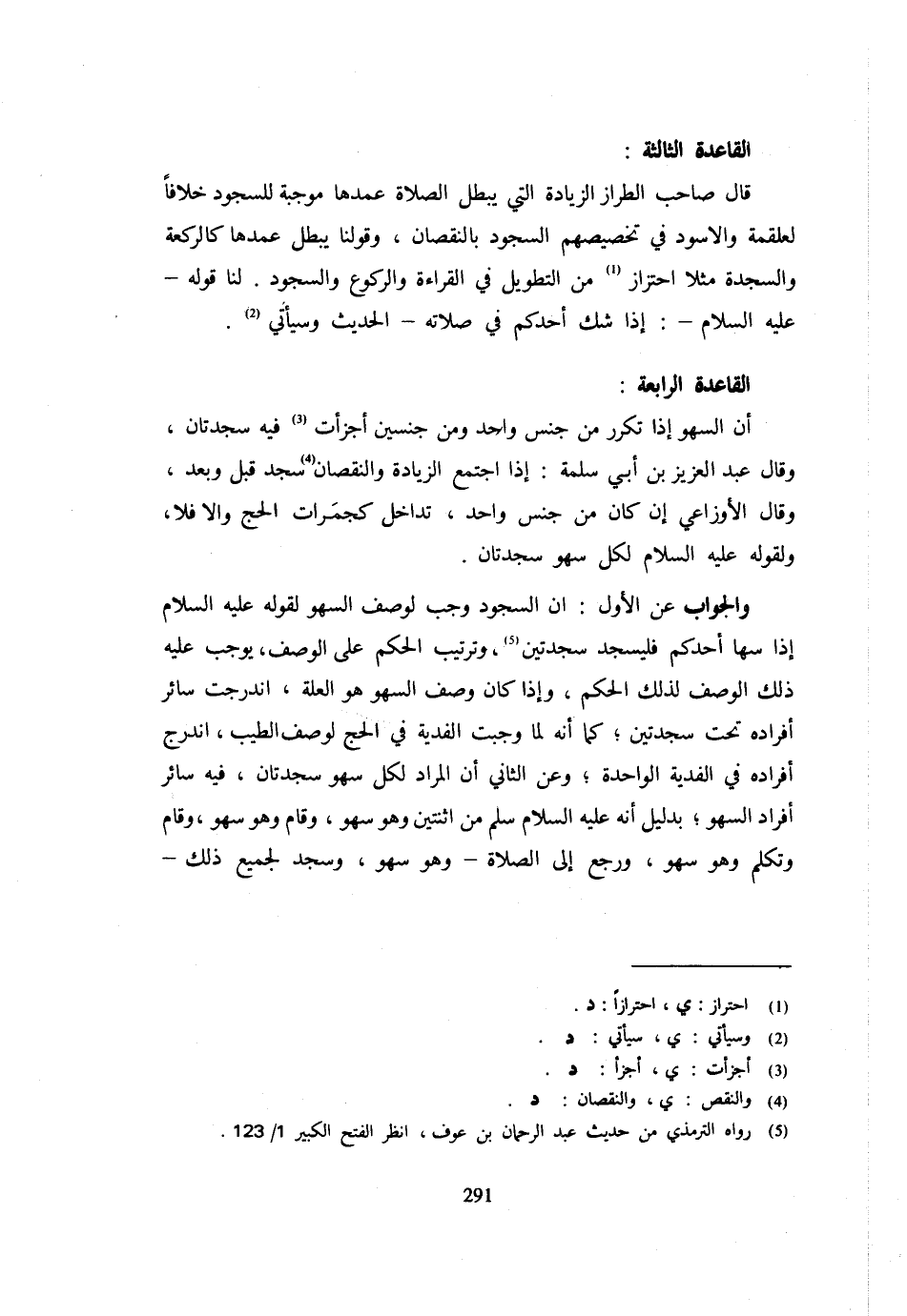 الْقَاعِدَةُ الثَّالِثَةُ قَالَ صَاحِبُ الطَّرَّازِ الزِّيَادَةُ الَّتِي يُبْطِلُ الصَّلَاةَ عَمْدُهَا مُوجِبَةٌ لِلسُّجُودِ خِلَافًا لِعَلْقَمَةَ والاسود فِي تخصيصهم السُّجُود بِالنُّقْصَانِ وَقَوْلنَا يبطل عمدها كَالرَّكْعَةِ وَالسَّجْدَةِ مَثَلًا احْتِرَازٌ مِنَ التَّطْوِيلِ فِي الْقِرَاءَةِ وَالرُّكُوعِ وَالسُّجُودِ لَنَا قَوْلُهُ عَلَيْهِ السَّلَامُ إِذَا شَكَّ أَحَدُكُمْ فِي صَلَاتِهِ الْحَدِيثَ وَسَيَأْتِي الْقَاعِدَةُ الرَّابِعَةُ أَنَّ السَّهْوَ إِذَا تَكَرَّرَ مِنْ جِنْسٍ وَاحِدٍ وَمِنْ جِنْسَيْنِ أَجْزَأَتْ فِيهِ سَجْدَتَانِ وَقَالَ عَبْدُ الْعَزِيزِ بْنُ أَبِي سَلَمَةَ إِذَا اجْتَمَعَ الزِّيَادَةُ وَالنُّقْصَانُ سَجَدَ قَبْلَ وَبَعْدَ وَقَالَ الْأَوْزَاعِيُّ إِنْ كَانَ مِنْ جِنْسٍ وَاحِدٍ تَدَاخَلَ كَجَمَرَاتِ الْحَجِّ وَإِلَّا فَلَا وَلِقَوْلِهِ عَلَيْهِ السَّلَامُ لِكُلِّ سَهْوٍ سَجْدَتَانِ وَالْجَوَابُ عَنِ الْأَوَّلِ أَنَّ السُّجُودَ وَجَبَ لِوَصْفِ السَّهْوِ لِقَوْلِهِ عَلَيْهِ السَّلَامُ إِذا سَهَا أحدكُم فليسجد سَجْدَتَيْنِ وترتيب الْحُكْمِ عَلَى الْوَصْفِ يُوجِبُ عَلَيْهِ ذَلِكَ الْوَصْفَ لِذَلِكَ الْحُكْمِ وَإِذَا كَانَ وَصْفُ السَّهْوِ هُوَ الْعِلَّةُ انْدَرَجَتْ سَائِرُ أَفْرَادِهِ تَحْتَ سَجْدَتَيْنِ كَمَا أَنَّهُ لَمَّا وَجَبَتِ الْفِدْيَةُ فِي الْحَجِّ لِوَصْفِ الطِّيبِ انْدَرَجَ أَفْرَادُهُ فِي الْفِدْيَةِ الْوَاحِدَةِ وَعَنِ الثَّانِي أَن المُرَاد لكل سَهْو سَجْدَتَانِ فِيهِ سَائِرَ أَفْرَادِ السَّهْوِ بِدَلِيلِ أَنَّهُ عَلَيْهِ السَّلَامُ سَلَّمَ مِنِ اثْنَتَيْنِ وَهُوَ سَهْوٌ وَقَامَ وَهُوَ سَهْوٌ وَقَامَ وَتَكَلَّمَ وَهُوَ سَهْوٌ وَرَجَعَ إِلَى الصَّلَاةِ وَهُوَ سَهْوٌ وَسَجَدَ لِجَمِيعِ ذَلِكَ