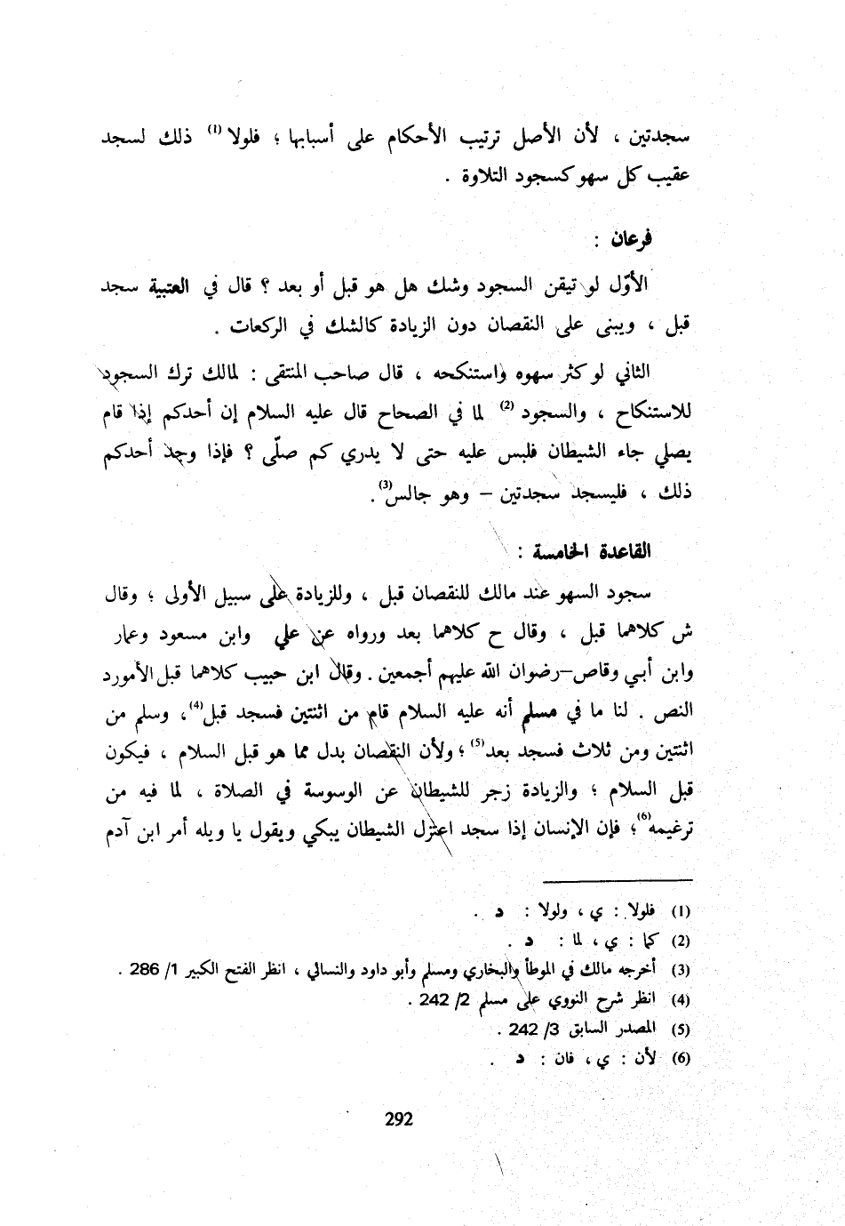 سَجْدَتَيْنِ لِأَنَّ الْأَصْلَ تَرْتِيبَ الْأَحْكَامِ عَلَى أَسْبَابِهَا فلولا ذَلِكَ لَسَجَدَ عَقِيبَ كُلِّ سَهْوٍ كَسُجُودِ التِّلَاوَةِ فرعان الْأَوَّلُ لَوْ تَيَقَّنَ السُّجُودَ وَشَكَّ هَلْ هُوَ قَبْلُ أَوْ بَعْدُ؟ قَالَ فِي الْعُتْبِيَّةِ سَجَدَ قَبْلُ وَيَبْنِي عَلَى النُّقْصَانِ دُونَ الزِّيَادَةِ كَالشَّكِّ فِي الرَّكْعَات الثَّانِي لوكثر سَهْوُهُ وَاسْتَنْكَحَهُ قَالَ صَاحِبُ الْمُنْتَقَى لِمَالِكٍ تَرْكُ السُّجُودِ لِلِاسْتِنْكَاحِ وَالسُّجُودُ لِمَا فِي الصِّحَاحِ قَالَ عَلَيْهِ السَّلَامُ إِنَّ أَحَدَكُمْ إِذَا قَامَ يُصَلِّي جَاءَ الشَّيْطَانُ فَلَبَّسَ عَلَيْهِ حَتَّى لَا يَدْرِيَ كَمْ صَلَّى؟ فَإِذَا وَجَدَ أَحَدُكُمْ ذَلِكَ فَلْيَسْجُدْ سَجْدَتَيْنِ وَهُوَ جَالِسٌ الْقَاعِدَةُ الْخَامِسَةُ سُجُودُ السَّهْوِ عِنْد الْمَالِك للنقصان قبل وللزيادة على سَبِيل الأولى وَقَالَ ش كِلَاهُمَا قَبْلُ وَقَالَ ح كِلَاهُمَا بَعْدُ وَرَوَاهُ عَنْ عَلِيٍّ وَابْنِ مَسْعُودٍ وَعَمَّارٍ وَابْنِ أَبِي وَقَّاصٍ رِضْوَانُ اللَّهِ عَلَيْهِمْ أَجْمَعِينَ وَقَالَ ابْن حبيب كِلَاهُمَا قبل الأمورد النَّصِّ لَنَا مَا فِي مُسْلِمٍ أَنَّهُ عَلَيْهِ السَّلَامُ قَامَ مِنِ اثْنَتَيْنِ فَسَجَدَ قَبْلُ وَسَلَّمَ مِنِ اثْنَتَيْنِ وَمِنْ ثَلَاثٍ فَسَجَدَ بَعْدُ وَلِأَنَّ النُّقْصَانَ بَدَلٌ مِمَّا هُوَ قَبْلَ السَّلَامِ فَيَكُونُ قَبْلَ السَّلَامِ وَالزِّيَادَةُ زَجْرٌ لِلشَّيْطَانِ عَنِ الْوَسْوَسَةِ فِي الصَّلَاةِ لِمَا فِيهِ مِنْ تَرْغِيمِهِ فَإِنَّ الْإِنْسَانَ إِذَا سَجَدَ اعْتَزَلَ الشَّيْطَانُ يَبْكِي وَيَقُولُ يَا وَيْلَهْ أُمِرَ ابْنُ آدَمَ