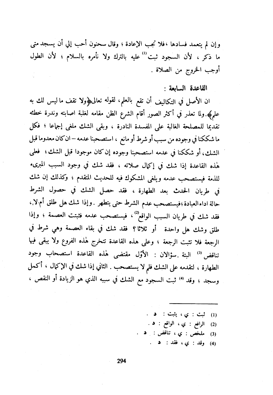 وَإِن لم يعْتَمد فَسَادَهَا فَلَا تَجِبُ الْإِعَادَةُ وَقَالَ سَحْنُونٌ أَحَبُّ إِلَيَّ أَنْ يَسْجُدَ مَتَى مَا ذَكَرَ لِأَنَّ السُّجُود ثَبت عَلَيْهِ بِالتَّرْكِ وَلَا نَأْمُرُهُ بِالسَّلَامِ لِأَنَّ الطُّولَ أَوْجَبَ الْخُرُوجَ مِنَ الصَّلَاةِ الْقَاعِدَةُ السَّابِعَةُ أَنَّ الْأَصْلَ فِي التَّكَالِيفِ أَنْ تَقَعَ بِالْعِلْمِ لِقَوْلِهِ تَعَالَى {وَلا تَقْفُ مَا لَيْسَ لَكَ بِهِ علم} وَلَمَّا تَعَذَّرَ فِي أَكْثَرِ الصُّوَرِ أَقَامَ الشَّرْعُ الظَّنَّ مَقَامَهُ لِغَلَبَةِ إِصَابَتِهِ وَنُدْرَةِ خَطَئِهِ تَقْدِيمًا لِلْمَصْلَحَةِ الْغَالِبَةِ عَلَى الْمَفْسَدَةِ النَّادِرَةِ وَبَقِيَ الشَّكُّ مُلْغًى إِجْمَاعًا فَكُلُّ مَا شَكَكْنَا فِي وُجُودِهِ مِنْ سَبَبٍ أَوْ شَرْطٍ أَوْ مَانِعٍ اسْتَصْحَبْنَا عَدَمَهُ إِنْ كَانَ مَعْدُومًا قَبْلَ الشَّكِّ أَوْ شَكَكْنَا فِي عَدَمِهِ اسْتَصْحَبْنَا وُجُوَدَهُ إِنْ كَانَ مَوْجُودًا قَبْلَ الشَّكِّ فَعَلَى هَذِهِ الْقَاعِدَةِ إِذَا شَكَّ فِي إِكْمَالِ صَلَاتِهِ فَقَدْ شَكَّ فِي وُجُودِ السَّبَبِ الْمُبَرِّئِ لِلذِّمَّةِ فَيَسْتَصْحِبُ عَدَمَهُ وَيُلْغِي الْمَشْكُوكُ فِيهِ لِلْحَدِيثِ الْمُتَقَدِّمِ وَكَذَلِكَ إِنْ شَكَّ فِي طريان الْحَدَثِ بَعْدَ الطَّهَارَةِ فَقَدْ حَصَلَ الشَّكُّ فِي حُصُولِ الشَّرْطِ حَالَةَ أَدَاءِ الْعِبَادَةِ فَيَسْتَصْحِبُ عَدَمَ الشَّرْطِ حَتَّى يَتَطَهَّرَ وَإِذَا شَكَّ هَلْ طَلَّقَ أم لَا فقد شكّ فِي طريان السَّبَبِ الْوَاقِعِ فَيَسْتَصْحِبُ عَدَمَهُ فَتَثْبُتُ الْعِصْمَةَ وَإِذَا طَلَّقَ وَشَكَّ هَلْ وَاحِدَةً أَوْ ثَلَاثًا؟ فَقَدْ شَكَّ فِي بَقَاءِ الْعِصْمَةِ وَهِيَ شَرْطٌ فِي الرَّجْعَةِ فَلَا تَثْبُتُ الرَّجْعَةُ وَعَلَى هَذِهِ الْقَاعِدَةِ تَتَخَرَّجُ هَذِهِ الْفُرُوعُ وَلَا يَبْقَى فِيهَا تَنَاقُضٌ ألْبَتَّةَ سُؤَالَانِ الْأَوَّلُ مُقْتَضَى هَذِهِ الْقَاعِدَةِ اسْتِصْحَابُ وجود الطَّهَارَة لتقدمه على الشَّك فَلم يَسْتَصْحِبُ الثَّانِي إِذَا شَكَّ فِي الْإِكْمَالِ أَكْمَلَ وَسَجَدَ وَقَدْ ثَبَتَ السُّجُودُ مَعَ الشَّكِّ فِي سَبَبِهِ الَّذِي هُوَ الزِّيَادَةُ أَوِ النَّقْصُ