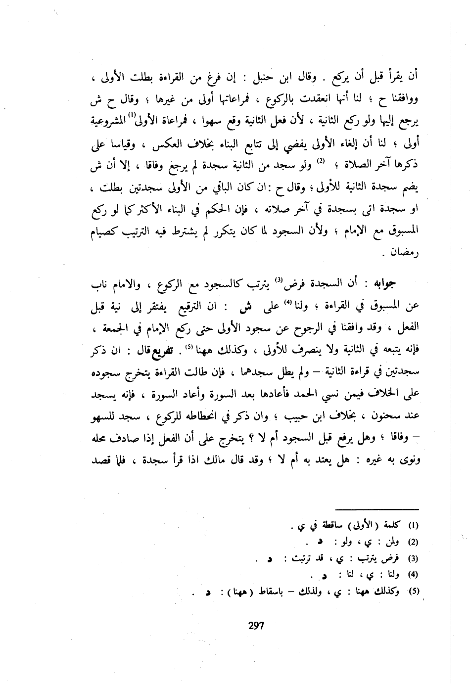أَنْ يَقْرَأَ قَبْلَ أَنْ يَرْكَعَ وَقَالَ ابْنُ حَنْبَلٍ إِنْ فَرَغَ مِنَ الْقِرَاءَةِ بَطَلَتِ الْأُولَى وَوَافَقْنَا ح لَنَا أَنَّهَا انْعَقَدَتْ بِالرُّكُوعِ فَمُرَاعَاتُهَا أولى من غَيرهَا وَقَالَ ح وش يَرْجِعُ إِلَيْهَا وَلَوْ رَكَعَ الثَّانِيَةَ لِأَنَّ فِعْلَ الثَّانِيَة وَقع سَهوا فمراعاة الأولى المشروعية أولى لَنَا أَنَّ إِلْغَاءَ الْأُولَى يُفْضِي إِلَى تَتَابُعِ الْبِنَاءِ بِخِلَافِ الْعَكْسِ وَقِيَاسًا عَلَى ذِكْرِهَا آخِرَ الصَّلَاةِ وَلَوْ سَجَدَ مِنَ الثَّانِيَةِ سَجْدَةً لَمْ يَرْجِعْ وِفَاقًا إِلَّا أَنَّ ش يَضُمُّ سَجْدَةَ الثَّانِيَةِ لِلْأُولَى وَقَالَ ح إِنْ كَانَ الْبَاقِي مِنَ الْأُولَى سَجْدَتَيْنِ بَطَلَتْ أَوْ سَجْدَةً أَتَى بِسَجْدَة فِي آخر صلَاته فَإِنَّ الْحُكْمَ فِي الْبِنَاءِ الْأَكْثَرِ كَمَا لَوْ رَكَعَ الْمَسْبُوقُ مَعَ الْإِمَامِ وَلِأَنَّ السُّجُودَ لَمَّا كَانَ يَتَكَرَّرُ لَمْ يُشْتَرَطْ فِيهِ التَّرْتِيبُ كَصِيَامِ رَمَضَان جَوَابه أَن السَّجْدَة فرض يَتَرَتَّب كَالسُّجُودِ مَعَ الرُّكُوعِ وَالْإِمَامُ نَابَ عَنِ الْمَسْبُوقِ فِي الْقِرَاءَة وَلنَا عَلَى ش أَنَّ التَّرْقِيعَ يَفْتَقِرُ إِلَى نِيَّةٍ قبل الْفِعْل وَقد وَافَقنَا فِي الرجوح عَنْ سُجُودِ الْأُولَى حَتَّى رَكَعَ الْإِمَامُ فِي الْجُمُعَةِ فَإِنَّهُ يَتْبَعُهُ فِي الثَّانِيَةِ وَلَا يَنْصَرِفُ للأولى وَكَذَلِكَ هَهُنَا تَفْرِيعٌ قَالَ إِنْ ذَكَرَ سَجْدَتَيْنِ فِي قِرَاءَةِ الثَّانِيَةِ وَلَمْ يُطِلْ سَجَدَهُمَا فَإِنْ طَالَتِ الْقِرَاءَةُ يَتَخَرَّجُ سُجُودُهُ عَلَى الْخِلَافِ فِيمَنْ نَسِيَ الْحَمْدَ فَأَعَادَهَا بَعْدَ السُّورَةِ وَأَعَادَ السُّورَةَ فَإِنَّهُ يَسْجُدُ عِنْدَ سَحْنُونٍ بِخِلَافِ ابْنِ حَبِيبٍ وَإِنْ ذَكَرَ فِي انْحِطَاطِهِ لِلرُّكُوعِ سَجَدَ لِلسَّهْوِ وِفَاقًا وَهَلْ يَرْفَعُ قَبْلَ السُّجُودِ أَمْ لَا؟ يَتَخَرَّجُ عَلَى أَنَّ الْفِعْلَ إِذَا صَادَفَ مَحِلَّهُ وَنَوَى بِهِ غَيْرَهُ هَلْ يَعْتَدُّ بِهِ أَمْ لَا وَقَدْ قَالَ مَالِكٌ إِذَا قَرَأَ سَجْدَةً فَلَمَّا قَصَدَ